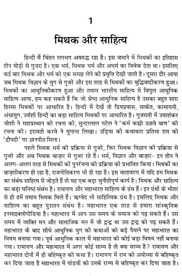 मिथक से तात्पर्य हिन्दी साहित्य में प्रचलित धर्मगाथा से है, लेकिन सिर्फ धर्मगाथा ही नहीं यह शब्द मानस की अवचेतन प्रक्रियाओं और धारणाओं को व्याख्यायित करता है। मिथक के स्वरूप, उसकी सर्जना को लेकर अनेक मत हैं। मानव विज्ञान, समाज विज्ञान एवं मनोविज्ञान के विद्वान अपने मतों के आधार पर इसकी व्याख्या करते हैं लेकिन इतना तो स्पष्ट है कि मिथक का अटूट सम्बन्ध जातीय संस्कृति एवं सभ्यता के विकास के साथ होता है तथा इसका प्रभाव अवचेतन में बहुत गहराई में रहता है। यही कारण है कि सुदूर अतीत का मिथक बिल्कुल बदली हुई परिस्थितियों में भी रचनाकार की रचना प्रक्रिया में चुपचाप चला आता है और एक नये अर्थ और कलेवर में संचरण कर जाता है। यही कारण है कि आधुनिक रचनाकार बदली हुई परिस्थितियों, बदली हुई वैचारिकी के बीच भी जब अपने समय को पहचानने की कोशिश करता है तो मिथक अवचेतन से बाहर आकर उसे उसके समय से साक्षात्कार करा देता है।