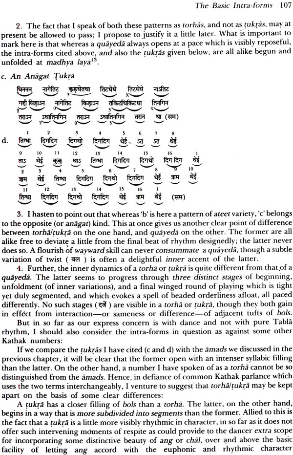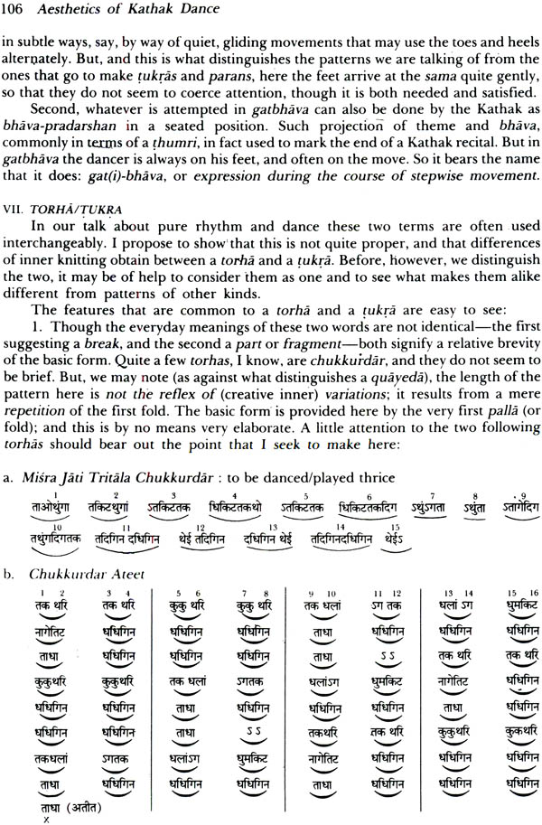 My task in this book is clearly multiple. I seek, first to fix the meanings of such common Kathak terms as ang, mukhvilas and bol ka dharma; second, to determine the nature of the standard Kathak numbers like thata, amad, gatbhava and tatkar, thirdly, though often without notice, to seize in words the more important details of the our actual experience of Kathak; fourthly, to reflect on some problems of philosophical aesthetics including one or two that dominate the Western scene today; and, finally, to ponder over ways to improve presentation of Kathak, and to add to its usual repertoire. Some principles that determine syllabic integration and creation of music for Kathak have also been explained, though my treatment of these is clearly sketchy.