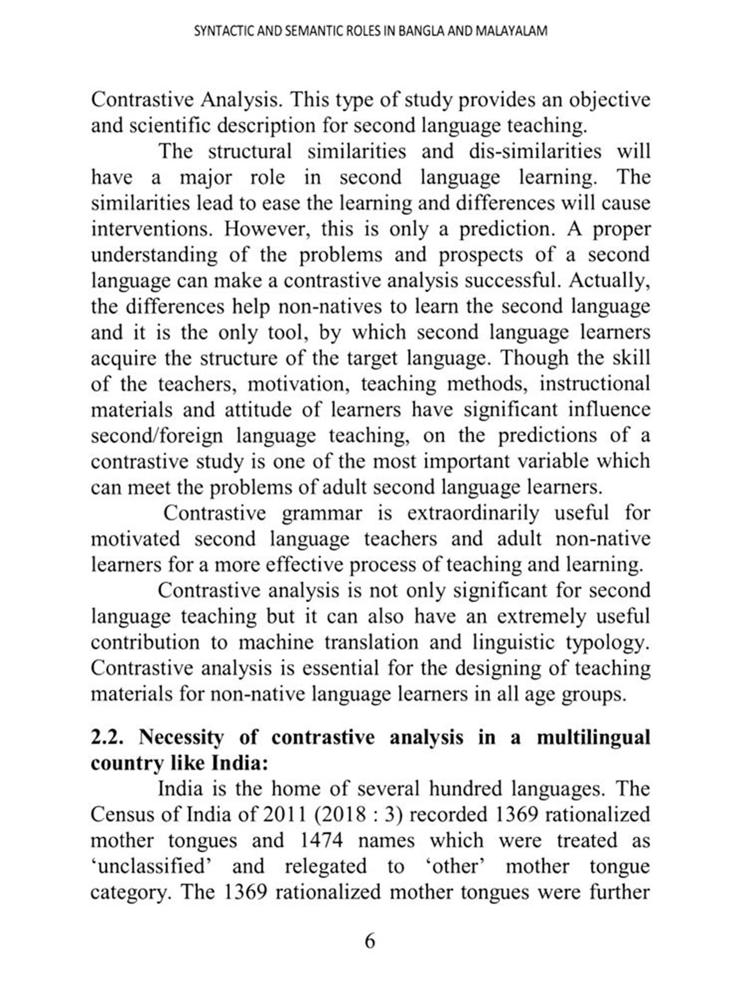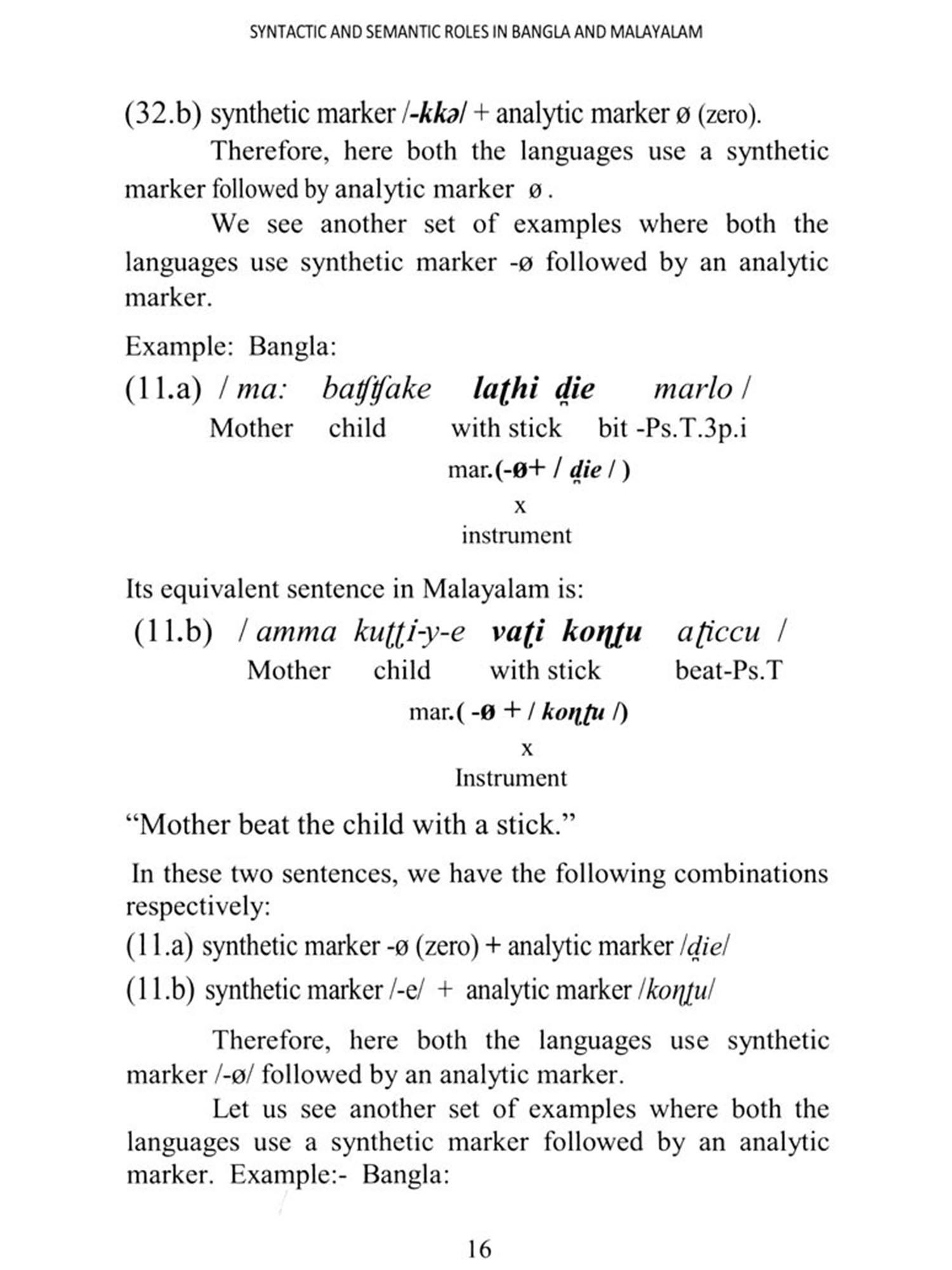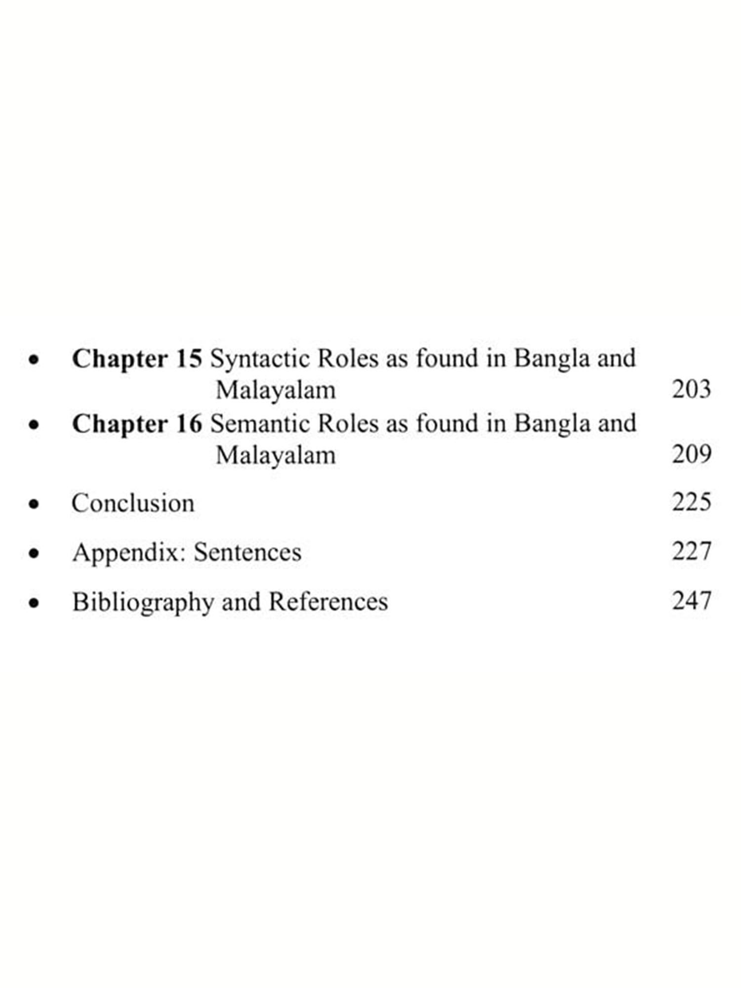 This monograph is the result of my research work of the last three years in the Bengali Unit of International School of Dravidian Linguistics, Thiruvananthapuram. It is also a product of my last nine-year experience of teaching Bangla language to Malayalam and Tamil native speakers in Kerala. All these 9 years of experiences of language learning and language teaching to non-native speakers have pointed out the problems of non-native learners and have encouraged me to do the work of connecting and contrasting the phonological, morpho-syntactical system of Bangla with that of Malayalam. This is very important job to make it easy to a non-native learner. In 2013-14, I did the work of connecting and contrasting the phonological systems of Bangla and Malayalam. This is an attempt in the morpho-syntactical area. The Syntactic and Semantic Roles expressed by the synthetic and analytic markers of these two languages have been attempted to be explored and compared in this monograph.