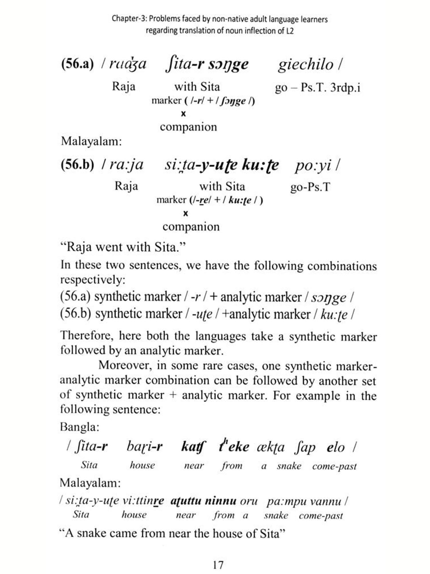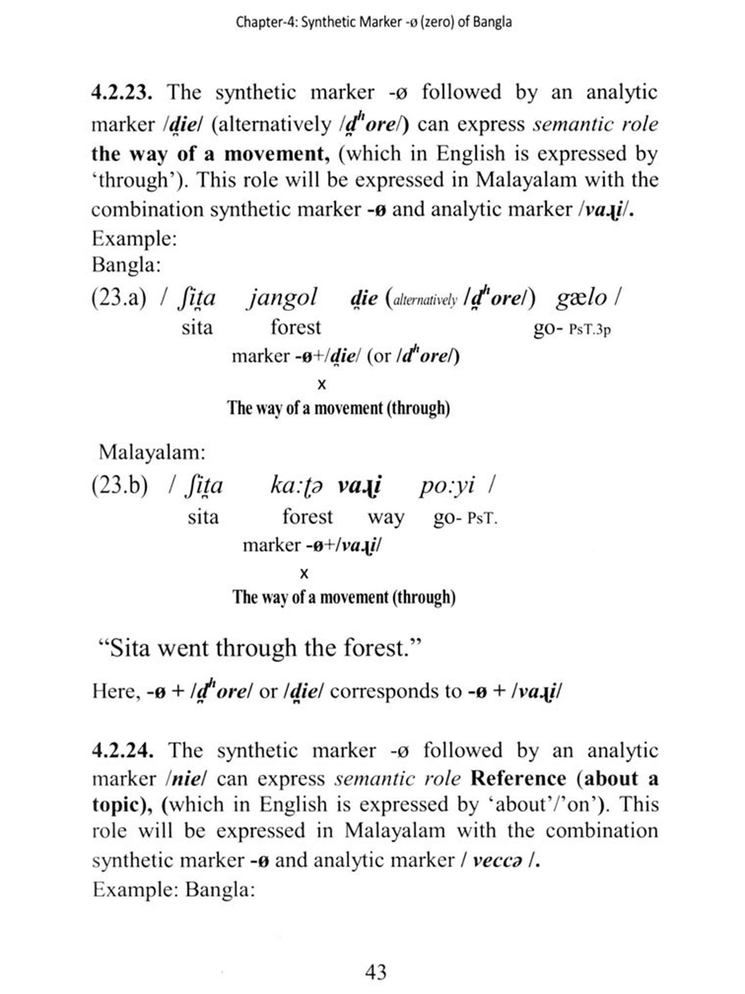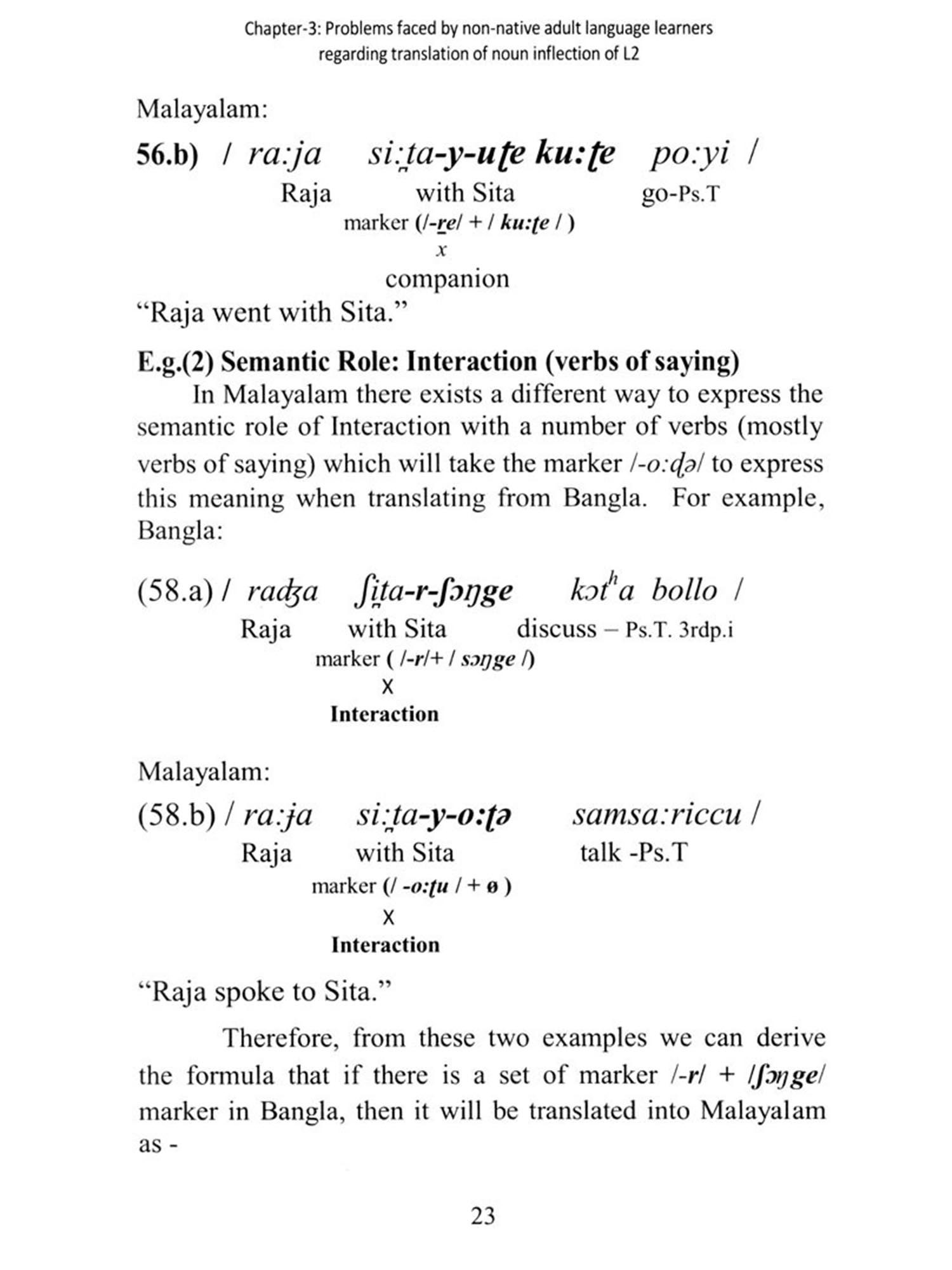 Whenever it is necessary, some references written in Bengali or Malayalam are consulted. As the monograph deals with the standard colloquial varieties of both the languages, only phonemic transcription is given. No transliteration is given to avoid confusion in non-native learner's mind. Malayalam native speakers cannot read Bangla examples properly from transliterated text, because in Bangla, the sound-script controversy is too wide. That controversy exists in Malayalam also. Moreover, some sounds of Malayalam are not there in Bangla. Hence, Bangla native speakers cannot read Malayalam examples properly from transliterated text; they don't even have the concept of length difference in vowels of Malayalam not its phonemic differences. Therefore, in this book, only phonemic transcription is given to show examples in both the languages.