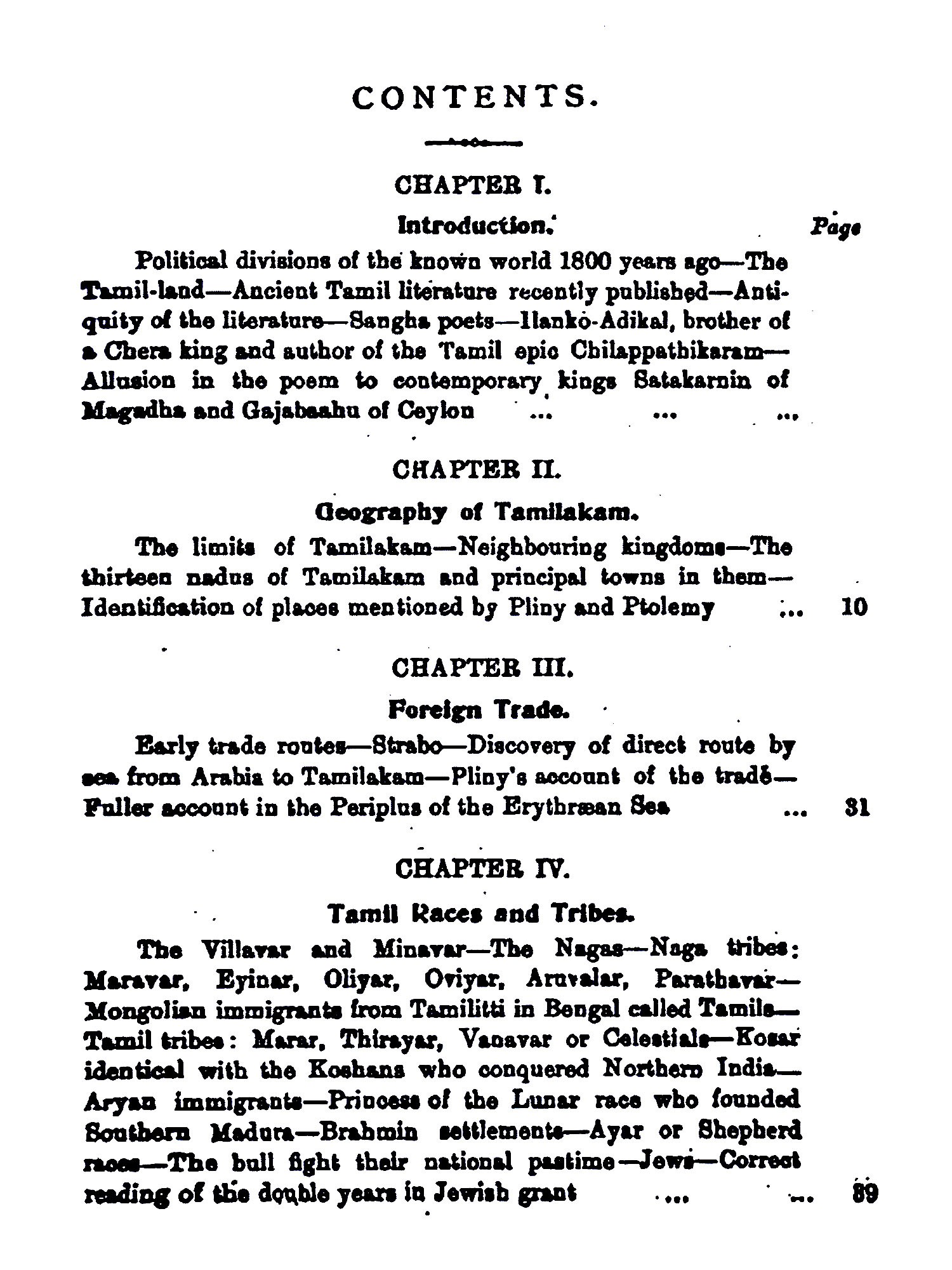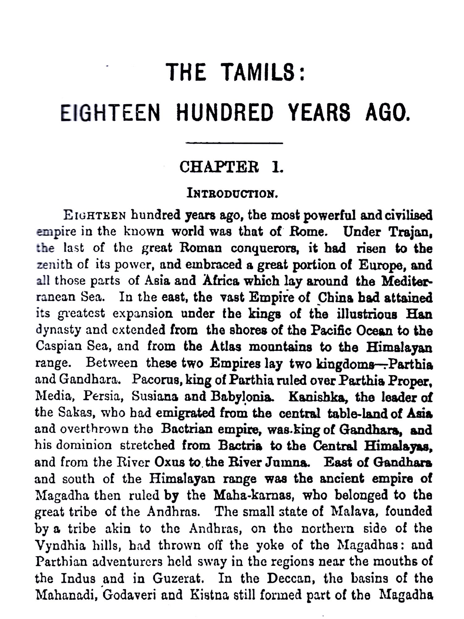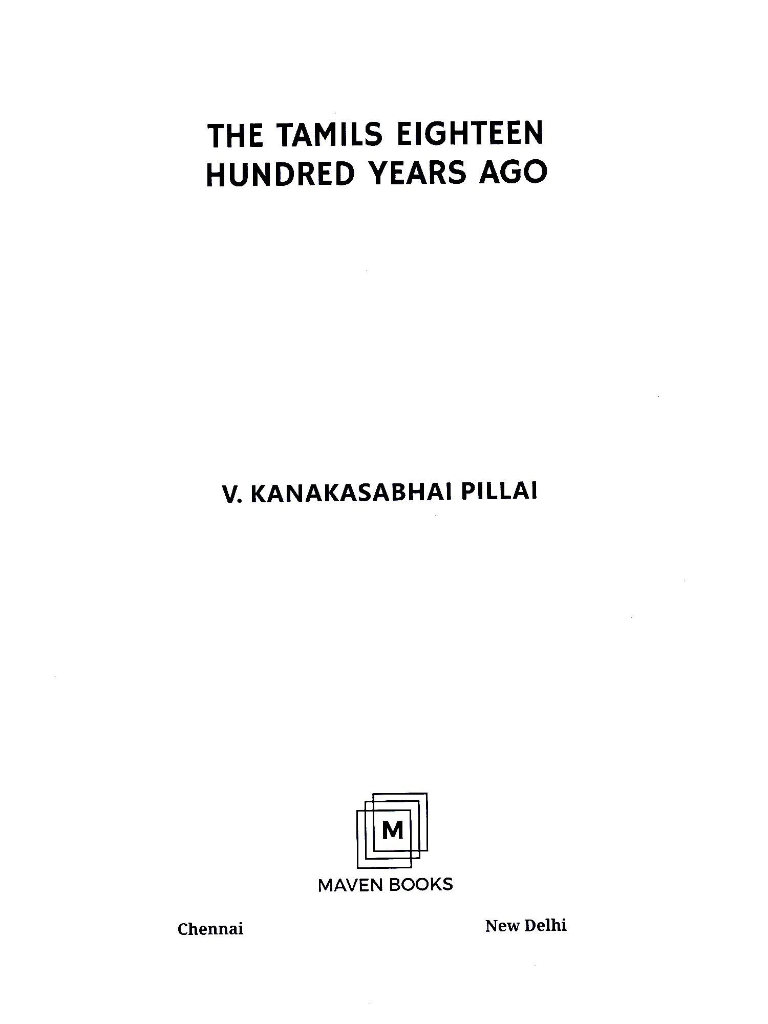 A series of articles on the "Tamils Eighteen Hundred Years Ago" was contributed by me to the Madras Review between the years 1895 and 1901. On the appearance of the very first article, Sir 8. SUBRAMANYA IYER wrote to me suggesting that I should bring out all the information available in Tamil literature regard-ing the ancient civilization of the Tamils. I believe I have carried out the suggestion faithfully, as far as my leisure would permit. Since the completion of the series, many of my friends advised me to collect and publish the whole in the form of a book. I have therefore re-arranged the matter, dividing it into chapters, and added an Index, which I hope will facilitate reference. With a view to confine myself strictly to the subject of the book as shown in the title, I have carefully avoided touching upon the history of the Tamils before A.D. 50 or after A.D. 150