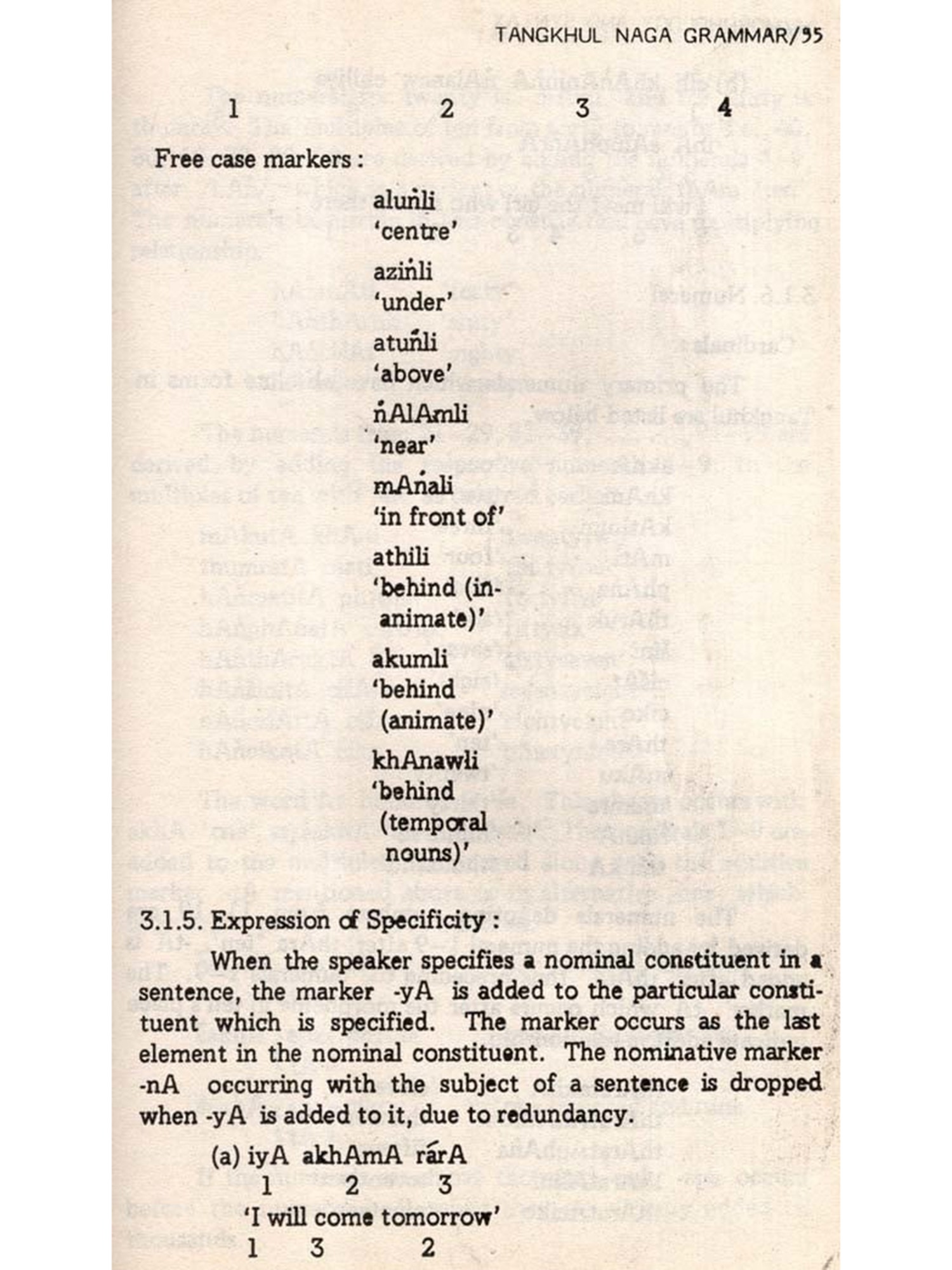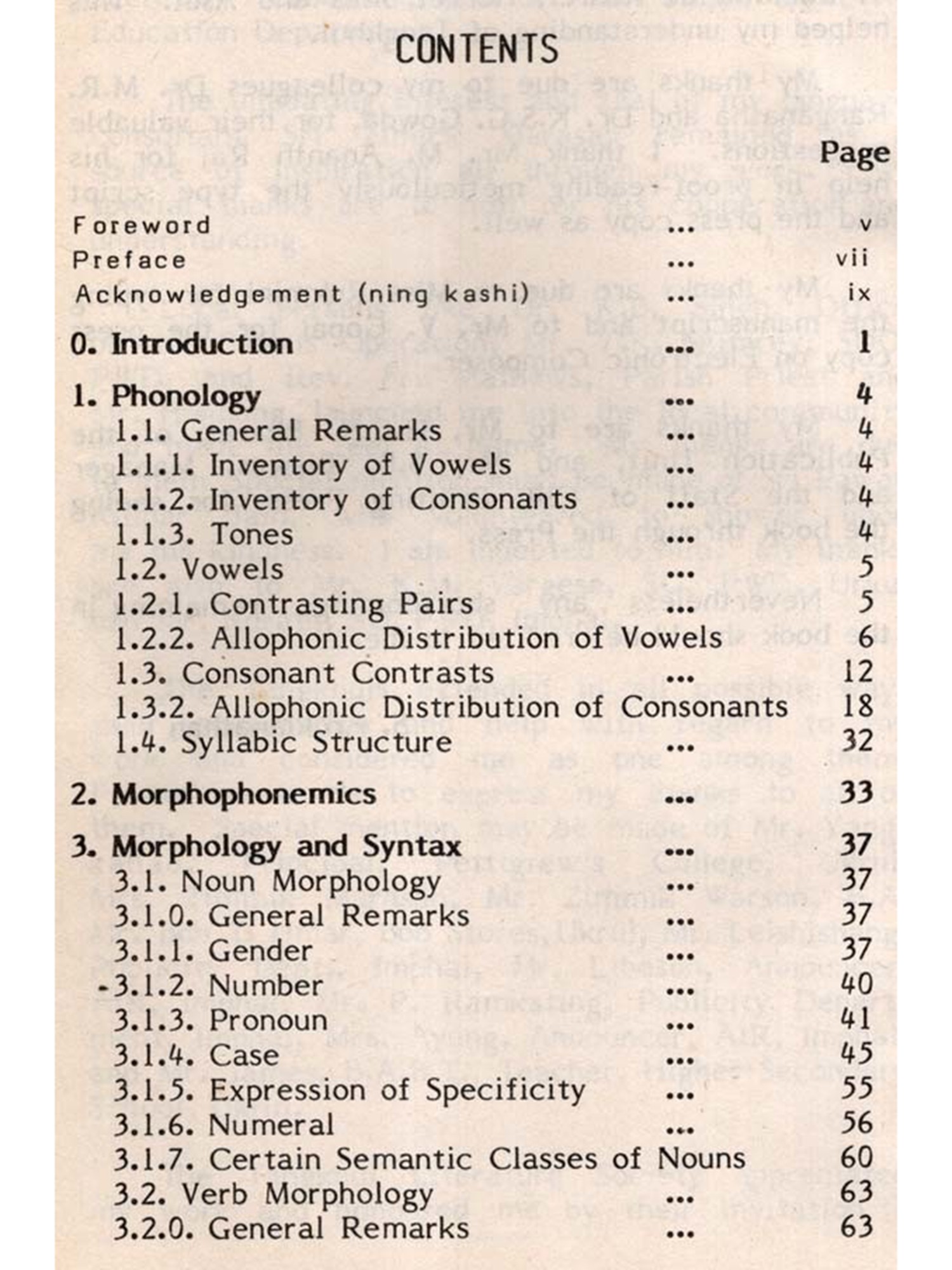 The tribal people in India have for long lived in isolation except to be exposed for exploitation. They have not participated to their benefit in the socioeconomic development of the country. To come out of their isolation, it is necessary for them to learn the language of the majority people around them and a number of them have done so. But this bridges the communication gap only in one way and the whole burden of building up this bridge is carried by the minority group. It is necessary, however, for developing mutual understanding and good-will, to increase bidirectional communication between the tribal people and the majority people of the region. For this purpose, the majority people, especially those who come into contact with the tribal people for various reasons such as civil administration, security, social service, trade, etc., should learn their language. The Grammar, which forms part of the package consisting of phonetic reader, bi- or tri-lingual dictionary and teaching manual is prepared to help them in their learning of the tribal language.