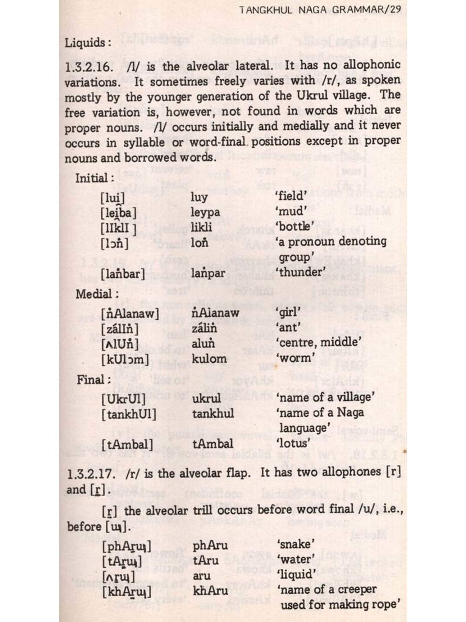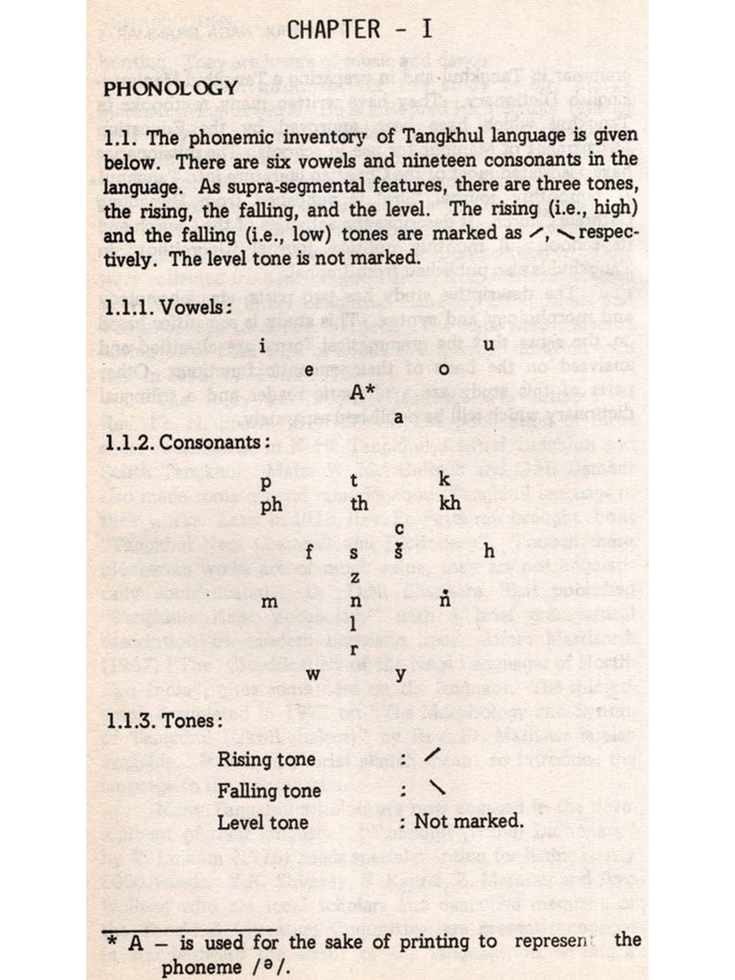 Tangkhul, phonemically /tankhul/, belongs to the Naga sub-group of the Tibeto-Burman sub-family. It is spoken by Tangkhul Nagas numbering about 618981. The Tangkhuls are Mangoloids and they are well built and tall. Their population is concentrated in the east district of Manipur spread over 1823 sq. miles of hill ranges. The Tangkhul Nagas live on the hills. There are 219 Tangkhul villages in the district. This district has nearly six villages of Kuki speakers also. This district is bounded in the North by the Mao hills of Manipur State and Nagaland, in the South by the Sadar hills and Imphal, the capital of Manipur and in the East by the Kabo valley of Burma and in the West by Tengnoupal hills.