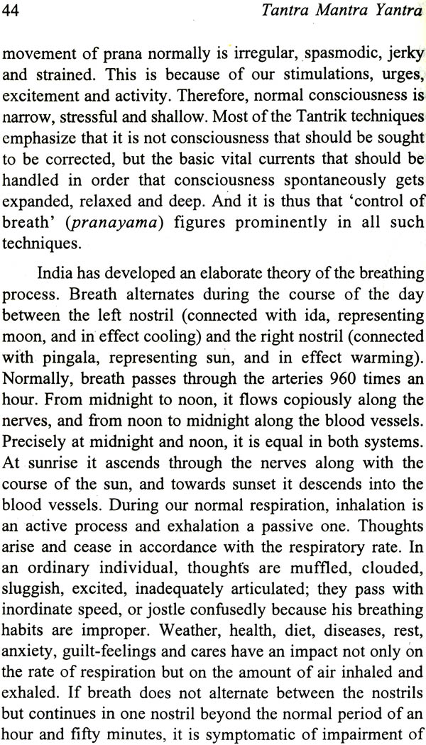 Tantra is not to be construed as a collection of mystic cults holding unusual ideas; it is a simple, serious, sober and realistic philosophy of life, which takes into consideration our normal impulses and aspirations. Samkhya-Yoga, Ayurveda and the early Upanishadic texts more truly represent the Tantrik tradition than all the mystifying cults that commonly go by that name. in fact, regulated but effective living, eschewing excesses, was the basic Tantrik outlook. Preservation of health, acquisition of power to live effectively, and safeguarding of the community from individual aggression were the three objectives that were invariably emphasized. Control of breathing was meant to secure the first two objectives, and control of impulses, especially the sexual, took care of the third. There was considerable experimentation and theorizing before the methods were stylized and set as norms. The employment of medicinal and psychedelic drugs, alchemical techniques, and attempts at sex-sublimation were included in the experimentation.