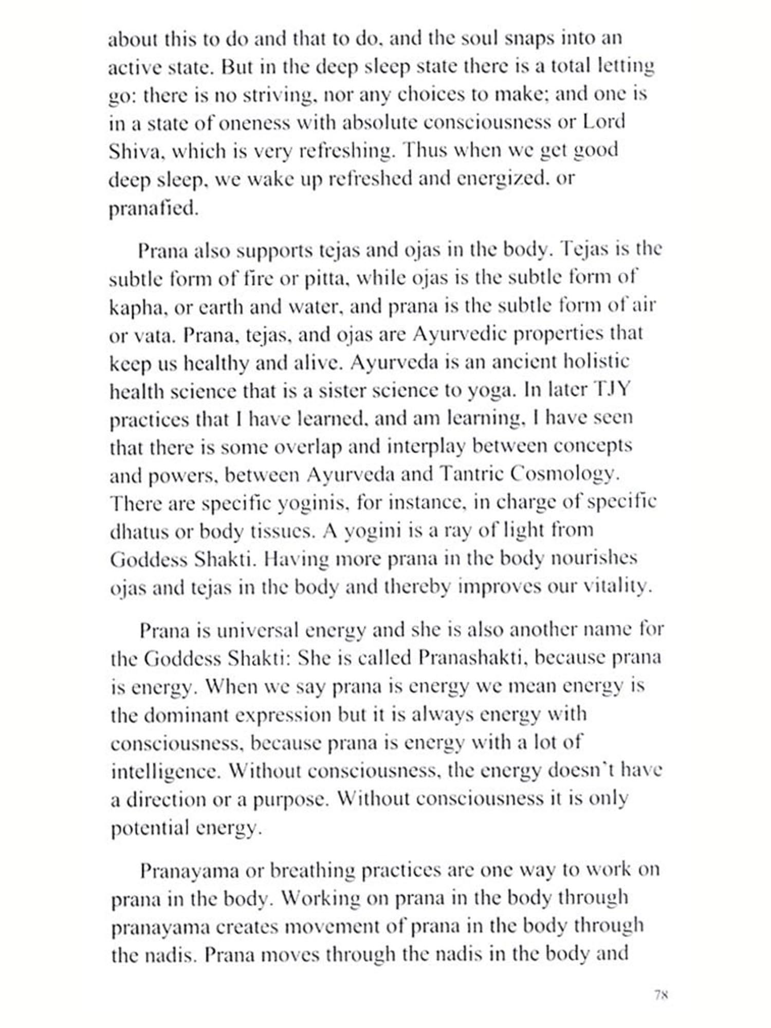 In Chapters Three and Four, I take the reader on an exploration of the concepts of kundalini and prana, which are forces within us that we strive to activate in Tantric Japa Yoga. Having a deeper understanding of these concepts and how they fit into the big picture, can help us understand and make sense of our practice and its effectiveness in our lives.