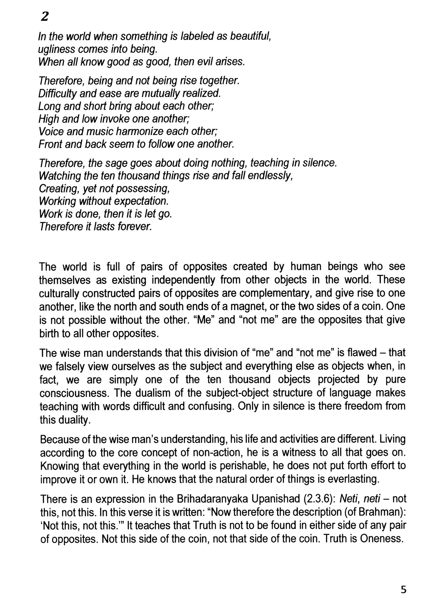 I also learned how the teaching of Tao could be traced back to the Bhagavad Gita, which teaches the path of karma (action). The philosophy of Tao describes wei (action) and wu wei (non-action). Wei wu wei is to act with non-action. In every action the soul should be perceived as our real identity that brings the state of non-action into our lives.
