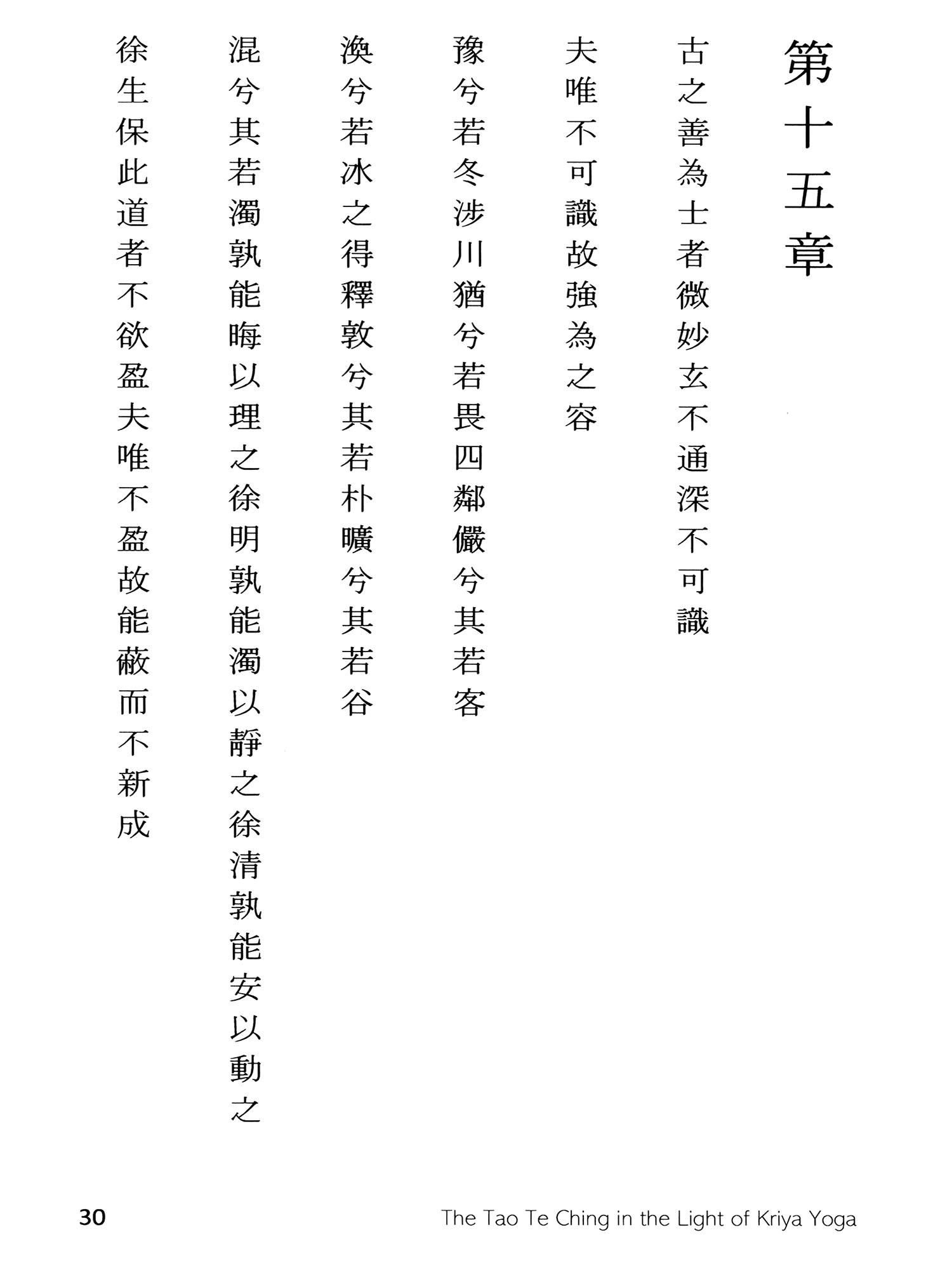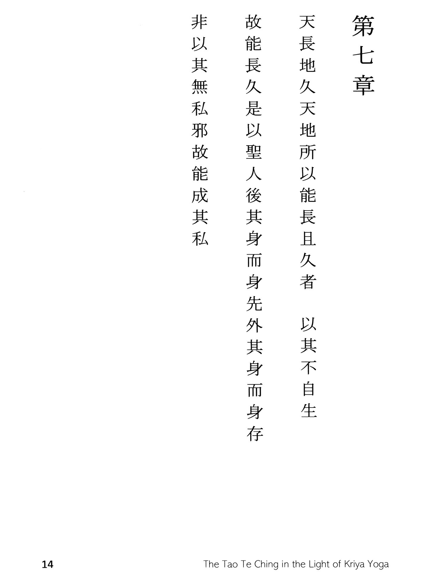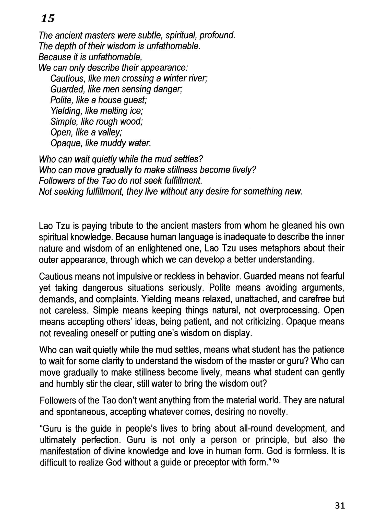 For a long time she has been influenced by the original text of the Tao Te Ching, and she has wished to see a book containing its explanation. She never thought that God and the gurus would want this work to be accomplished by her, even during a period of her physical suffering. I had the opportunity to glimpse this book in its manuscript form.