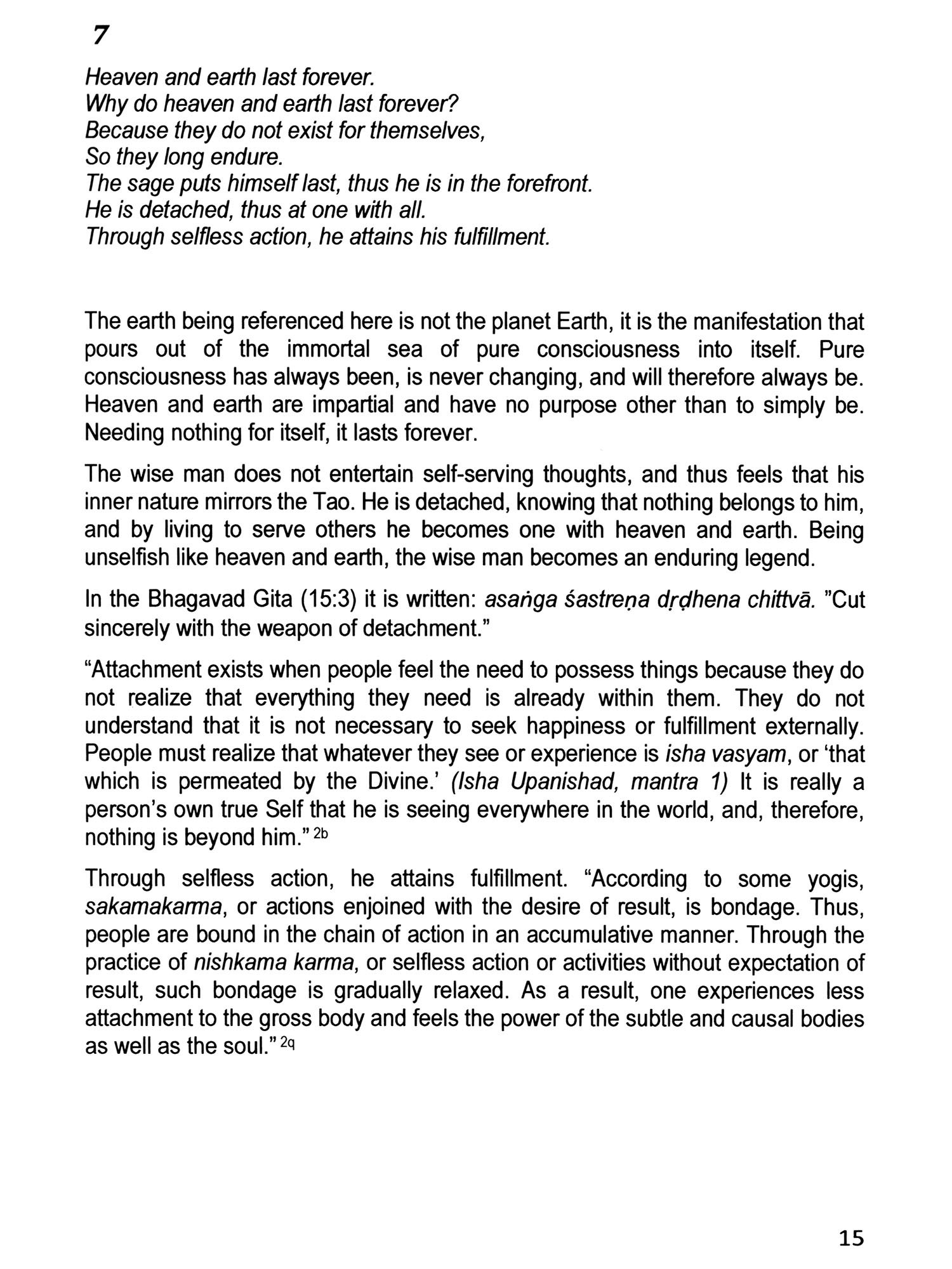 Verse 16 describes how to make oneself truly divine. She writes, "Emptying yourself of everything implies disassociation from the body and re-identification as pure consciousness."