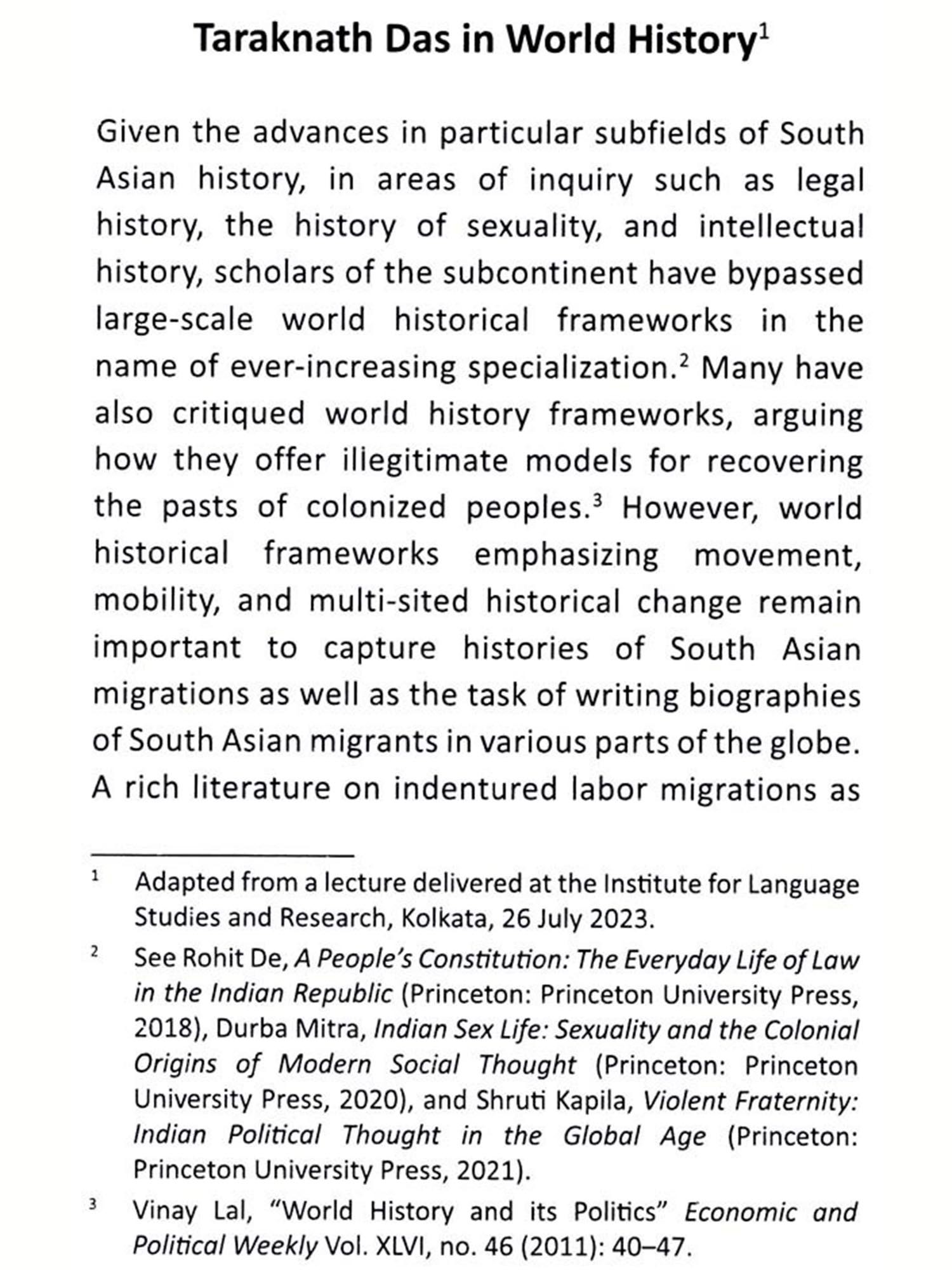 Professor Neilesh Bose is a renowned South Asian Scholar and his erudition in South Asian intellectual history research has been widely acclaimed. His Hara Prasad Shastri lecture, 2023 on "Taraknath Das in World History" engages with unexplored areas of global intellectual history and internationalism. I am really happy to note that ILSR is publishing this very important lecture draft as part of its institutional publication drive. All these research documents will contribute in a significant way in the larger academic and intellectual deliberations in this field. I thank Professor Bose and the ILSR fraternity for this laudable initiative and I sincerely hope that in the days to come we will witness more scholarly endeavours and global dialogues on Bengali intellectual and cultural history.