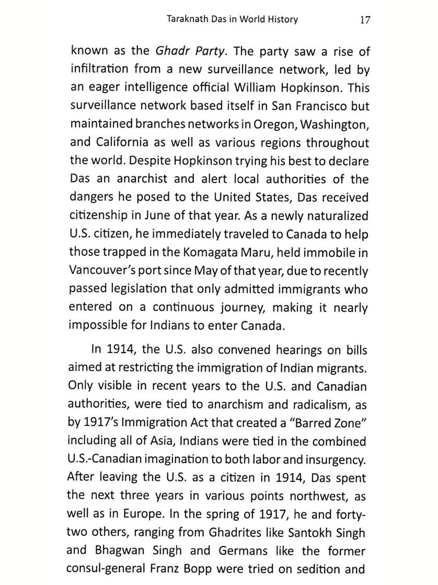 Within the ambit of this turn in the field, this small monograph by Neilesh Bose serves an important purpose of placing Taraknath Das, one of modern India's most important itinerant nationalists and anti-colonial activists who spent considerable time in the United States through educational and activist networks in a broad framework of world history. For all his contribution to some of the most pressing scholarly and political questions of his time, Das who brought into being the foundation names after him that supported research by Indian students for nearly nine decades - has not received due attention in either North American or South Asian histories. Given his educational training in the USA, and his key role in the Ghadar movement as well as in the inter-war anticolonial movements in North America and European, his work serves, as Bose so cogently shows, 'as a window into entangled histories of race and citizenship between the United States of America and India in the late colonial era. Like several of his compatriots including, among others, MN Roy, Benoy Kumar Sarkar, Dhan Gopal Mukerji, Shyamji Krishnavarma, Bhupendranath Dutt, and Lala Lajpat Rai - Das was a central figure in the history of overseas nationalism in the early to mid-twentieth century. The book offers an examination of Das's checkered relationship with the United States, and of his relationship to citizenship and the overall politics of nationalism - something that has not been done till now.