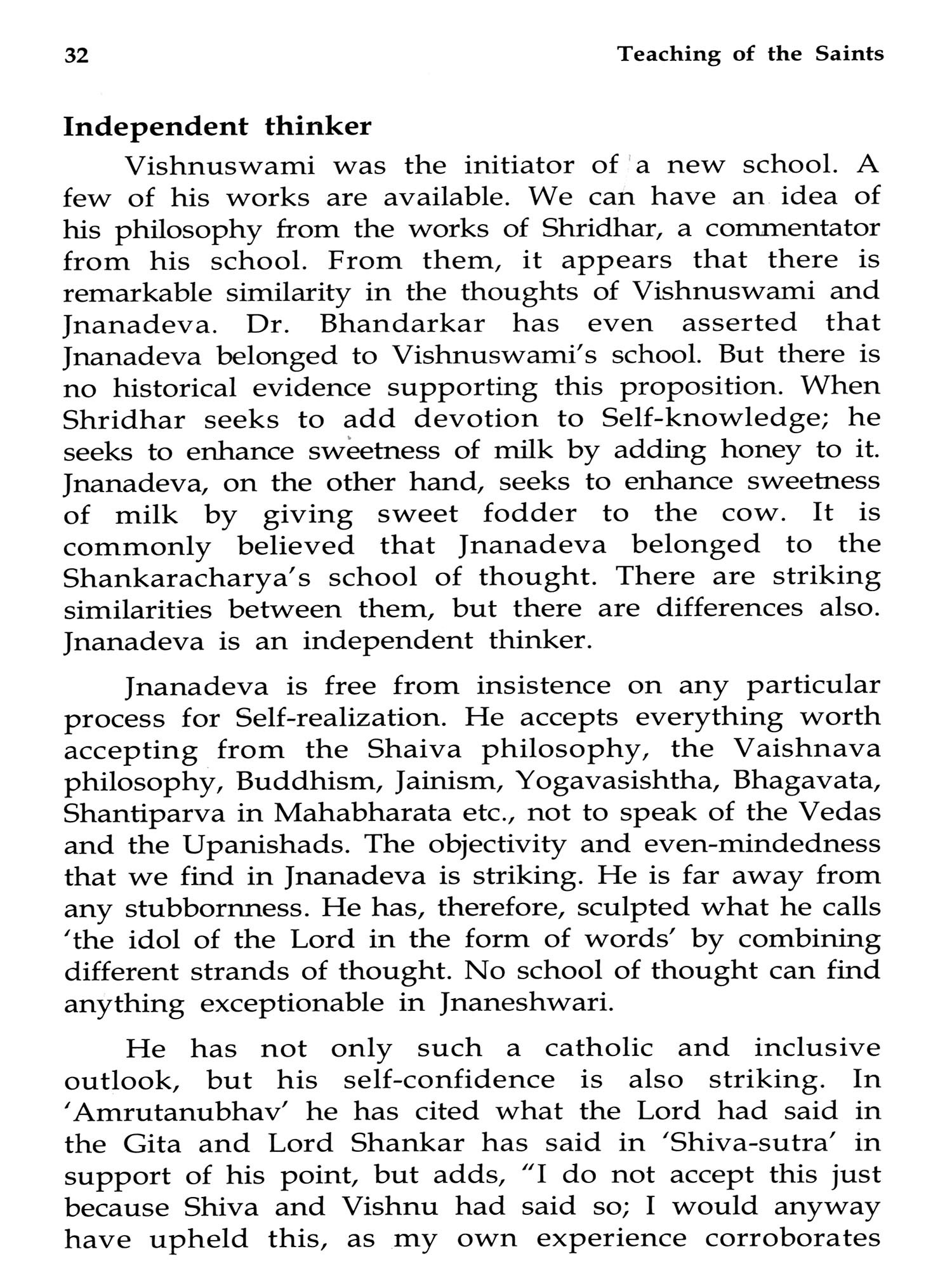Being a Maharashtrian, Vinoba was well versed in the devotional literature in Marathi. His selections from Jnanadeva, Namadeva, Eknath, Tukaram and Ramdas, five major saints in middle ages, present the essence of their teaching. Jannadeva was one of the three great men who had influenced Vinoba the most (the other two were Shankaracharya and Gandhi). His commentary on Jnanadeva's abhangas (devotional songs) ('Jnanadeva Chintanika') is a spiritual classic, written in the state of deep absorption. Sadly, it has not yet been translated in English. His commentary on some of the abhangas of Tukaram ('Santancha prasad') is also noteworthy.