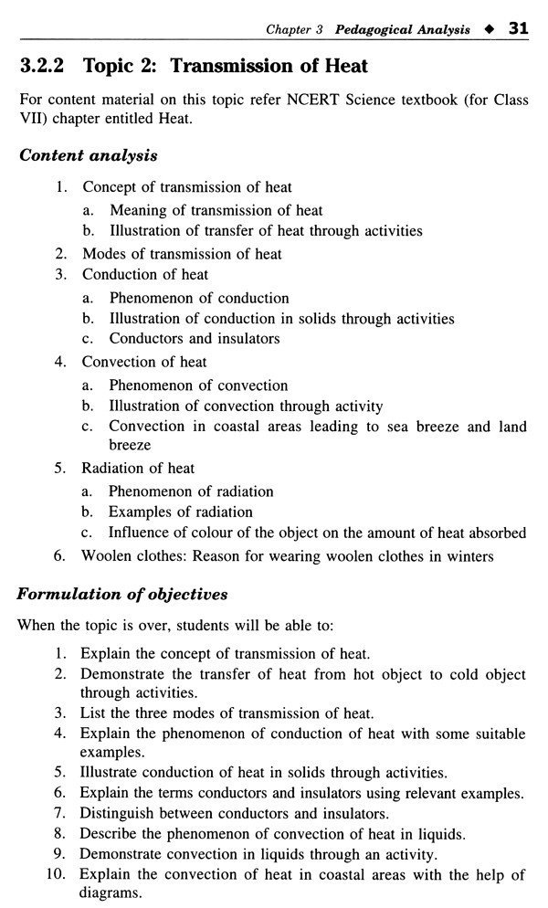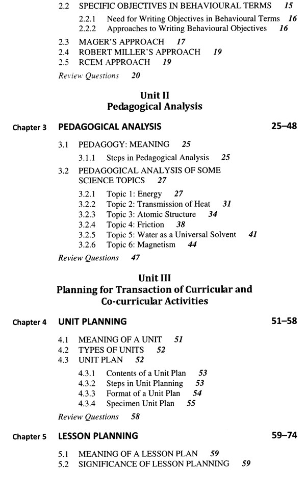 Unit II Pedagogical Analysis: This unit covers the meaning and steps of pedagogical analysis. Pedagogical analysis of some science topics is also dealt with.