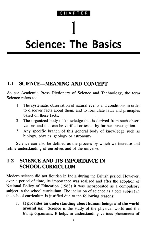 Science can be defined as a process by which we can increase and refine understanding of ourselves and of the universe. Science is an important core subject area today in all school curriculums. It is a vital duty of the science teachers to transact the concepts and processes of science in a skillful and effective manner. The purpose of this book is to guide the science teachers and teacher-trainees in this direction.
