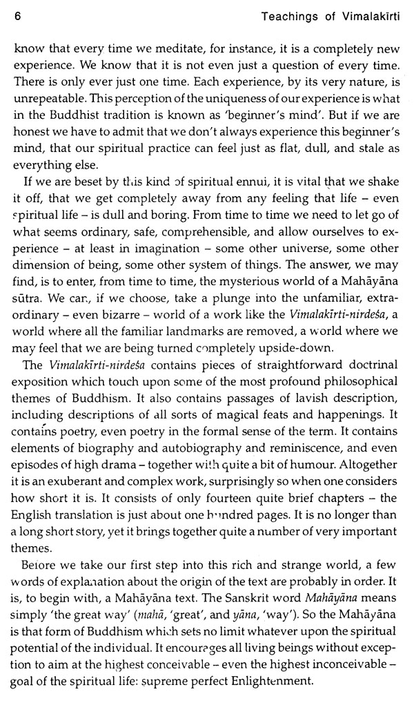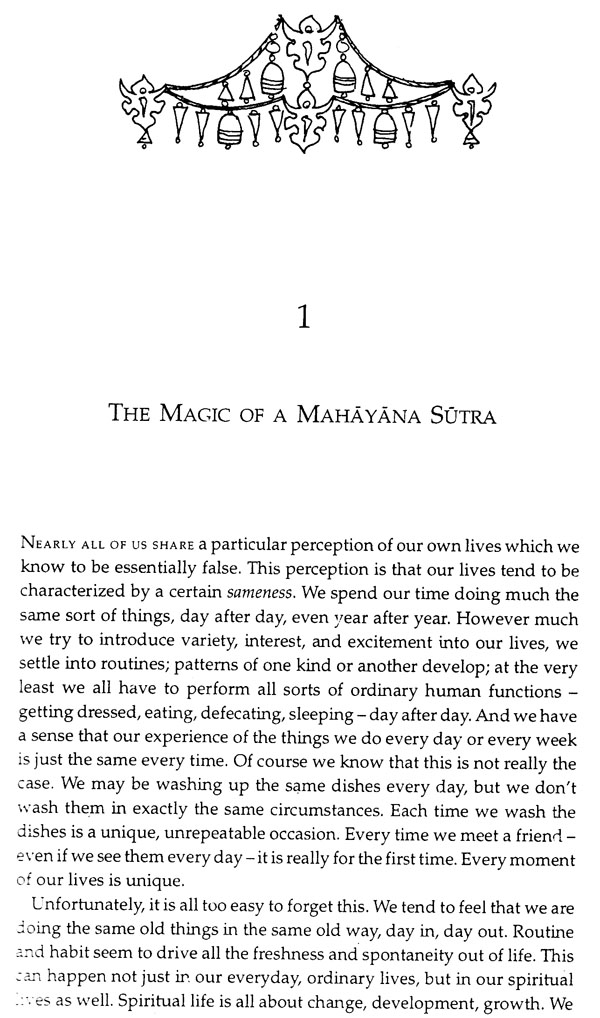 The general spiritual or cultural interest which may lead us to pick the Vimalakirtinirdega off the bookshop shelf will not be enough. We will - almost certainly - need help in seeing its relevance to the process of our own spiritual growth. Sangharakshita's guidance, drawing on a lifetime of scholarship and reflection, enables us to enter the exotic world of the Mahayana sutras, and to dwell on the beauty and Strangeness of which they speak allowing their meaning to emerge and unflold for us.