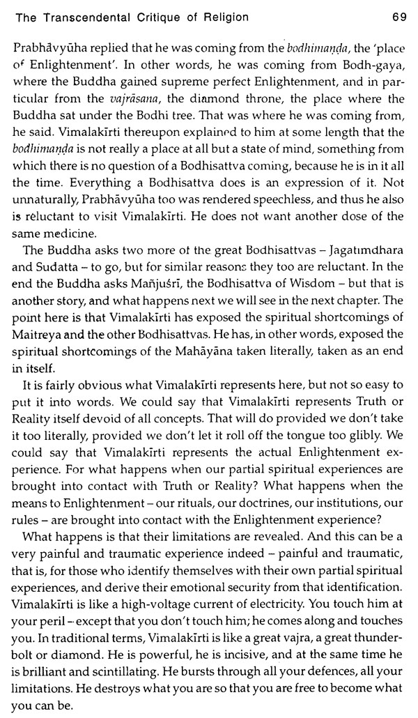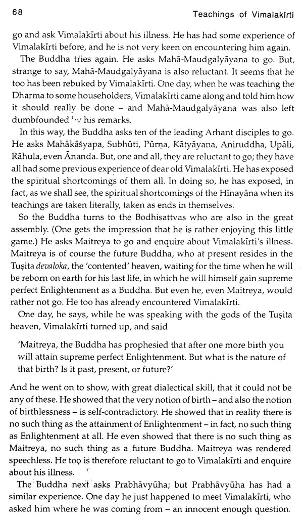 Vimalakirti-nirdega or 'Teaching of Vimalakirti' alcyamuni's remoteness from us is pointed up by the person of Vimalakirti, introduced to us as a prosperous city-dweller, married with a family, a respected citizen, a popular man-about-town. Here is someone whose life and concerns might seem to resemble our own. But Vimalakirti's similarity to his fellow citizens of Vagali and to many of us is more apparent than actual. Sangharakshita points out that it would be a serious mistake to regard him as an example of the average layman, either two-and-a-half thousand years ago or now.