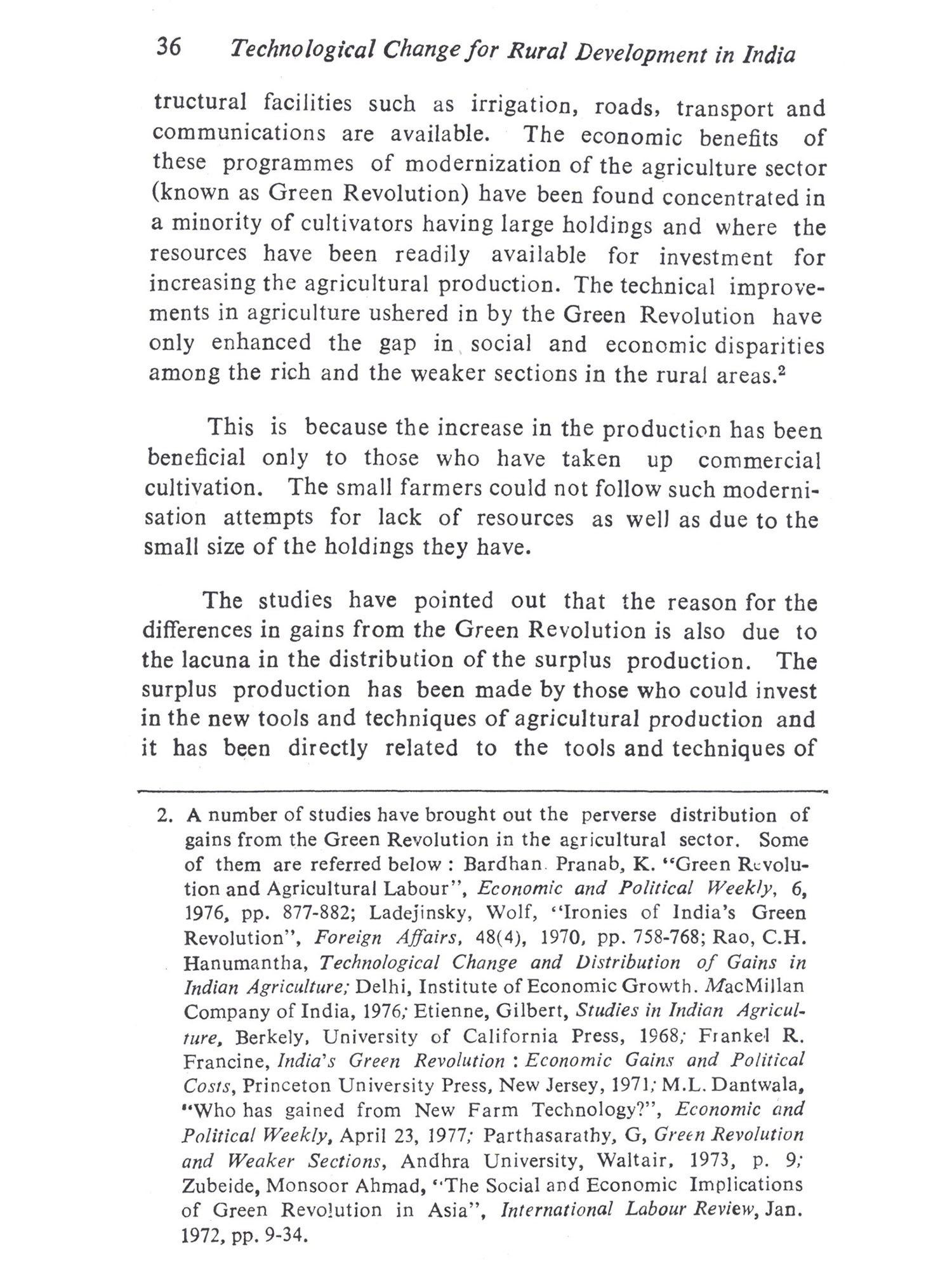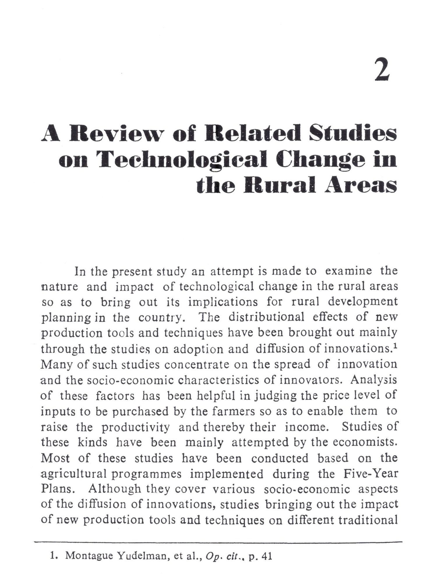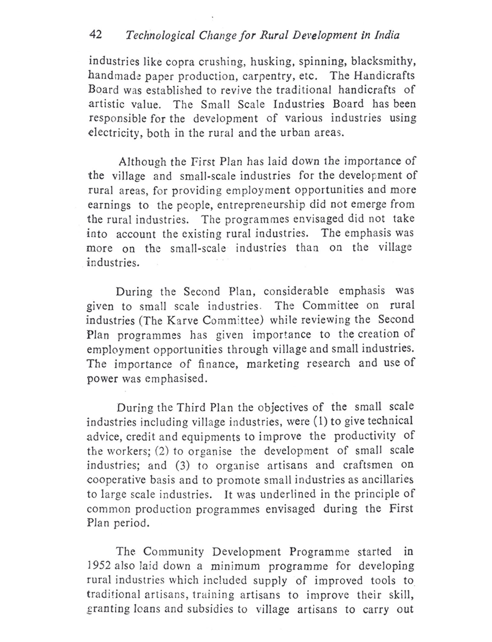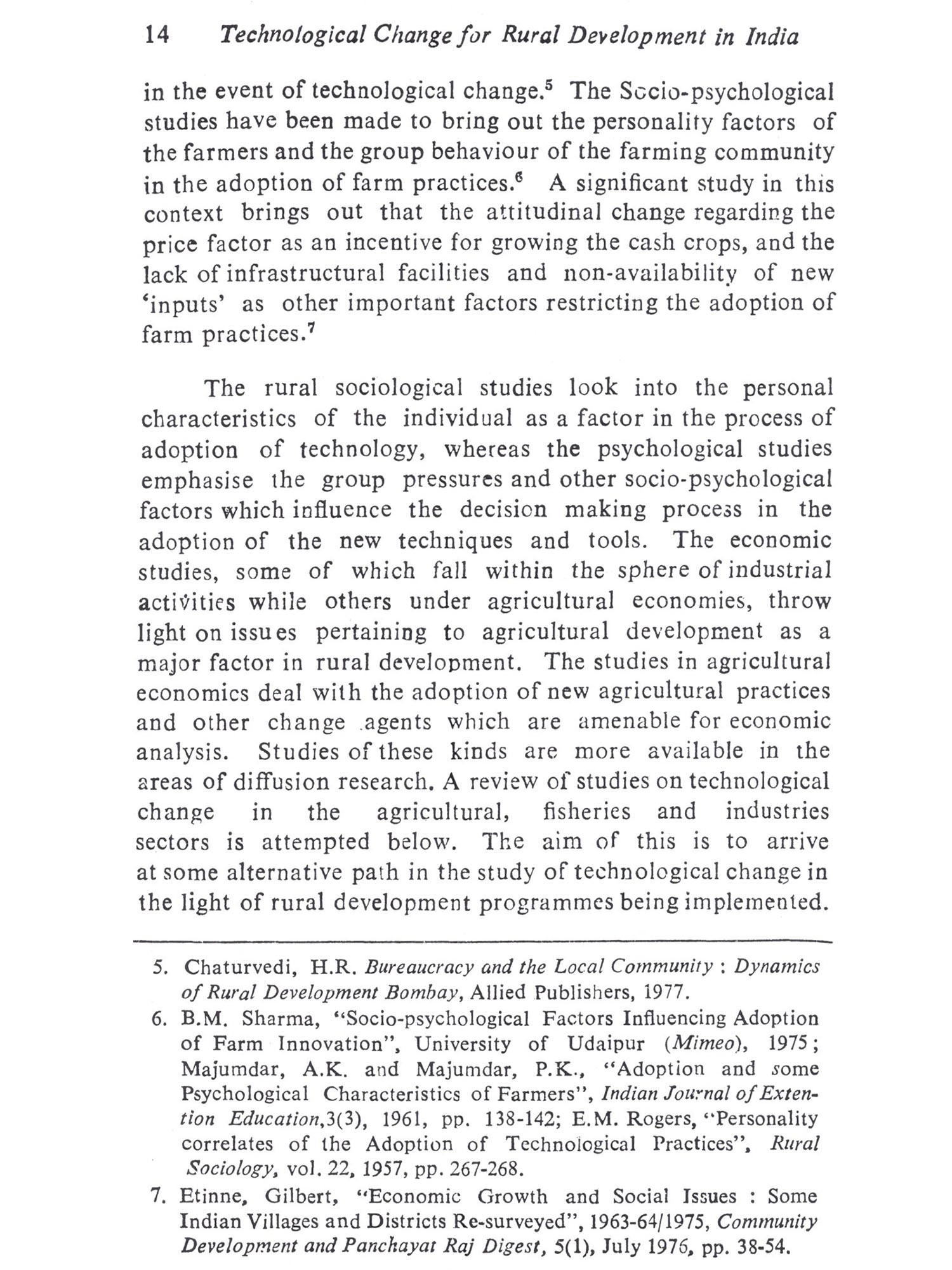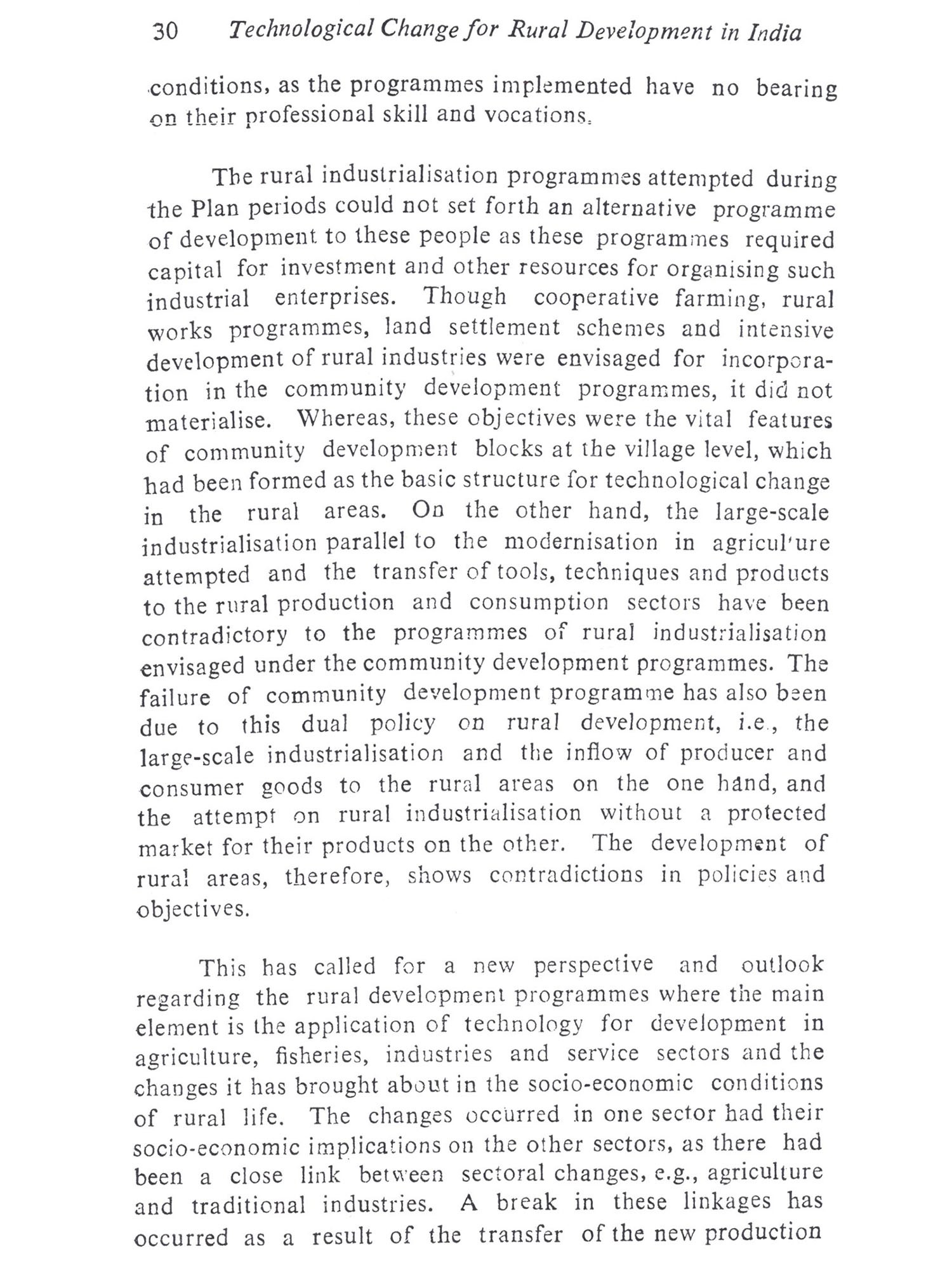 The present study attempts to delineate the nature and impact of technological change in the rural areas with the objective of making possible policy options for rural develop-ment planning. The problems of technological change and development are interrelated and complex. But the case here is in what all respects the technological change can explain development in the present times so that the problems of development in the rural areas can be better understood. This is important when programmes for rural development are envisaged with technology as the major factor of development. The term 'technology' is used widely to mean the "operative knowledge of means of production of goods and services by the society". Specifically it means the "syste-matic use of industrial processes, tools and techniques" for the production of goods and services by the society. Technologi-cal change, therefore, implies a change in the tools, techniques and the industrial processes used by the society for production. The goods produced may be either producer goods or consu-mer goods. The producer goods are those used in the production of other goods. They can be agricultural implements, machinery, fertilizers or pesticides, as well as raw materials used in industry, and crafts and equipments used for fishing, etc. Consumer goods are those which have only use value and no production value such as household appliances and equipments, food stuff, etc. Technological change, therefore, involves the changes in producer and consumer goods as well as services used by the society. These goods and services may be internally generated by the society (in this case, the rural society) on its own innova-tion or, externally introduced according to the socio-economic requirements. In the former case, it becomes an endogenous factor in the socio-economic development of the society. The technology internally generated incorporates the skill, resources and the productive ability of the society. In the latter case the goods and services may be externally introduced to cater to the socio-economic requirements of the society. Then it is an exogenous factor, which does not incorporate the skill, productive ability and the resources of the particular society. But, its adoption and use become integrated into the socio-economic requirements of the society in the long run. Then it becomes an endogenous factor. This amounts to the fact that technologies have been in use which have been internally generated or externally introduced by the society according to its own socio-economic requirements. In either case, techno-logy is not neutral to the socio-economic change it brings in its use or application. The socio-economic changes brought in the process of its use is referred here as 'development'. The rural development programmes in the country show a definite pattern of technological change which is externally "induced". This is evident from the transfer of goods and services made to the rural areas through the development programmes during the Five Year Plans. The main objective of the programmes of development was transformation of traditional production by increasing the productivity in the agriculture sector. Although such development has increased the production and consumption levels of the few who had the resource endowments to invest for more returns to the agricultural "inputs", it has not been conducive to the deve-lopment of other sectors of production and services, which depend on agriculture. The traditional industries and services sectors lost the demand for their products and services, because their demand mainly came from the agricul-tural producers. Not only the demand for traditional goods and services has become less, but also the traditional skills of the village artisans and their occupation have their value reduced. Moreover, the product-inflow from the urban industries and their organized marketing techniques changed the consumption pattern of the few who could enhance their income level from the increase in their earnings. These structu-ral changes have important bearings on the socio-economic development of the rural people. The rural industrialization programmes attempted to ameliorate the unemployment situa-tion of the rural artisans and those in the service sector have only created problems like want of resources for investment in new tools and equipments. In effect, the rural industrialization programmes aimed at the revival of the rural economy have only helped in building up of another level of production and consumption pattern among the rural people. The artisans did not endeavour to revive their own traditional industries as they could not compete with the products-inflow from the organized manufacturing industries in the urban areas.