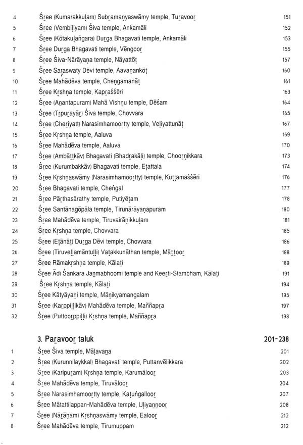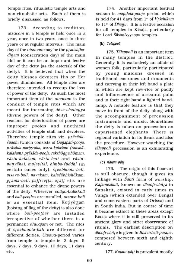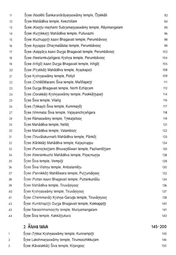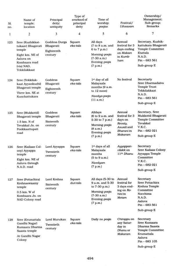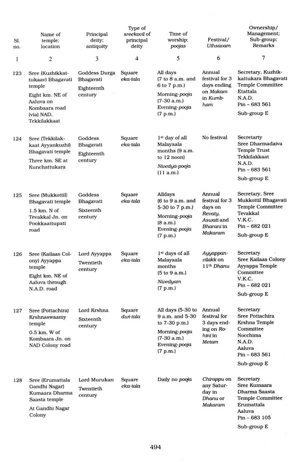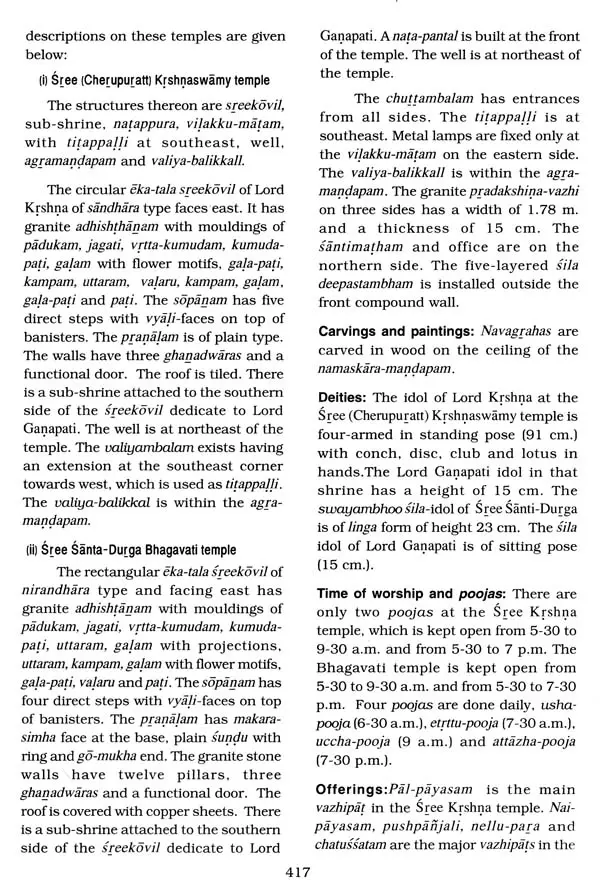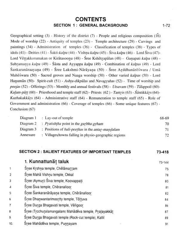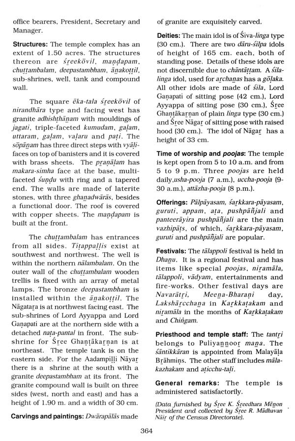 Kerala temples are unique in their architecture style and rituals. The distinctive style of architecture is termed 'Dravida-Kerala The monograph gives the varied forms of architectural types used in building temples. These patterns are clearly discernible from the photographs of major and most important temples included in this monograph. They are aesthetically pleasing visualisation of the great temples described in the monograph. The painstakingly compiled Temple Directory of 1285 temples in the district could support several research studies in architectural pattern.