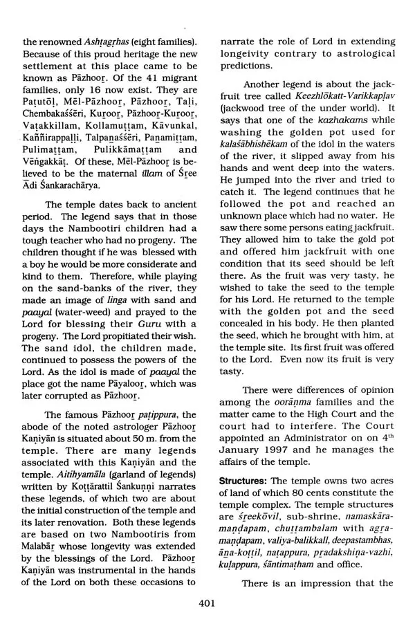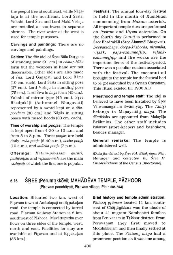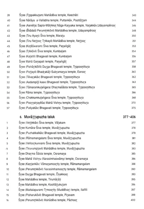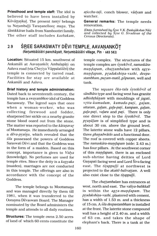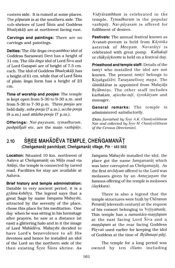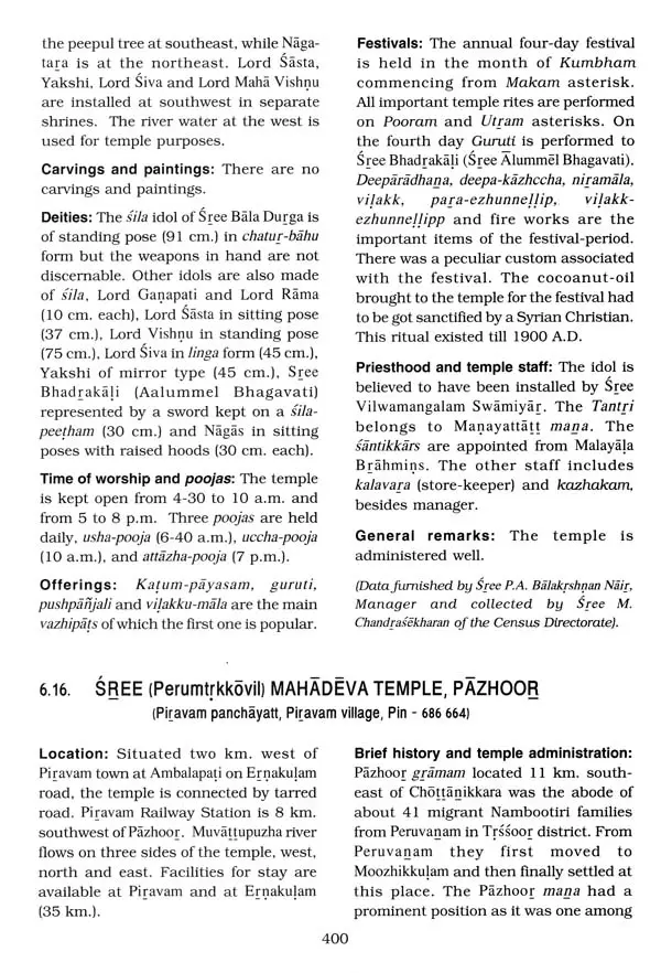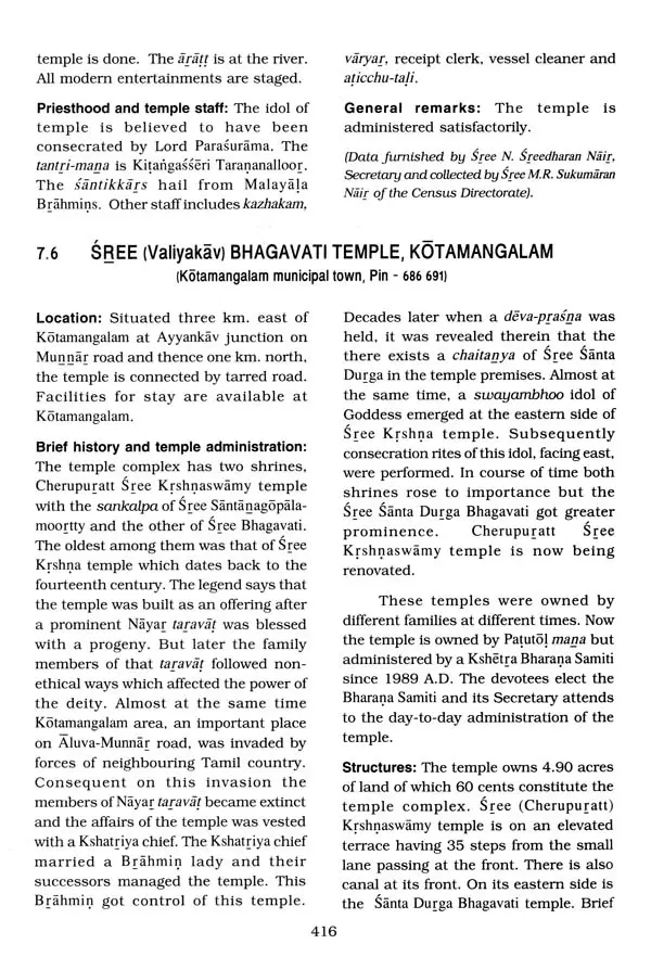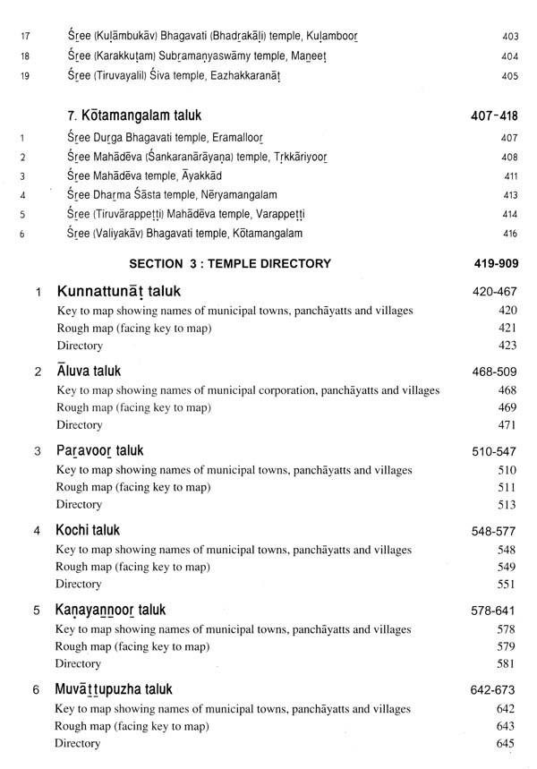 Kerala temples are unique in their architecture style and rituals. The distinctive style of architecture is termed 'Dravida-Kerala The monograph gives the varied forms of architectural types used in building temples. These patterns are clearly discernible from the photographs of major and most important temples included in this monograph. They are aesthetically pleasing visualisation of the great temples described in the monograph. The painstakingly compiled Temple Directory of 1285 temples in the district could support several research studies in architectural pattern.