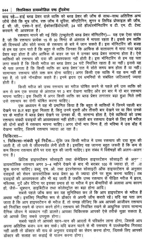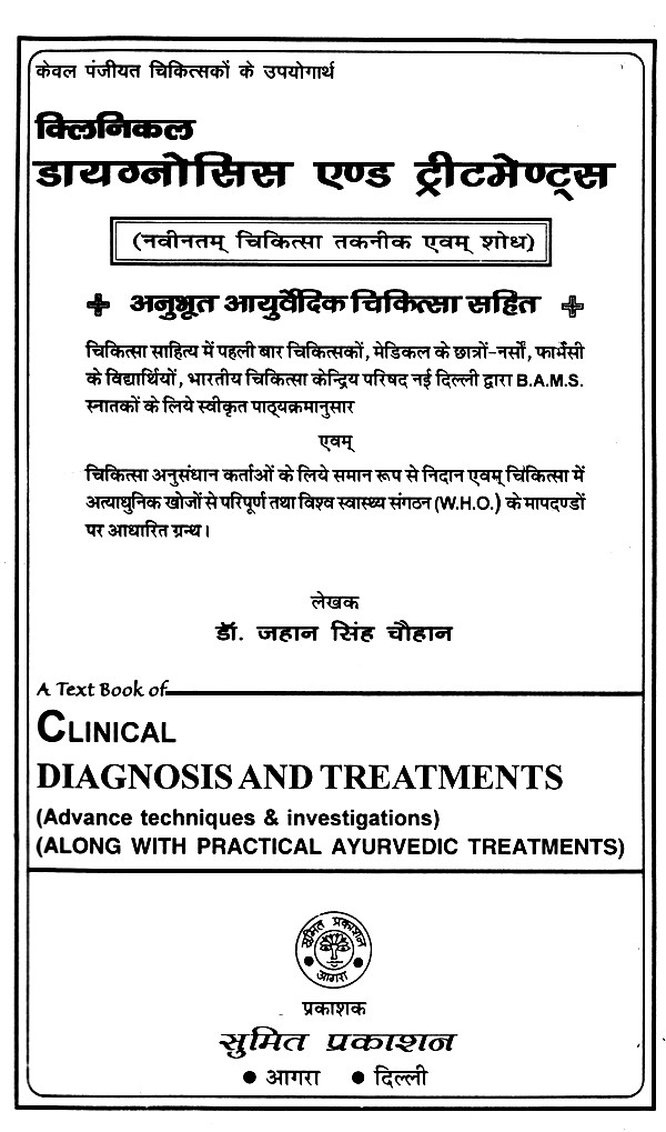 'क्लिनिकल डायग्नोसिस एण्ड ट्रीटमेंट' (Clinical Diagnosis and Treat-ment) अत्याधुनिक चिकित्सा एवं शोध की इस पुस्तक को प्रस्तुत करते हुए मुझे आत्मसंतोष की अनुभूति हो रही है क्योंकि मैं चिकित्सा क्षेत्र के दीर्घकालीन अनुभव और चिकित्सा विषय / रोग विशेषज्ञों (Disease specialist) के सुझावों को चिकित्सा जगत के व्यापक हित में प्रस्तुत करने का अपना ध्येय साकार कर रहा हूँ। भारत की राष्ट्र भाषा हिन्दी में आधुनिक चिकित्सा शास्त्र पर इस प्रकार की एक भी पुस्तक उपलब्ध नही है। हमारे मेडिकल कालेजों में यद्यपि शिक्षा का माध्यम अंग्रेजी ही है, हम इस तथ्य का आभास कर रहे हैं कि हमारे छात्र हिन्दी माध्यम से माध्यमिक शिक्षा प्राप्त करने के पश्चात् अंग्रेजी की पाठ्यपुस्तकों (Text books) को समझने में कठिनाई का अनुभव करते हैं, स्नातक छात्रों के पास हिन्दी में मेडिसिन की पुस्तक होने से उन्हें इस विषय को समझने में सहायता मिलेगी। यह निर्विवाद है कि इस देश में बीमारियों पाश्चात्य देशों से भिन्न प्रकार की हैं तथा उनके लक्षण एवं चिन्ह (Clinical symptoms & signs) भिन्न हैं। अतः हमारे छात्रों के लिये इस दृष्टिकोण से लिखी हुई पुस्तक अधिक लाभदायक होगी।