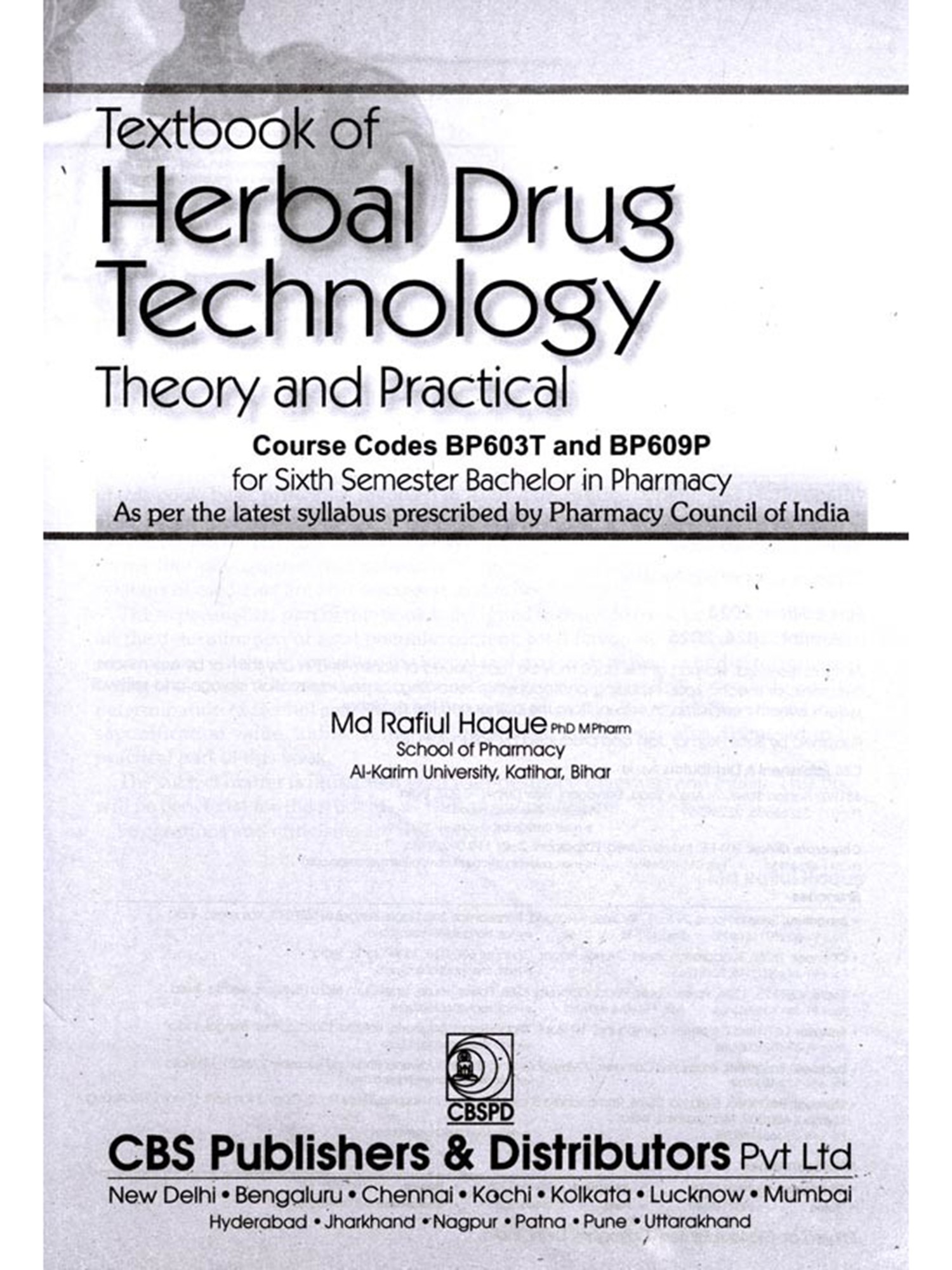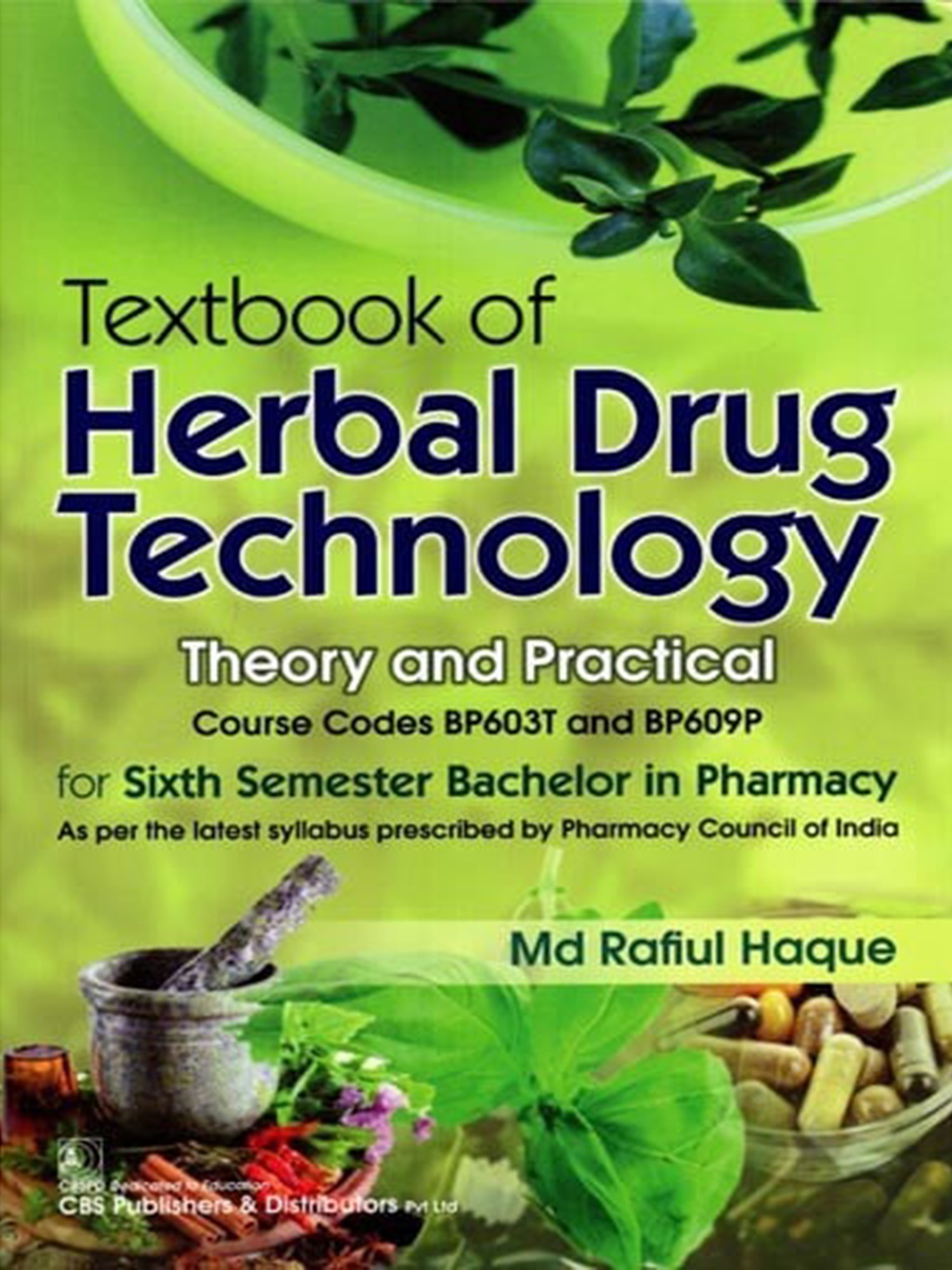Textbook of Herbal Drug Technology Theory and Practical course Codes BP603T and BP609P for Sixth Semester Bachelor in Pharmacy aims to serve as a complete textbook for the sixth semester Bachelor in Pharmacy. This book covers both theoretical and practical parts as per the latest syllabus prescribed by Pharmacy Council of India (Course Codes BP603T and BP609P).