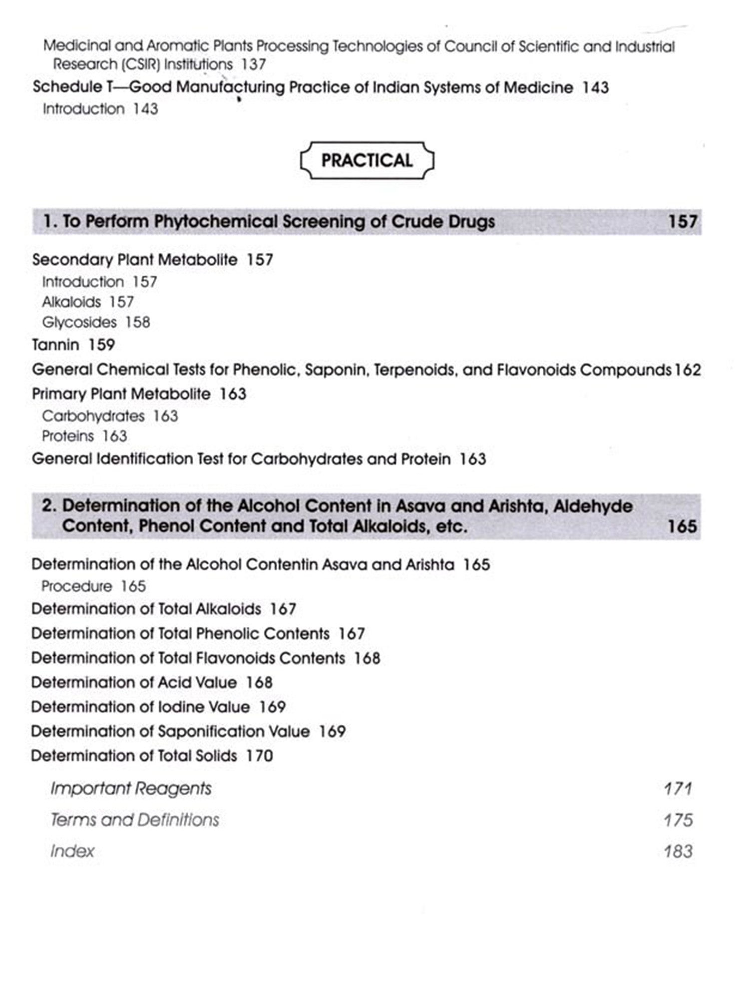 The experimental part of this book is designed to provide basic practical knowledge on the determination of total phenolic content, total flavonoid content, total alkaloid content, and aldehyde content in the herbal raw materials as well as herbal formulation. Using this book will also help in understanding basic practical knowledge on the determination of alcohol content in arishta and asava. The determination of acid value, saponification value, iodine value, and total solid content are also discussed in the practical part of this book.