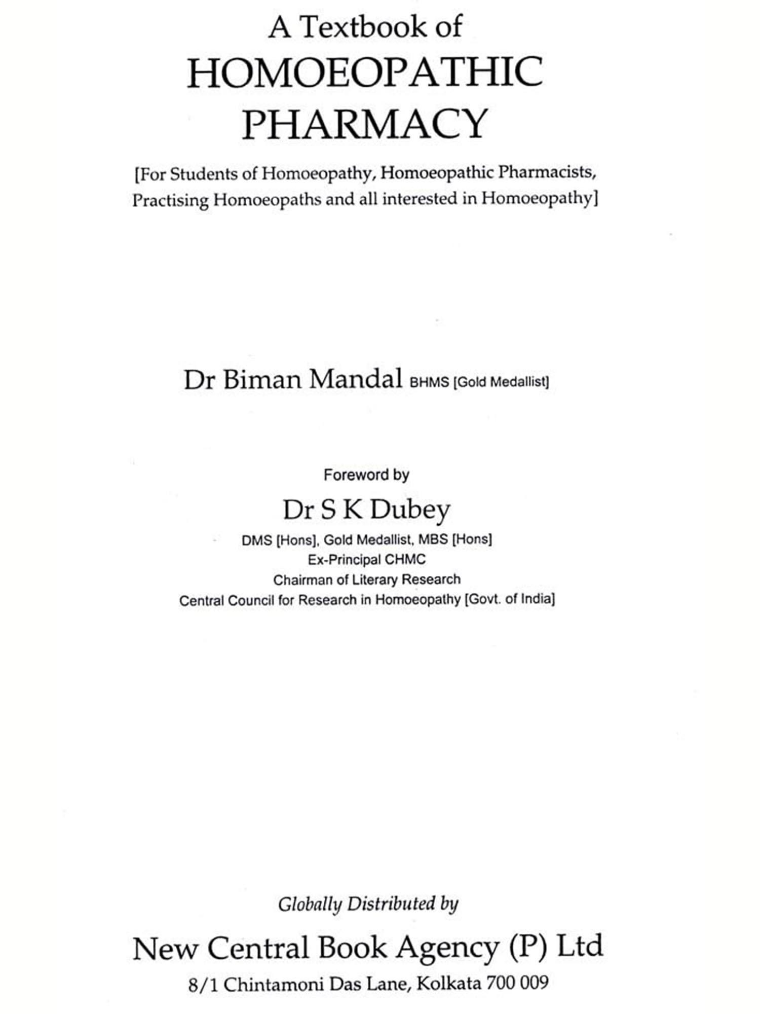 I have gone through "A Textbook of Homoeopathic Pharmacy" by Dr Partha Pratim Mandal and Dr Biman Mandal. I am pleased to note that the treatise is very competent and up-to-date, and will be useful not only to the students but also to the profession at large.
