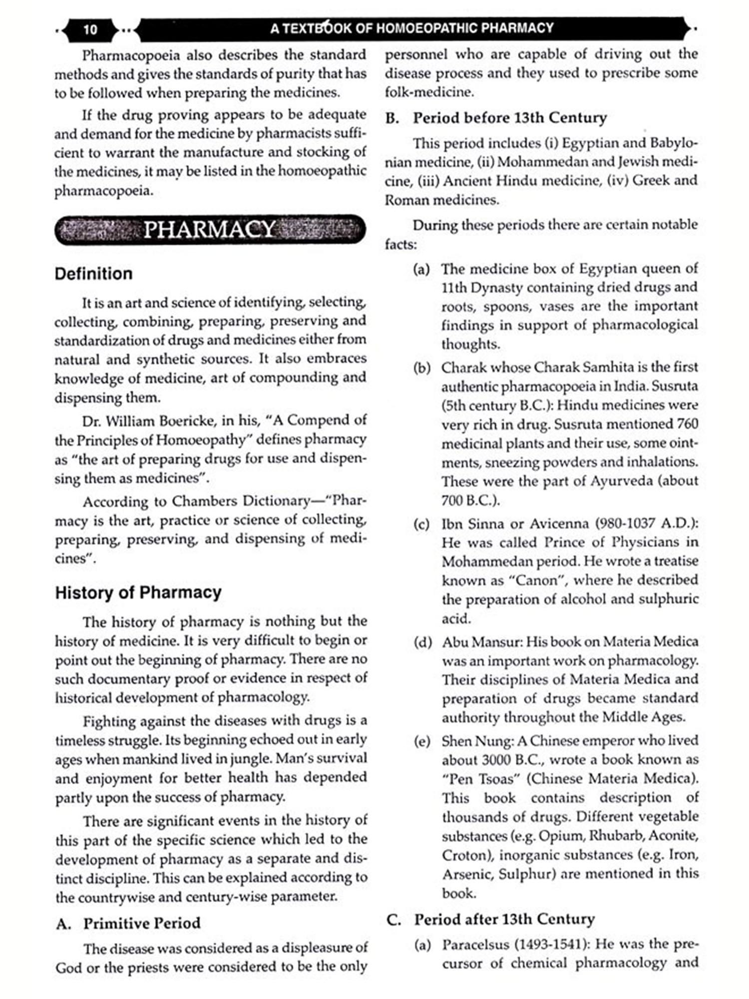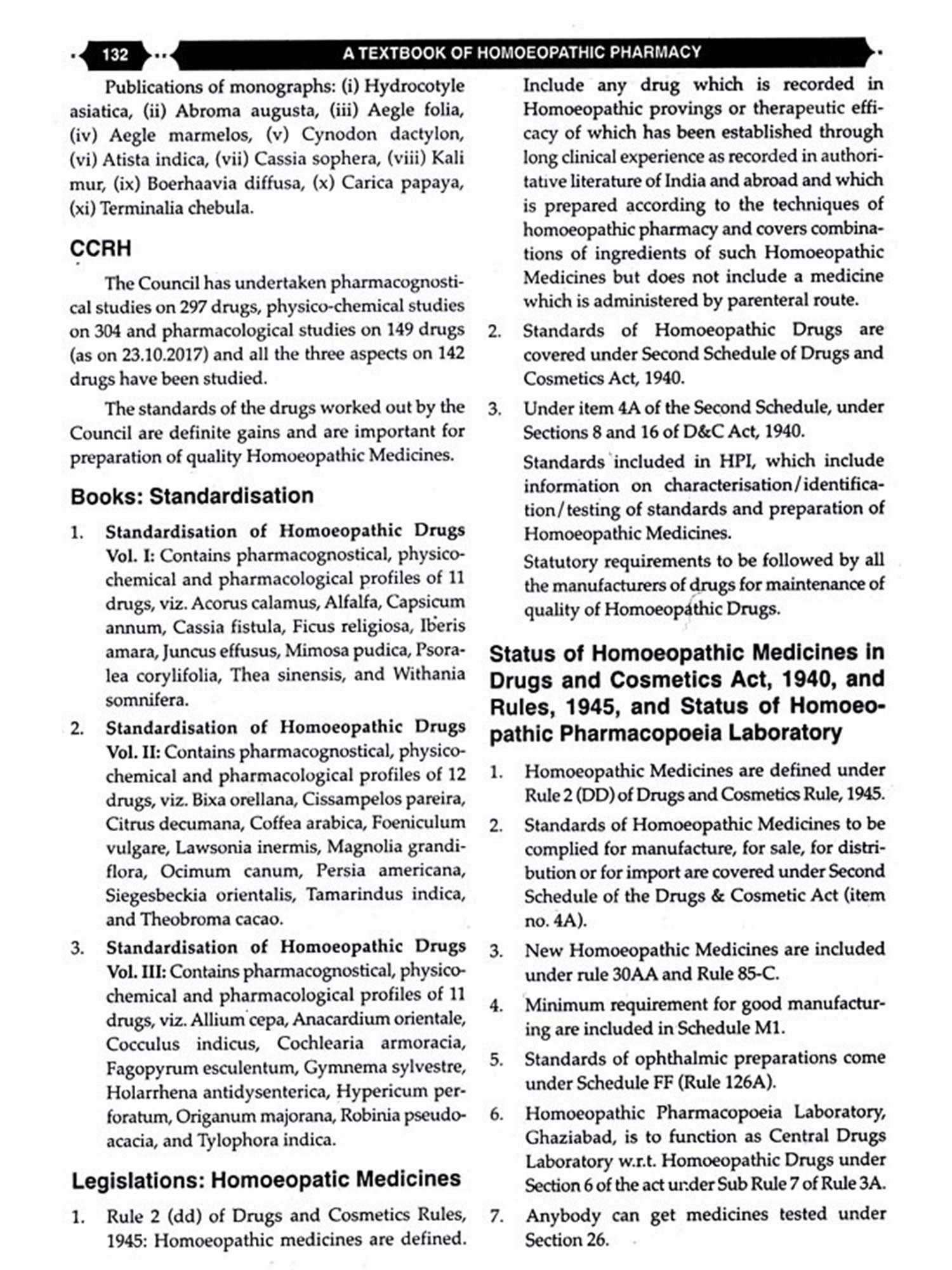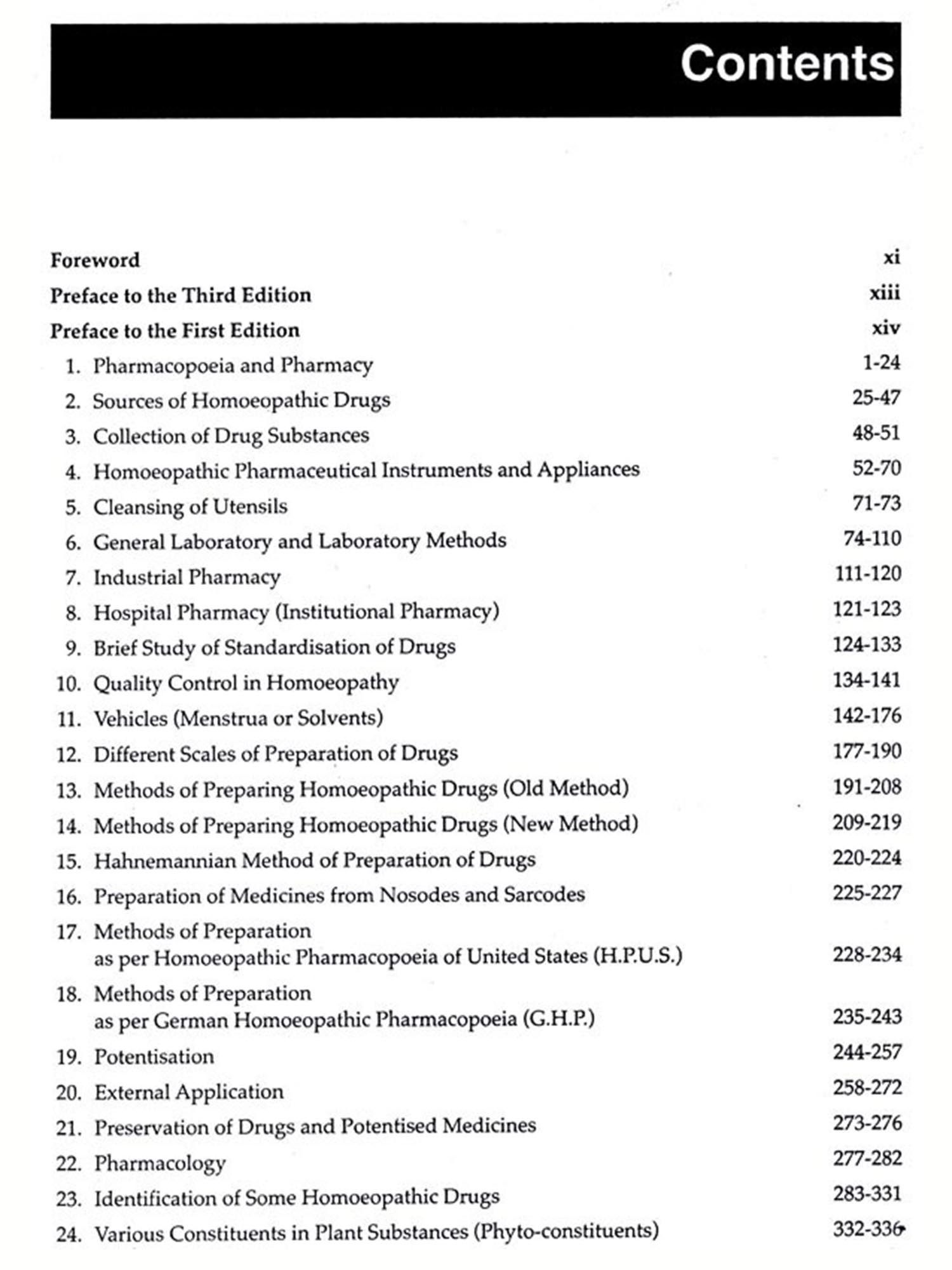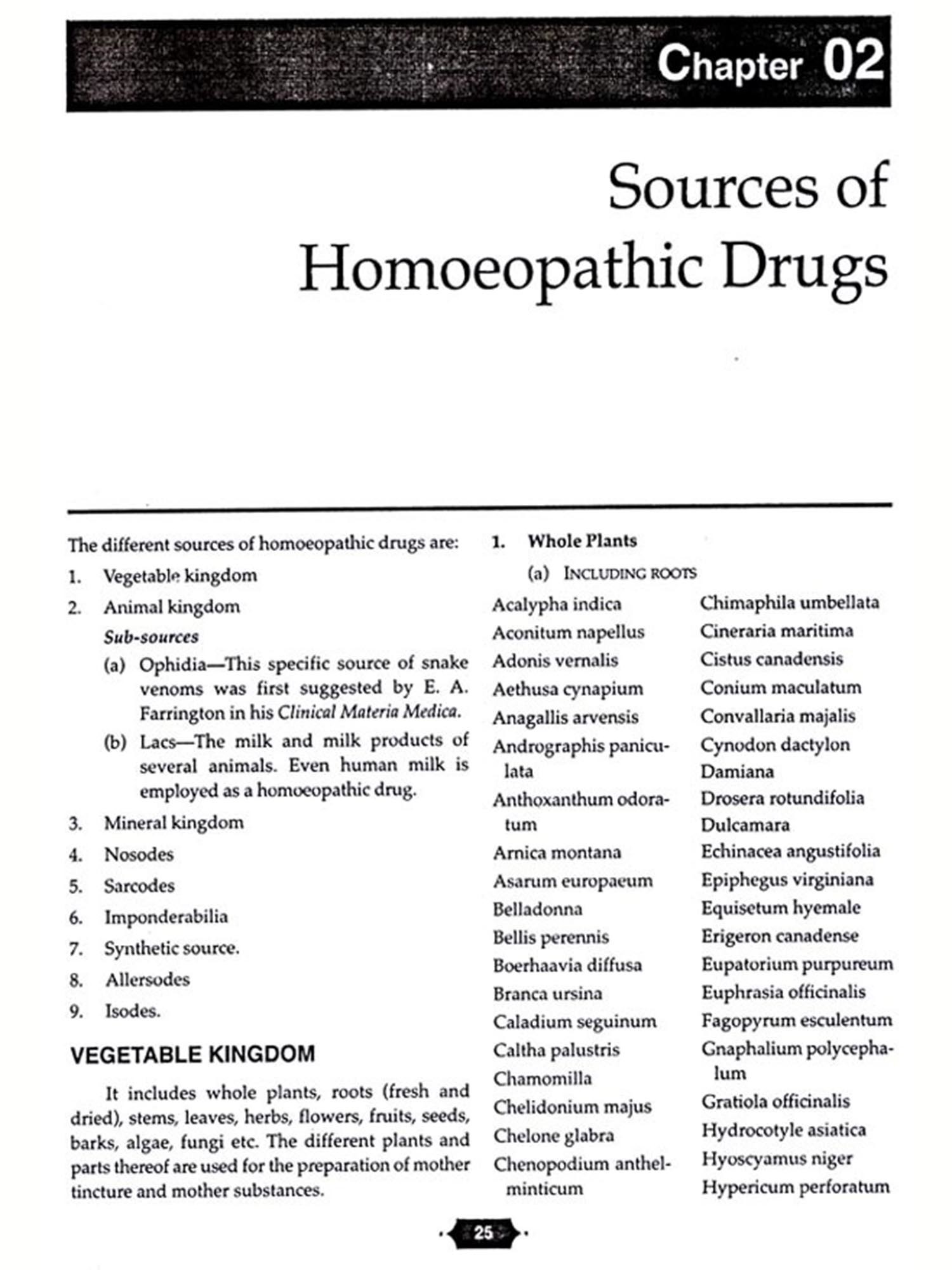 The chapters which deserve special mention deal with sources of Homoeopathic drugs, different scales of preparation of drugs, methods of preparing Homoeopathic drugs, potentiation, and list of drugs with their common name, family, distribution, and parts used.