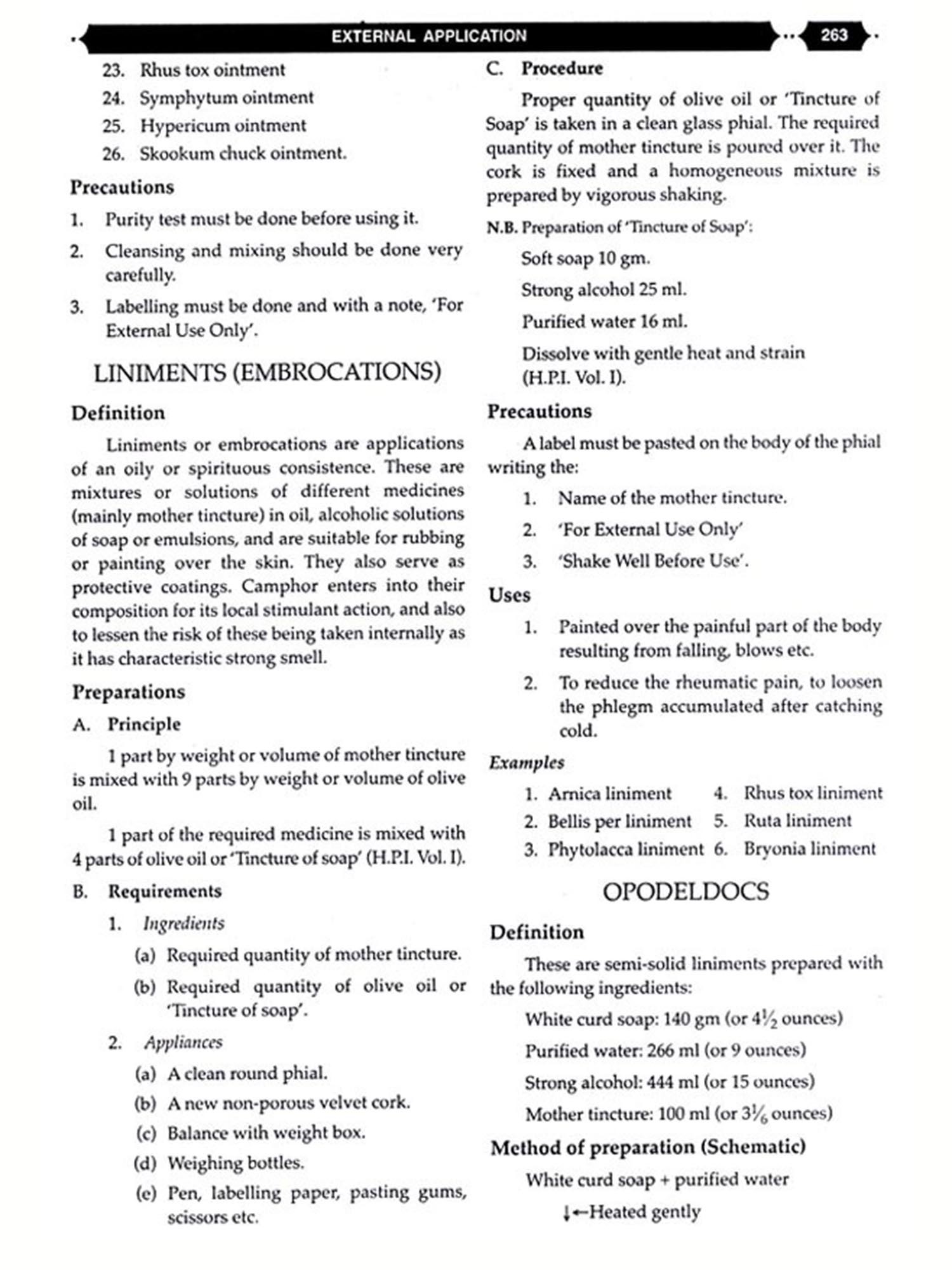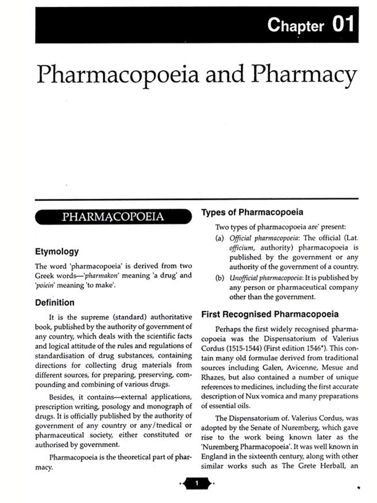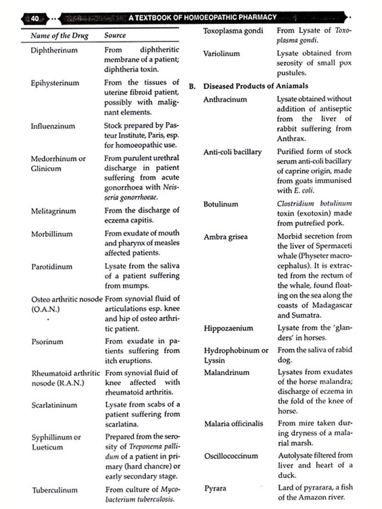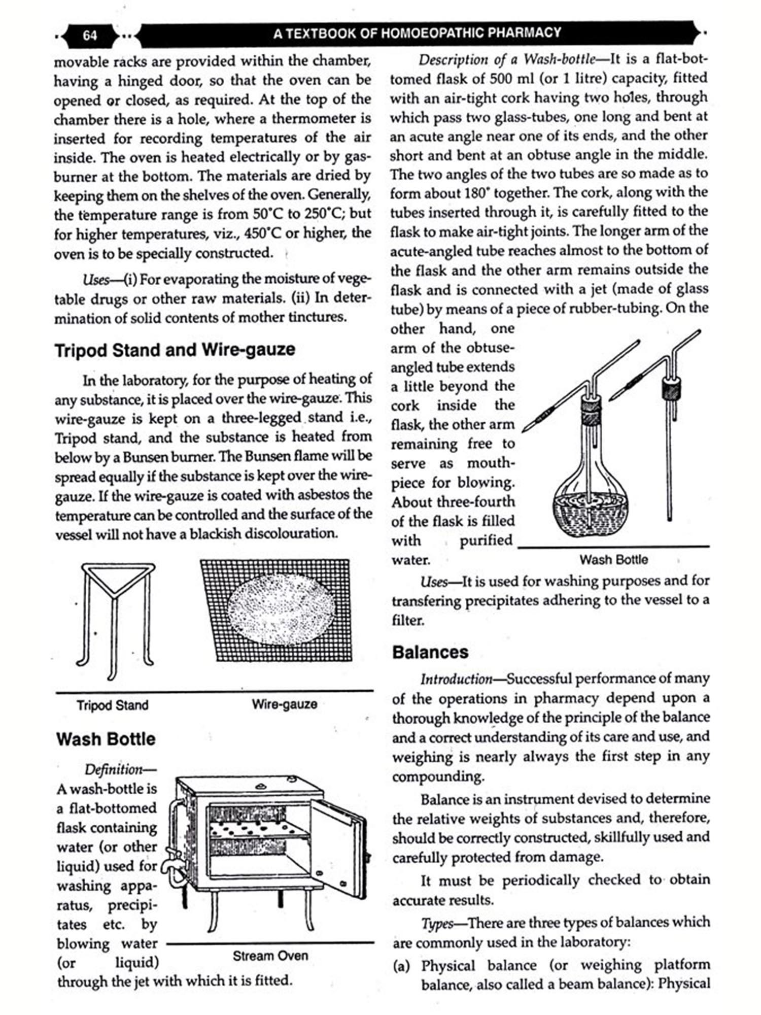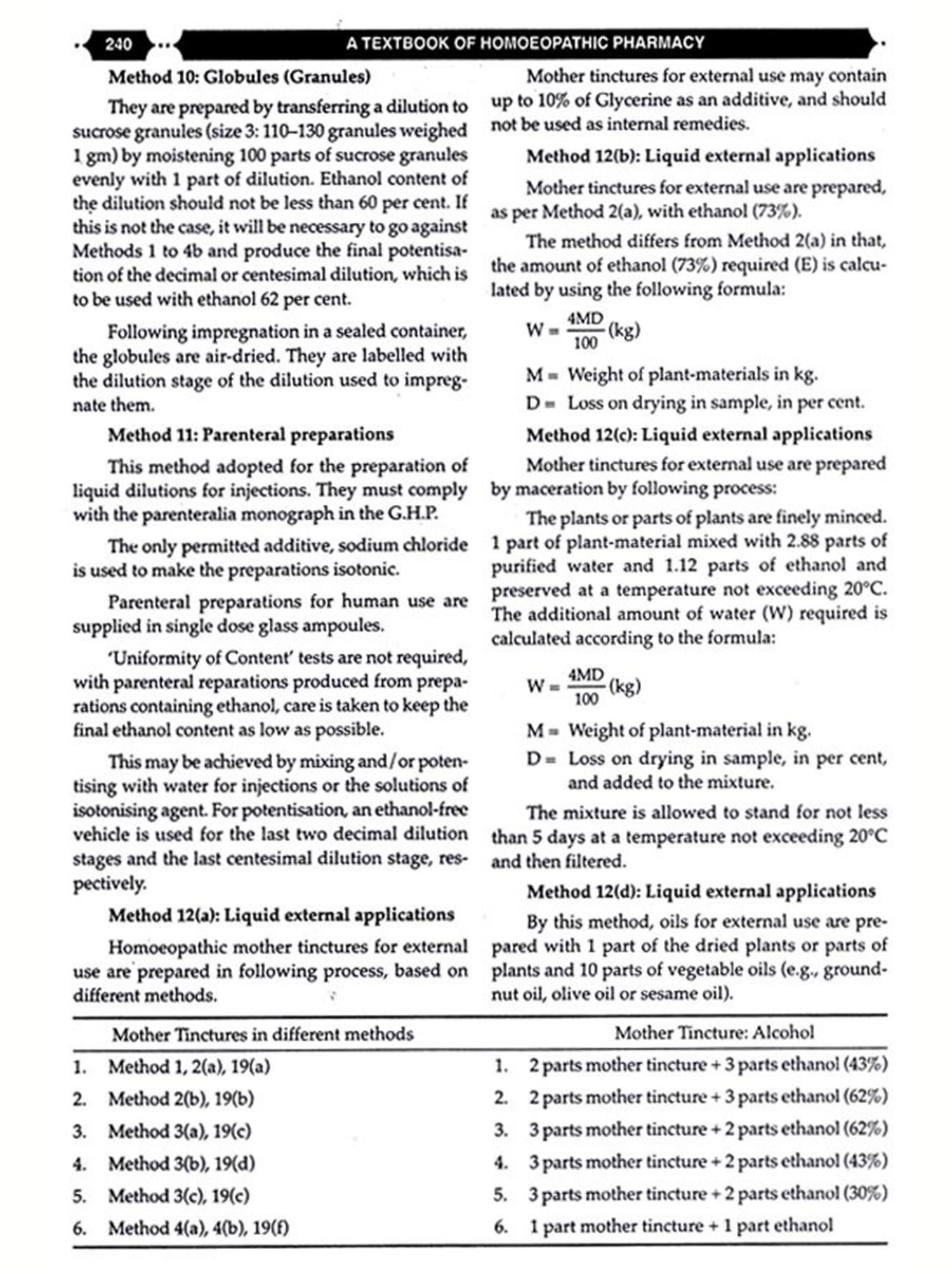 The chapters which deserve special mention deal with sources of Homoeopathic drugs, different scales of preparation of drugs, methods of preparing Homoeopathic drugs, potentiation, and list of drugs with their common name, family, distribution, and parts used.