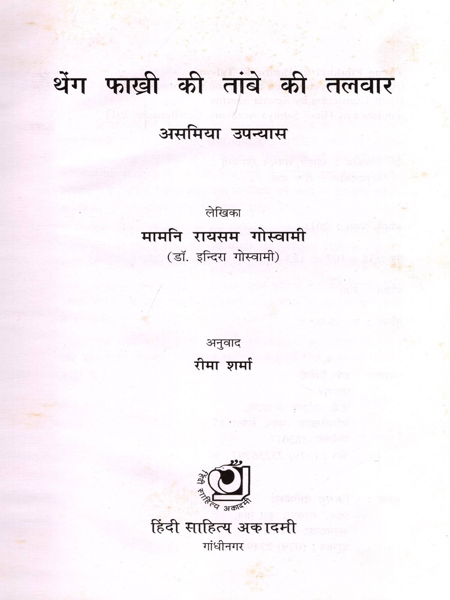 हिन्दी साहित्य अकादमी के द्वारा हिन्दी साहित्य के कई उत्तम ग्रन्थ प्रसिद्ध किये जाते हैं। यहां पर रीमा शर्मा द्वारा असमिया भाषा की सुप्रसिद्ध लेखिका डॉ. इन्दिरा गोस्वामी रचित उपन्यास 'बेंग फाखी की तांबे की तलवार' का असमिया से हिन्दी में अनुवाद किया गया है। रीमा शर्मा युवा लेखिका-अनुवादक है। उनका यह अनुवाद मूल असमिया की भाषा-परंपरा और संस्कृति को हिन्दी में स्वाभाविक रूप में प्रस्तुत करता है।
