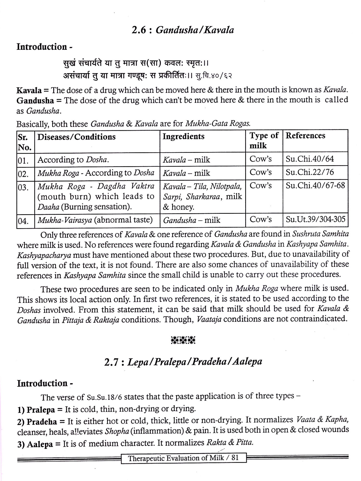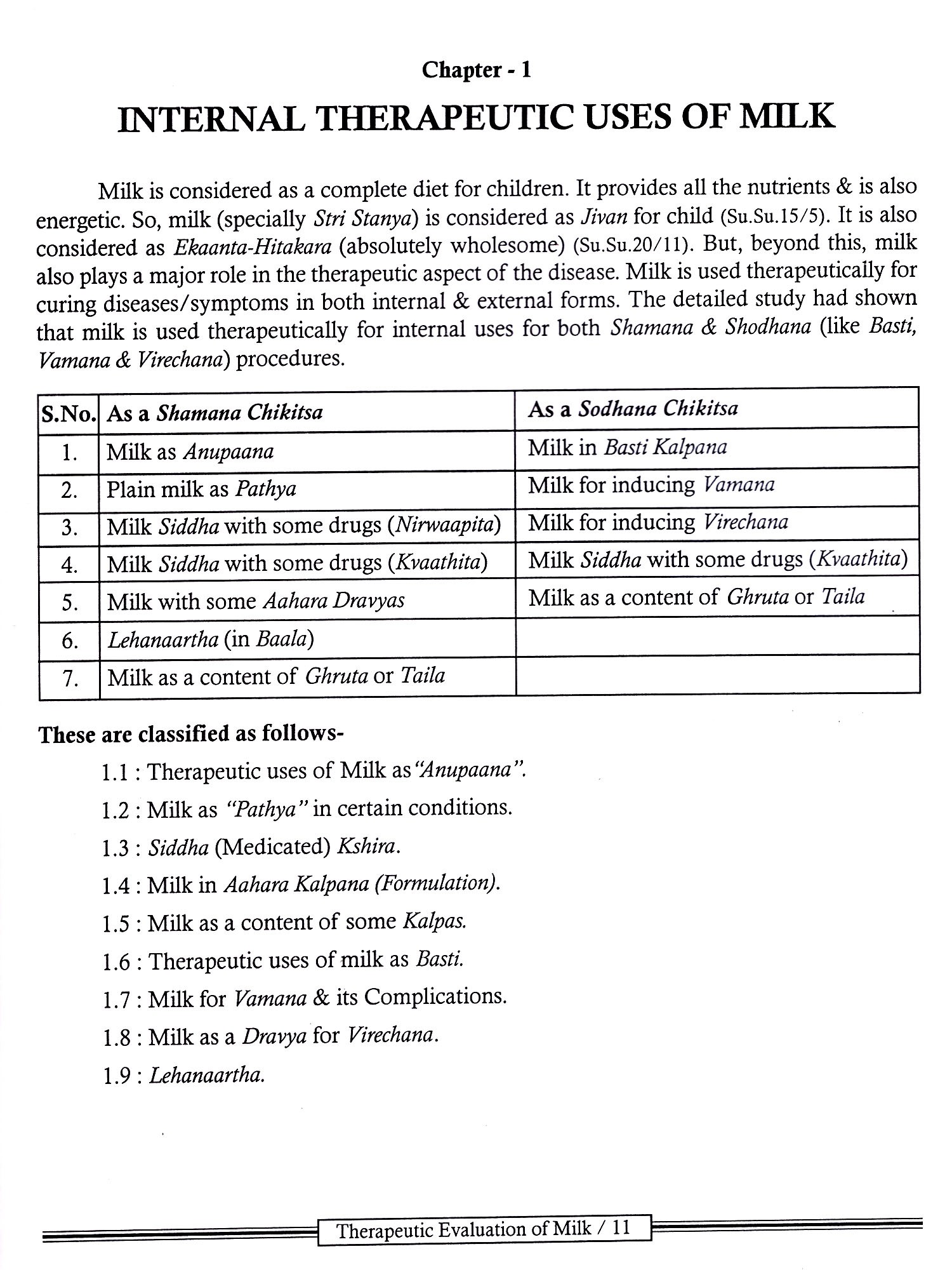 For both types of treatment, that is Shamana and Shodhana variety of Dosage forms are prescribed. A superficial look at these Dosage forms shows that "Milk' is used as a main ingredient in so many Dosage forms like "Kshira Kalpana", "Basti Kalpana", "Kshira Siddha Yusha" etc.