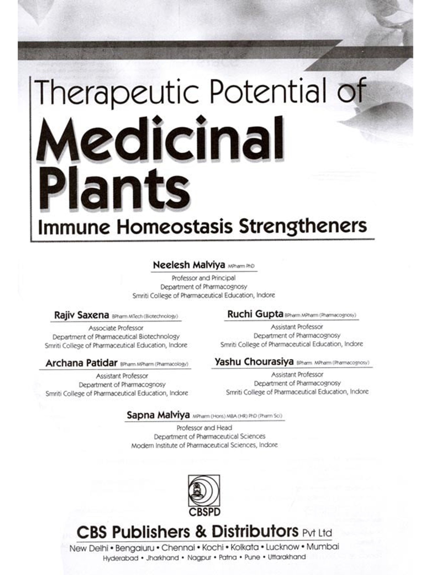 It is earnestly believed that the present book Therapeutic Potential of Medicinal Plants Immune Homeostasis Strengtheners shall fulfill the necessary requirement of students of various programs and universities and also to the researchers who intend to continue their research on medicinal plants, especially in immunology and desire to establish a strong base in the herbal formulation development may also find this compilation equally informative and useful.