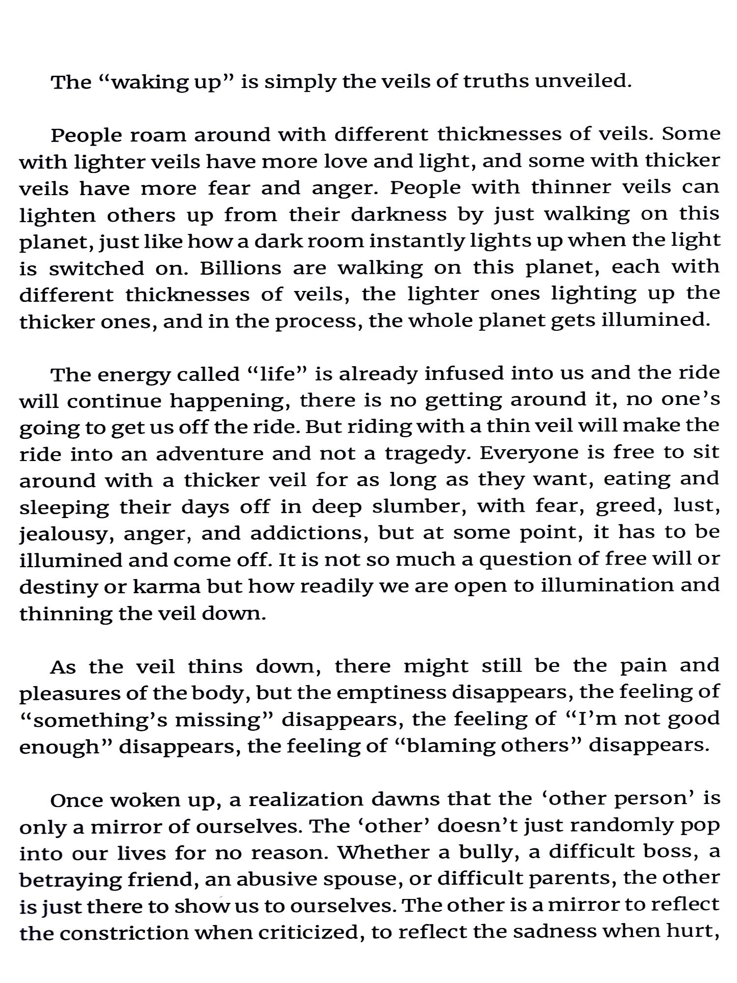 None of what is written in this book is new. Most are right in front of our eyes. Some pages may evoke a feeling, "Oh yes! That is so true! How did I miss it?" Some may even create a shift in awareness if we are ready.