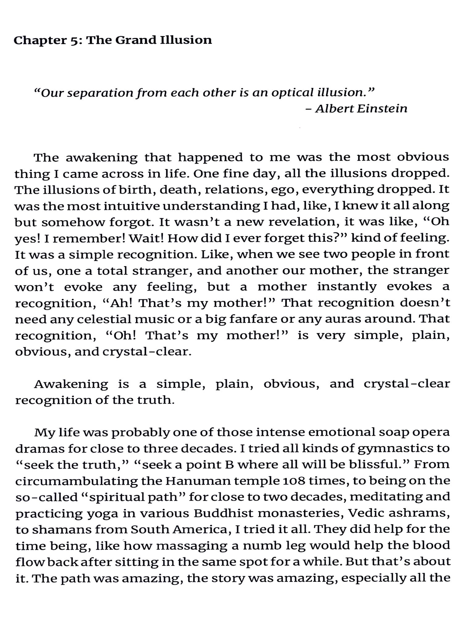 Anything that is written in this book may feel redundant. The only bottom line is that there is only this is-ness, the present moment. Every other sentence written in this book is going to go round and round and point only to this is-ness. All the life stories, 'Story Times, realizations, and everything else written in this book is only an attempt at pointing to this one truth from several dozen vantage points, which is, "There is no 'Point B.' The is-ness is all there is."