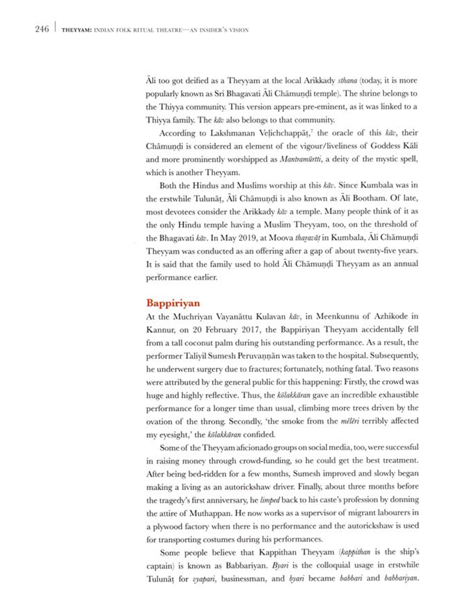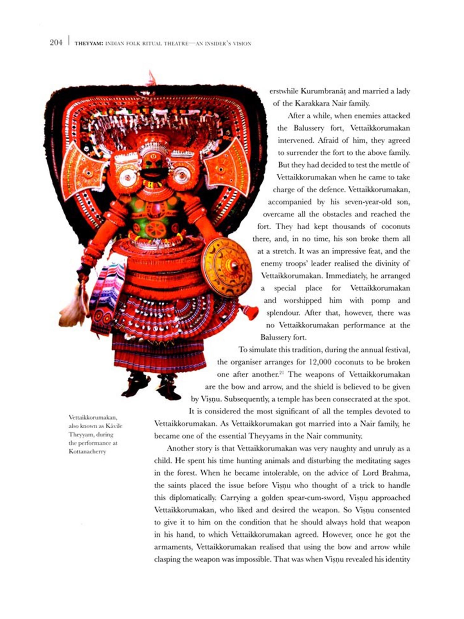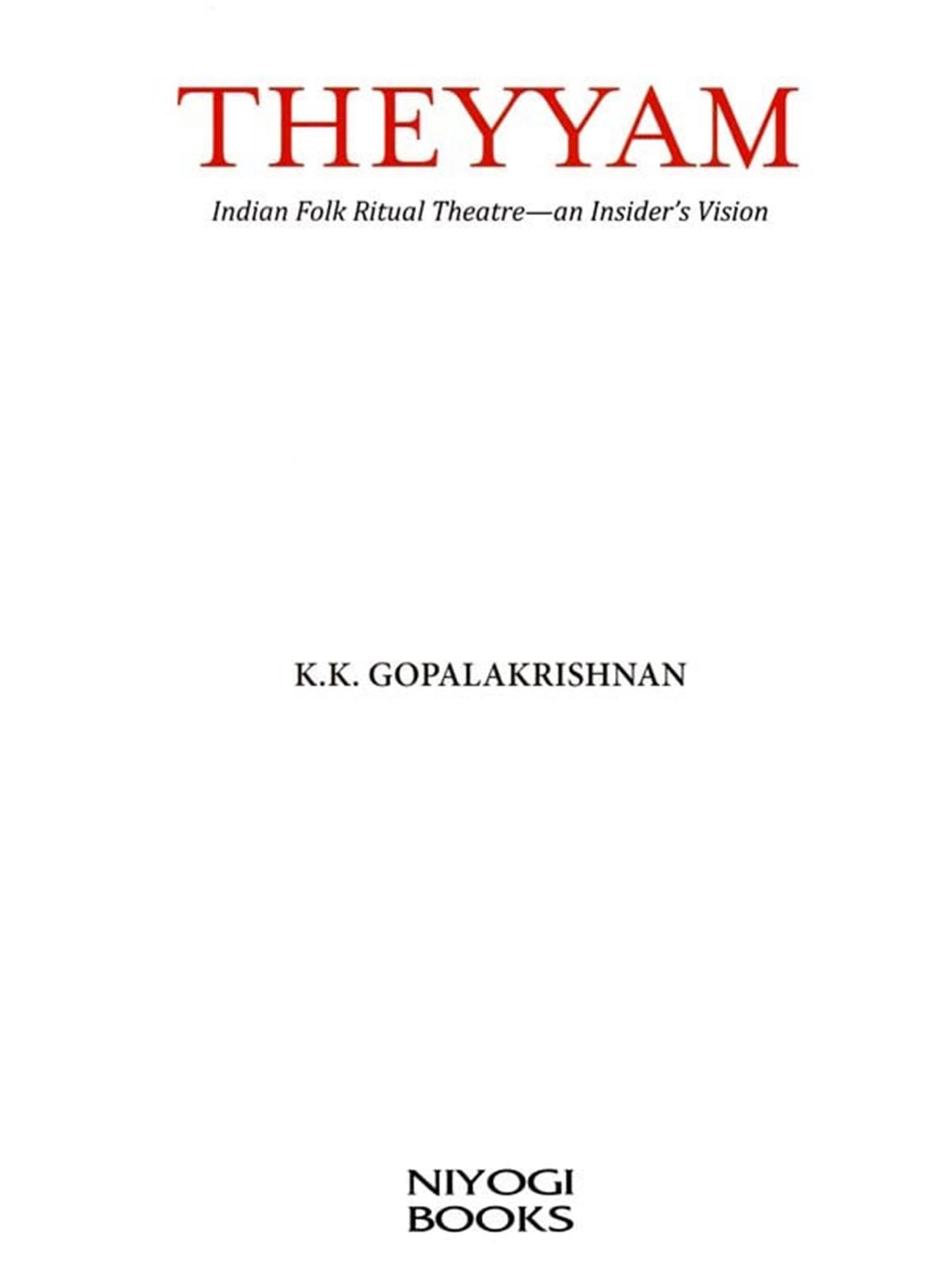 Theyyam being a 'Total Art Form', the research has to be accomplished from various angles of anthropology, history, language, theatrical/choreographical aspect, rituals, folklore, performance art, and plastic arts Nevertheless, a comprehensive study of all these has not been attempted so far. Hence, K.K. Gopalakrishnan's present volume from an insider's point of view is a welcome study on Theyyam.