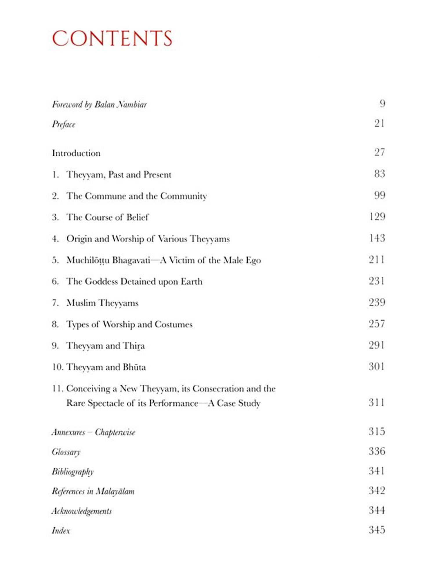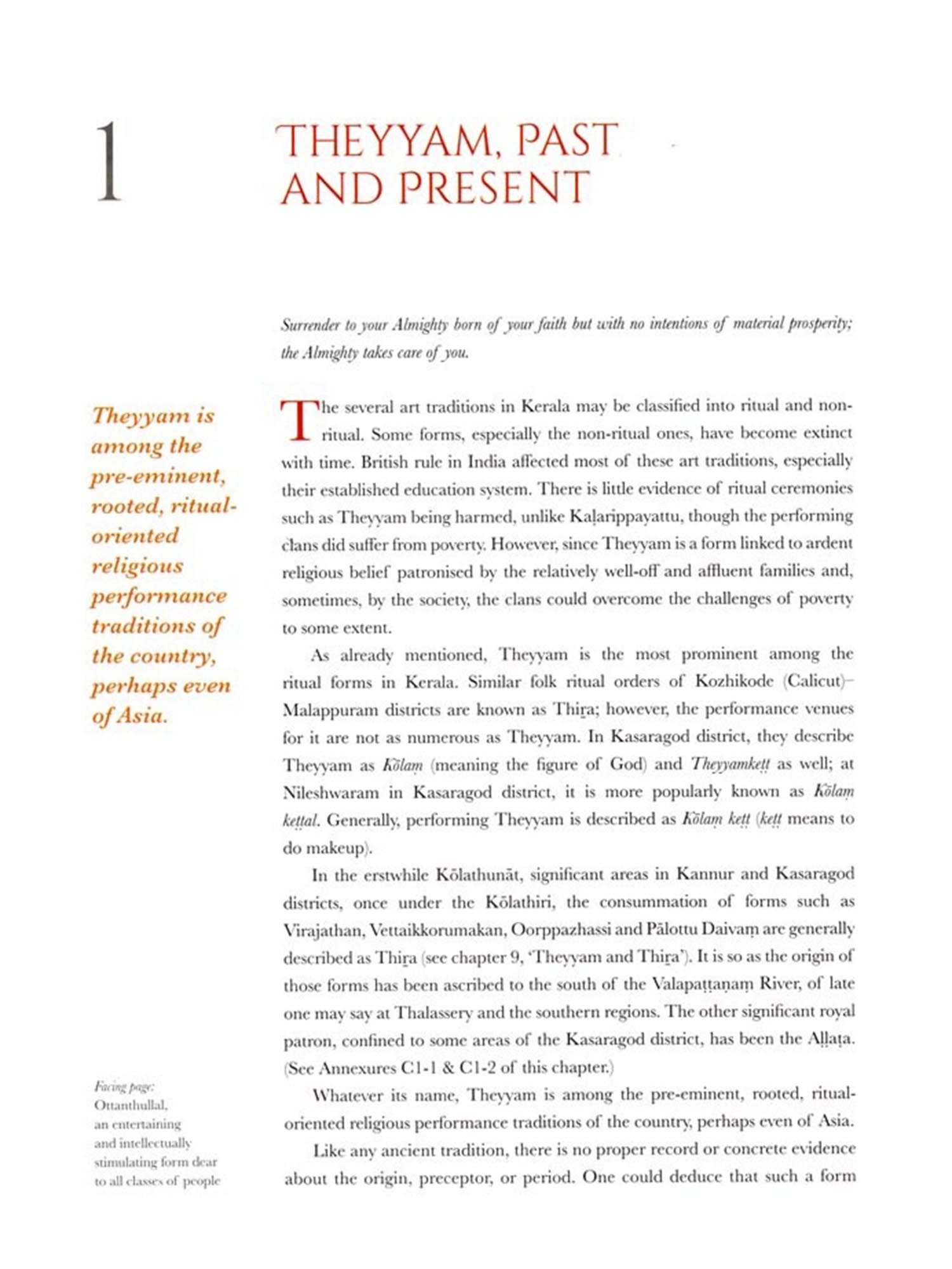 A reader of this book may well ask me why I chose to write it. There are about a hundred books on Theyyam in Malayalam. Far fewer in English. The books have been written for various purposesc for socio-anthropological study, dissertations, research grants, and to satisfy the curiosity of tourists with cursory information about the form. Bearing in mind the folk, ritual, social and theatrical elements of a form like Theyyam, its customs, and the factors behind the natural grooming of artistes, any writing on Theyyam by an 'outsider' is bound to have inherent limitations.