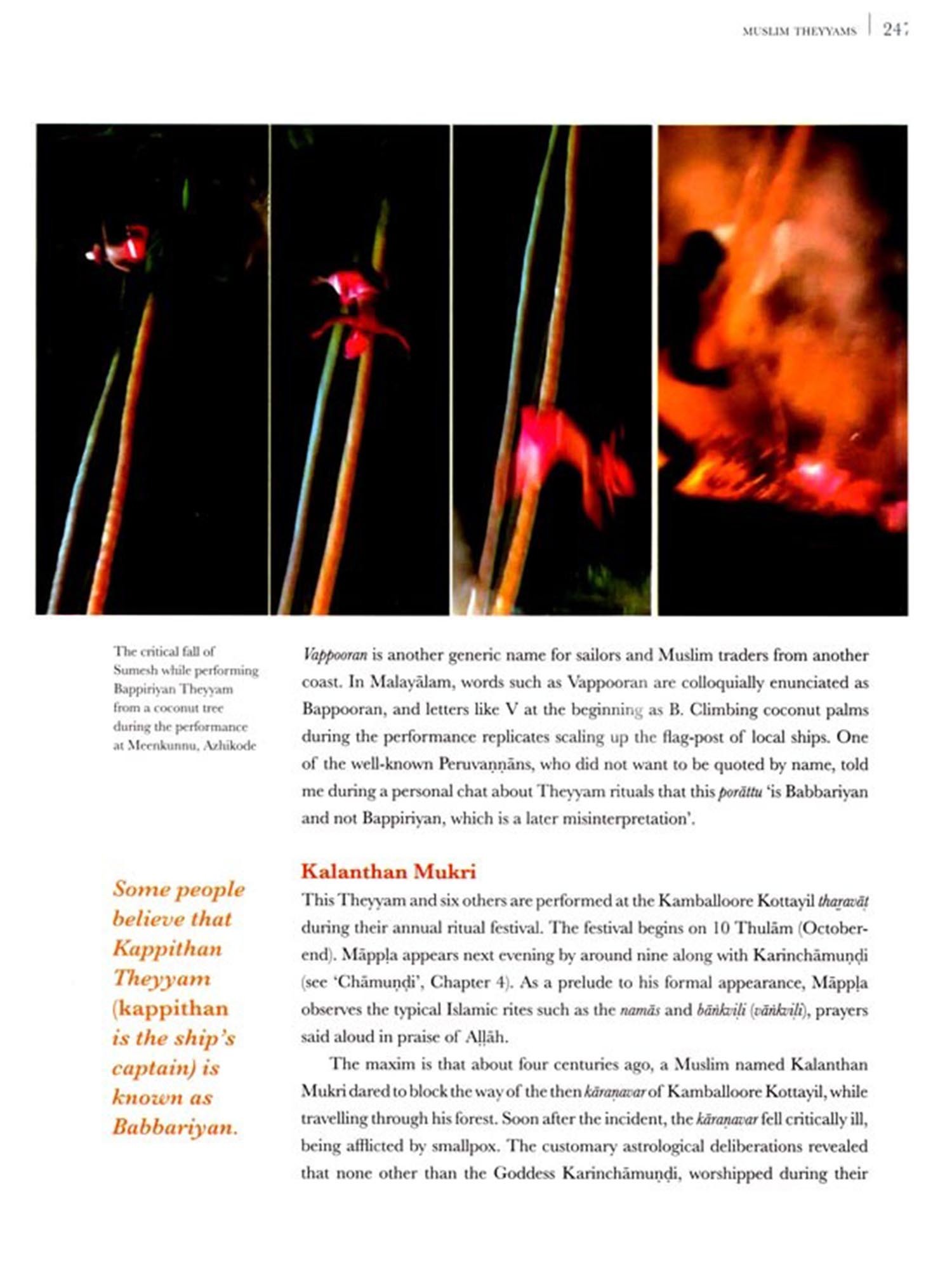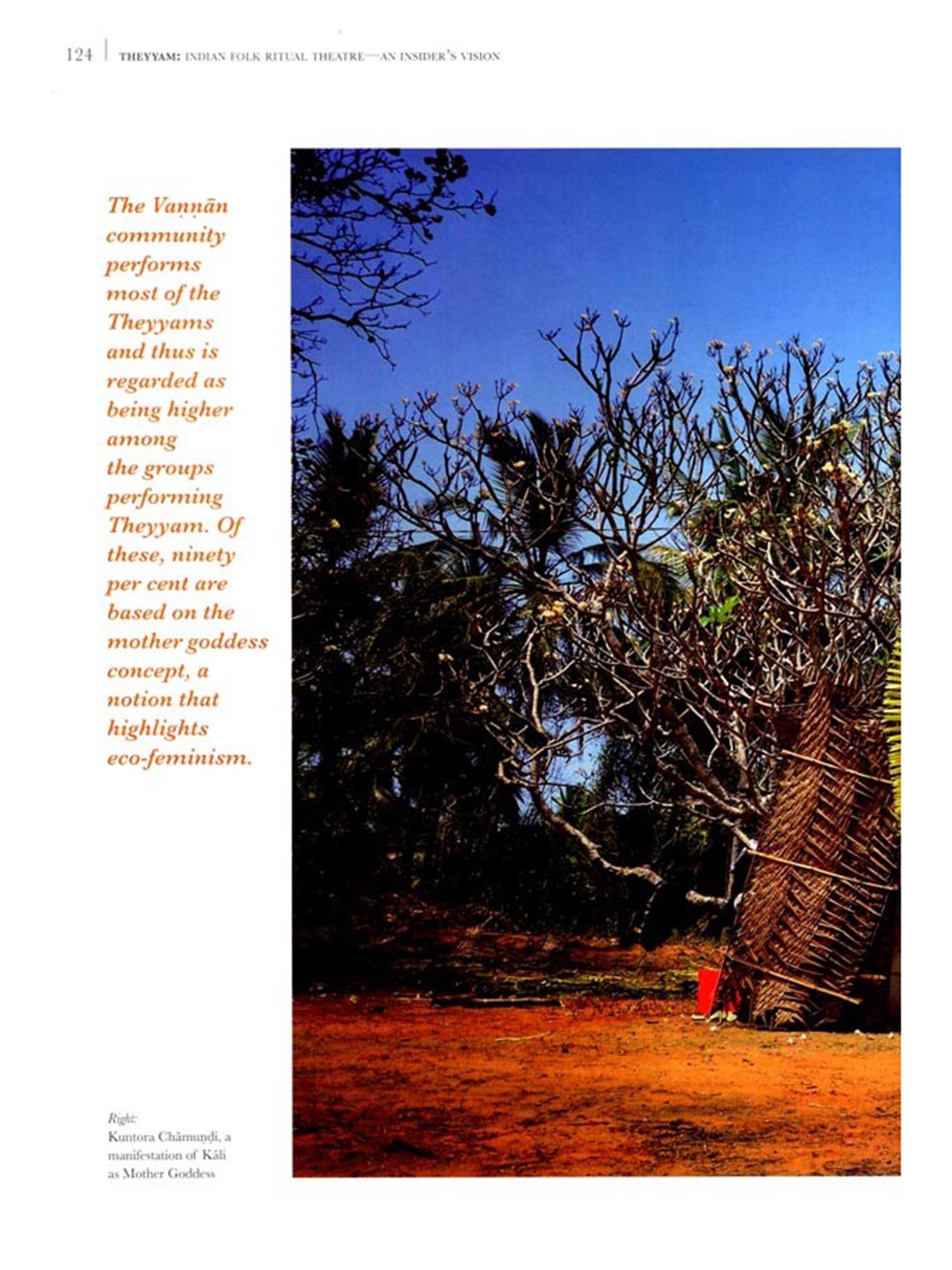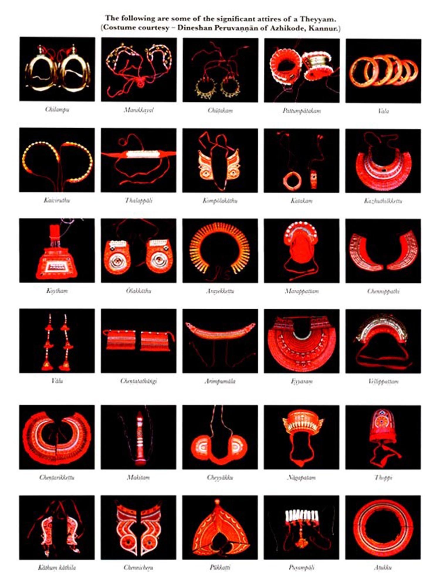 sounds or movements of the body, often forms the basis of the ritual. Using these as mediums of communication between the divinity and devotees and ...in the state of identification with the deity, the performers walk on fire or strike themselves with sharp swords, utter prophecies and spells to ward off famine and pestilence and give their blessings to the rural community The simple religious faith of the village folk supports them in their roles, seeking their benediction, believing in their pronouncements and fearing their warnings... The majority of these Theyyams are earth deities who protect the rural community and make it prosper. They do not live in the heavens above the clouds but on this red earth sharing it with their worshippers. Since the deities are here on earth, rural folk find them more approachable than the celestial beings, engage in dialogue with them, ask for favours from them, and even remonstrate with them.....Among these divinities are the deified ancestral spirits whose sphere of influence is confined to their descendants and families whom they protect and are worshipped. Some deities are supreme in their localities and are honoured only in that area while others have a wider prevalence.""