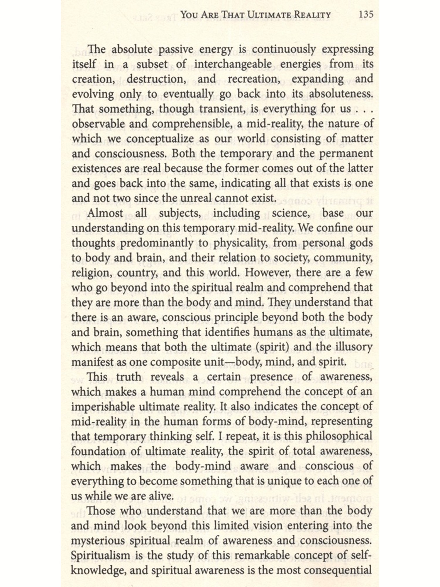 Our illusory existence of body and brain is fundamentally based on a temporary reality of me, mine, and myself. We do not seem to realize we are a unique reflection of not only the body and mind but also that of the spirit in unity and continuity. According to the subject of spiritualism, the spirit is the ultimate of who we actually are. It is that universal impersonal integrant contained in an individual soul, which we so liberally use but, in reality, do not bother to know what it is or what role it plays in our personal life. Our body and mind appear and disappear into that absolute constituent from where they materialize and dematerialize. However, individuality or that uniqueness guided by the consciousness-leaves behind a certain legacy after death. the sum of our deeds for all to remember. Therefore, it is imperative for us to know what this third faculty is about because, despite all the material and social comforts, it is difficult for the mind to be at peace unless it comprehends what this conscious principle is all about.
