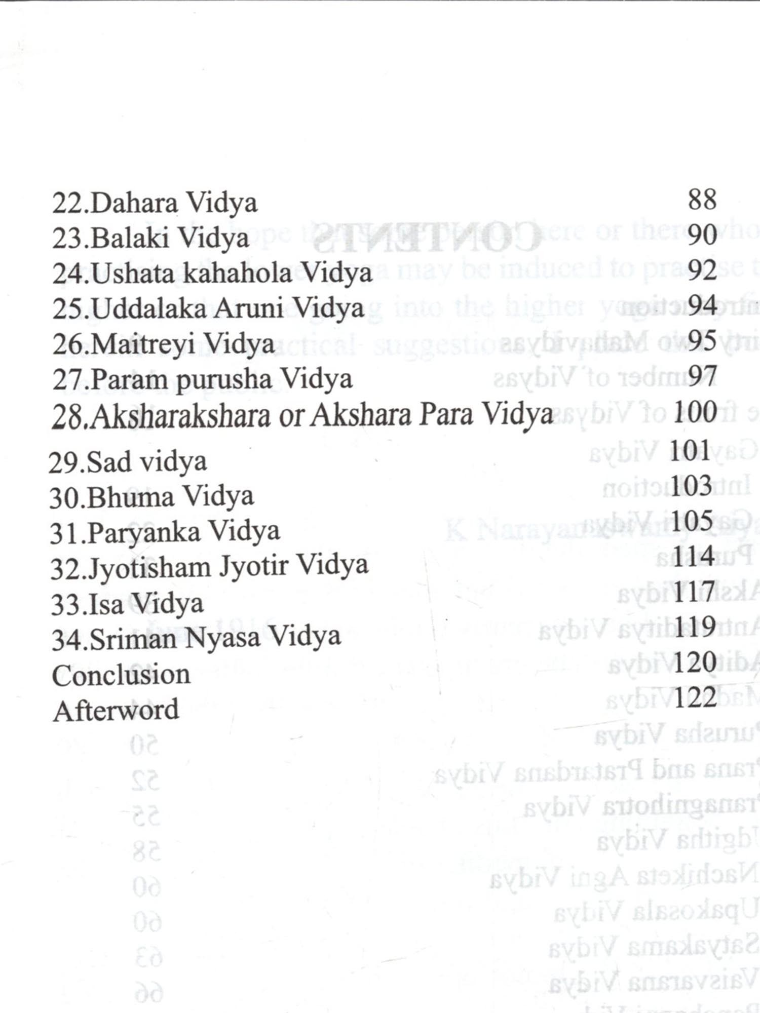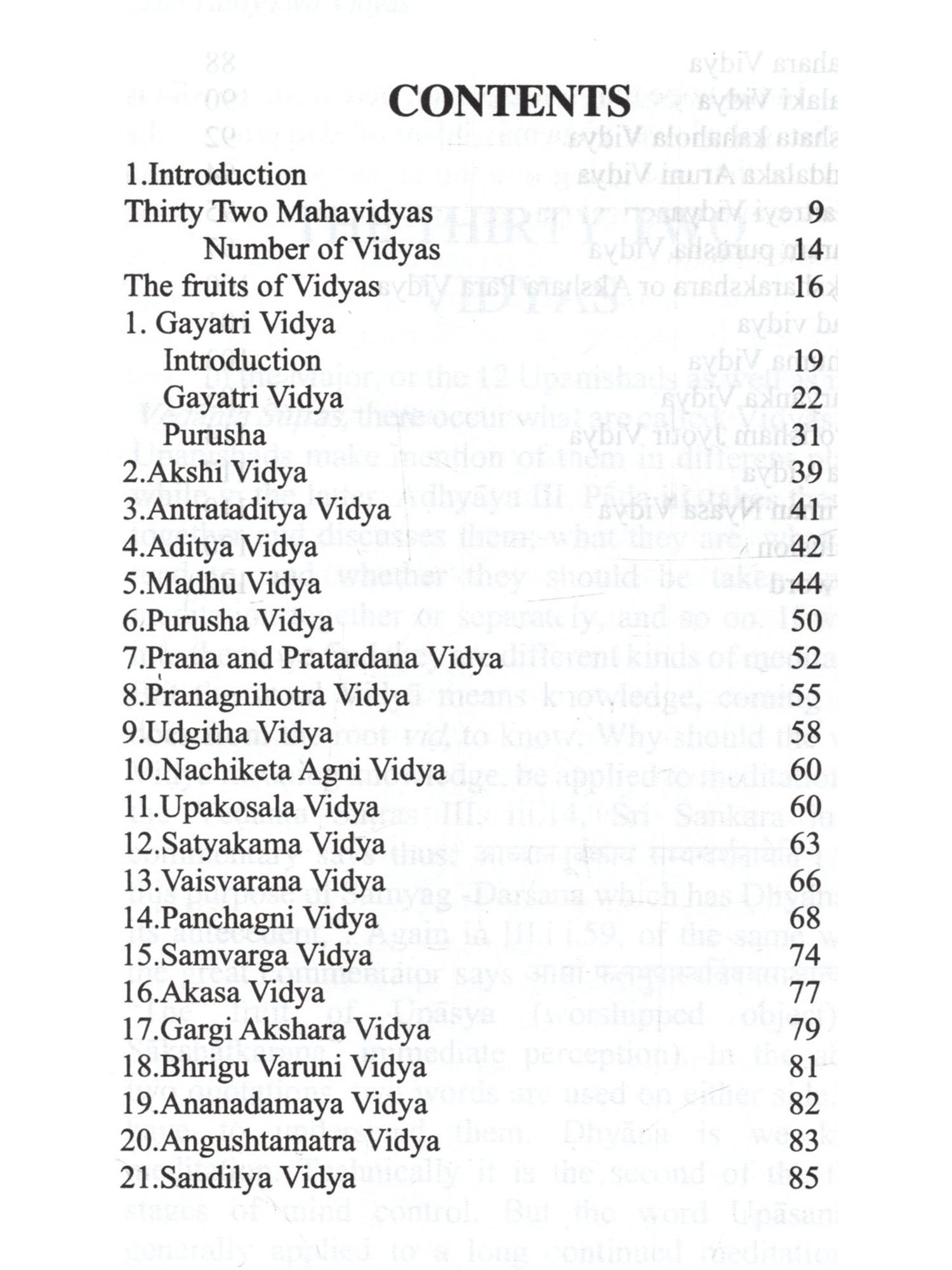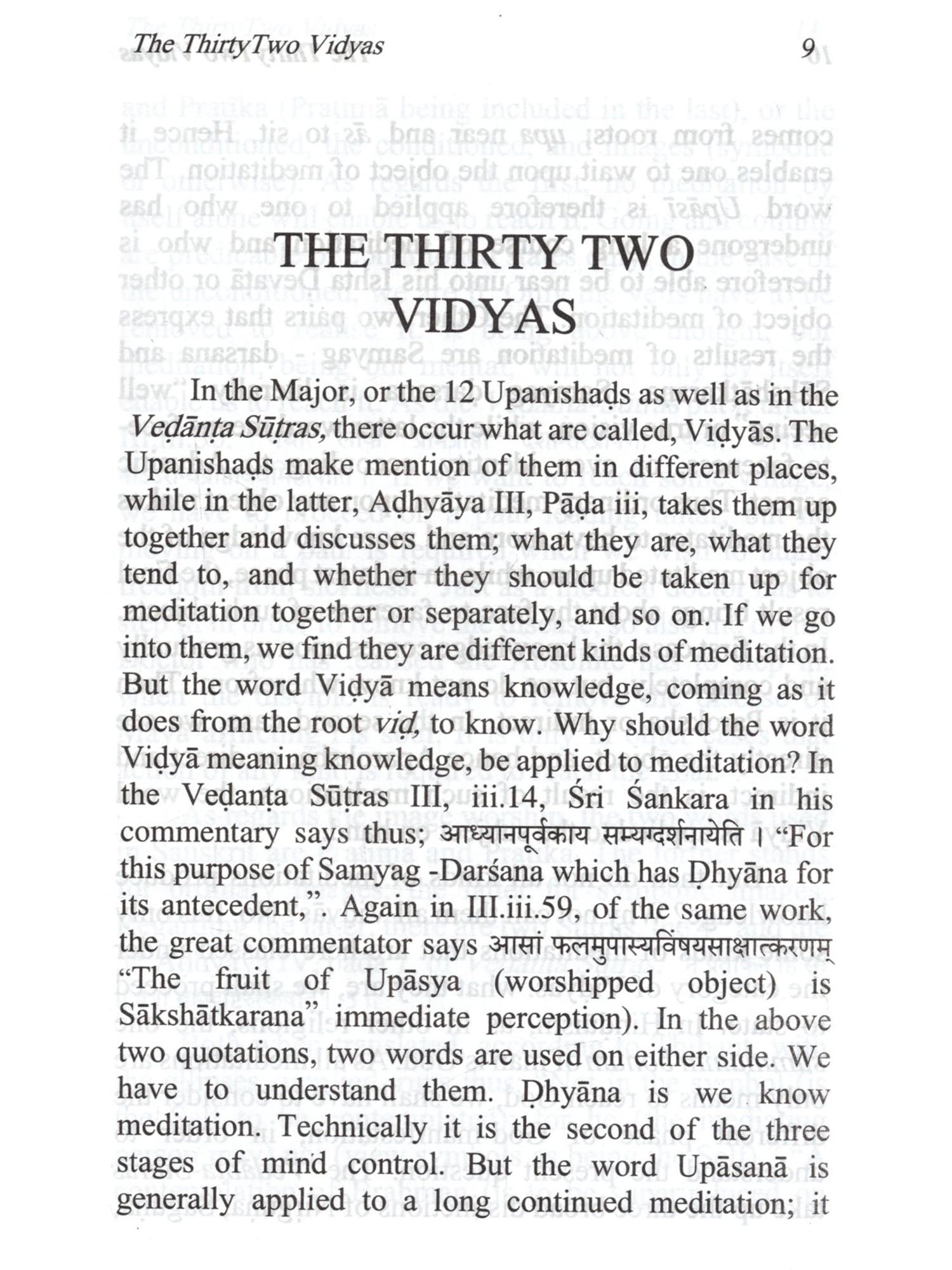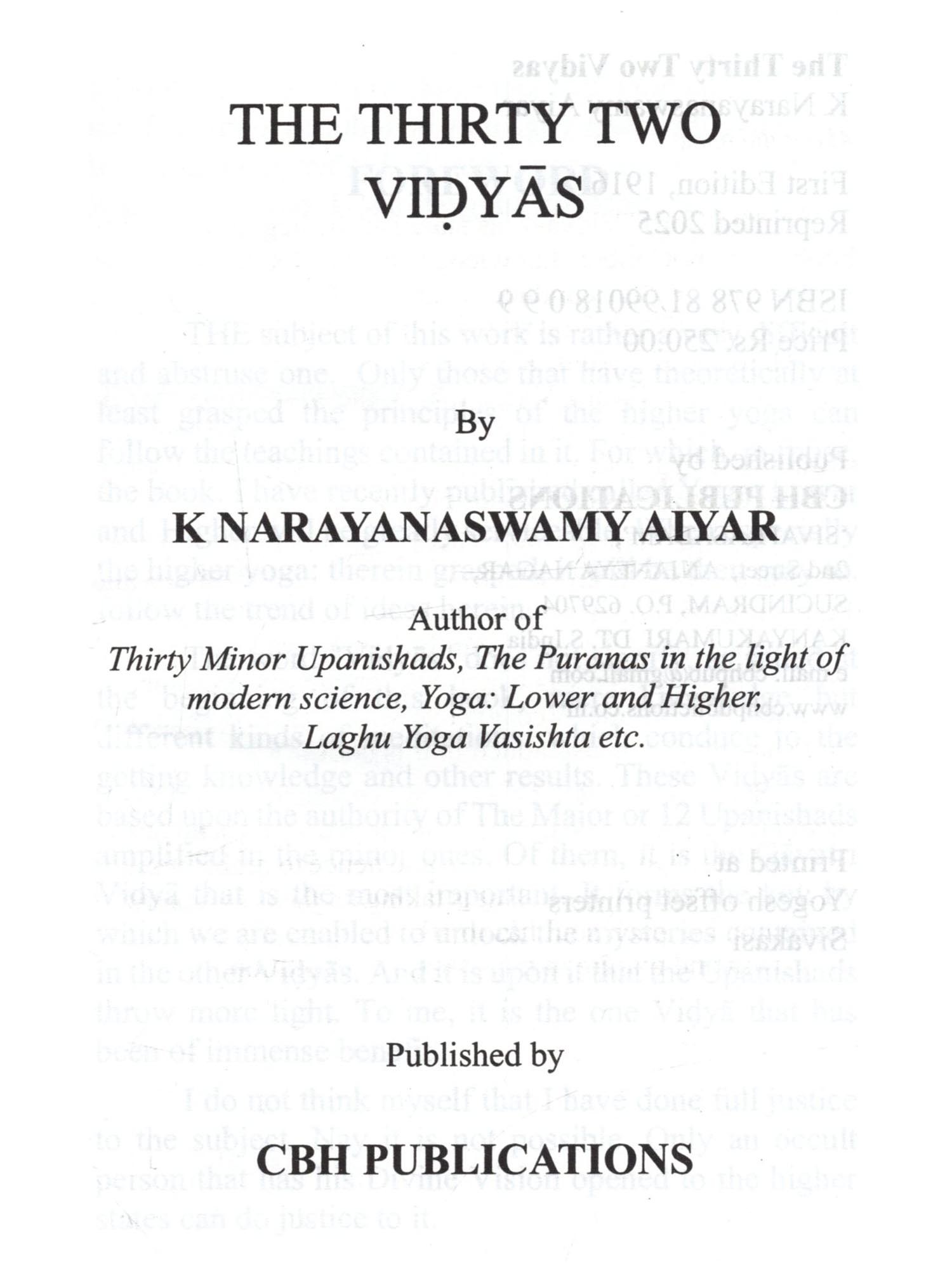 The word "Vidyas", as stated at the beginning of this book, are not mere knowledge but different kinds of meditations, which conduce to getting the knowledge and other results. These Vidyäs are based upon the authority of The Major or 12 Upanishads amplified in the minor ones. Of them, it is the Gayatri Vidya that is the most important. It forms the key by which we are enabled to unlock the mysteries contained in the other Vidyās. And it is upon it that the Upanishads throw more light. Of the Thirty two vidyās, those of Prana and Prațardana have been treated of as one in this work, while Prānāgnihotra which is related to Vaiśvānara Vidyā has been dealt with separately, as it is an important subject by itself. To the Thirty two vidyās which Sri Sankara mentions in his commentary on the Vedanta Sutras, viz., Udgātha and Purusha vidyās are also added in this book. The vidyās are, as said above, different kinds of meditation. They are meant for advanced souls who scales from the third world to the fourth and hence to higher worlds, till they reach the highest. But is taking up the different kinds of meditation, each soul has to adopt one which is suited to its growth and mature in the scheme of evolution.  The Vidyas are not mere knowledge of different kinds of Meditation. These Vidyas are based on the authority of The major 12 Upanishads amplified in minor ones. Of them, Gayatri Vidya is considered as the most important one. And it is upon it that the Upanishads throw more light. The vidyas are said to be of different kinds of meditation. They are meant for advanced souls from the this materialistic world to reach the higher world. By taking to different kinds of meditation, one adapts to one, suited to his growth and mature scheme of evolution. Contains descriptive details of the Thirtytwo Vidyas as sourced from different Upanishads and its importance and its relevance to different modes of meditation.