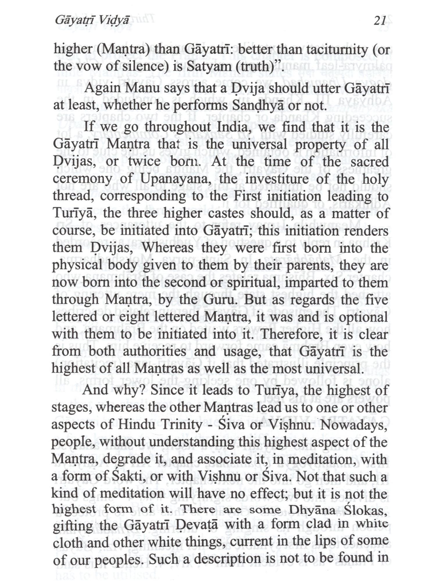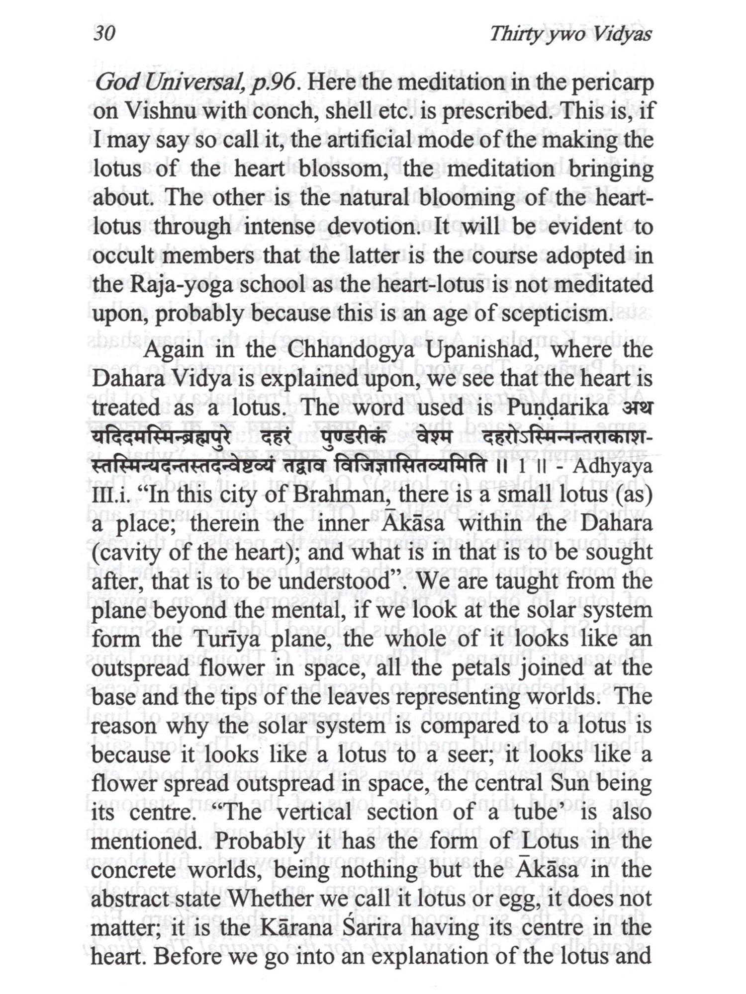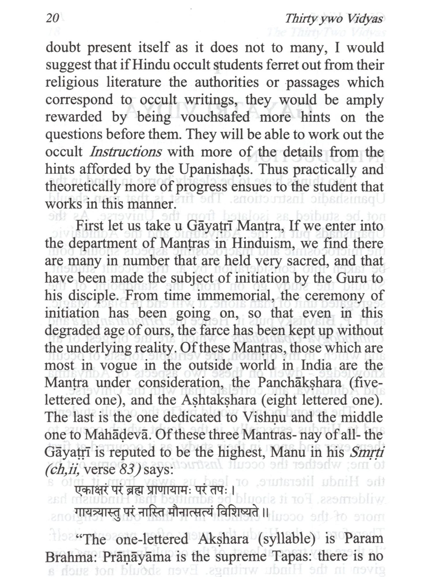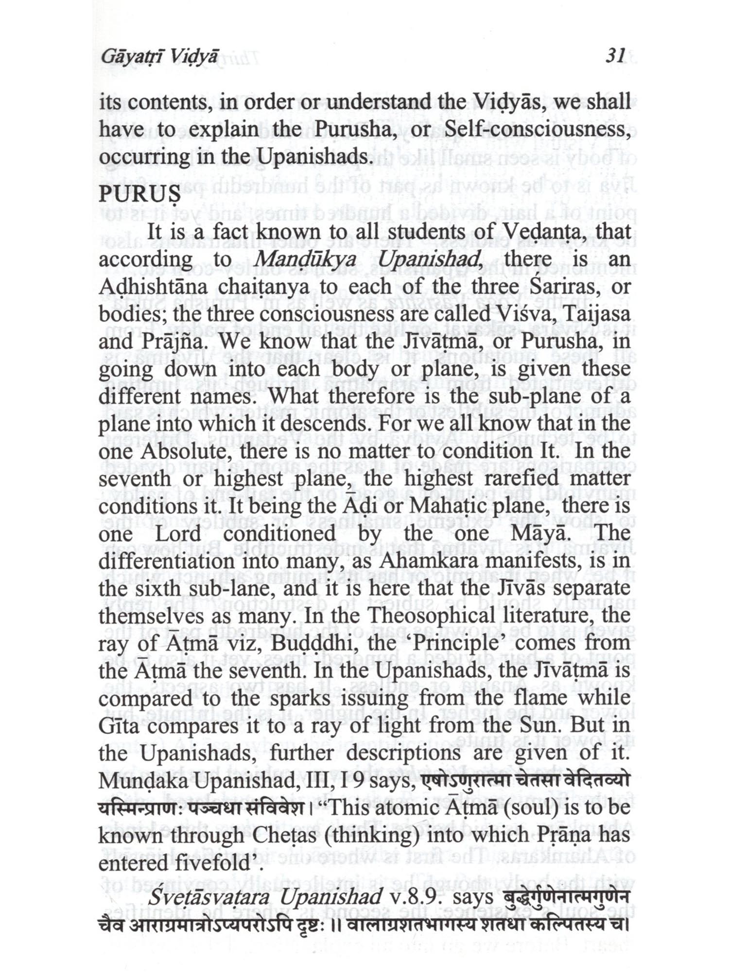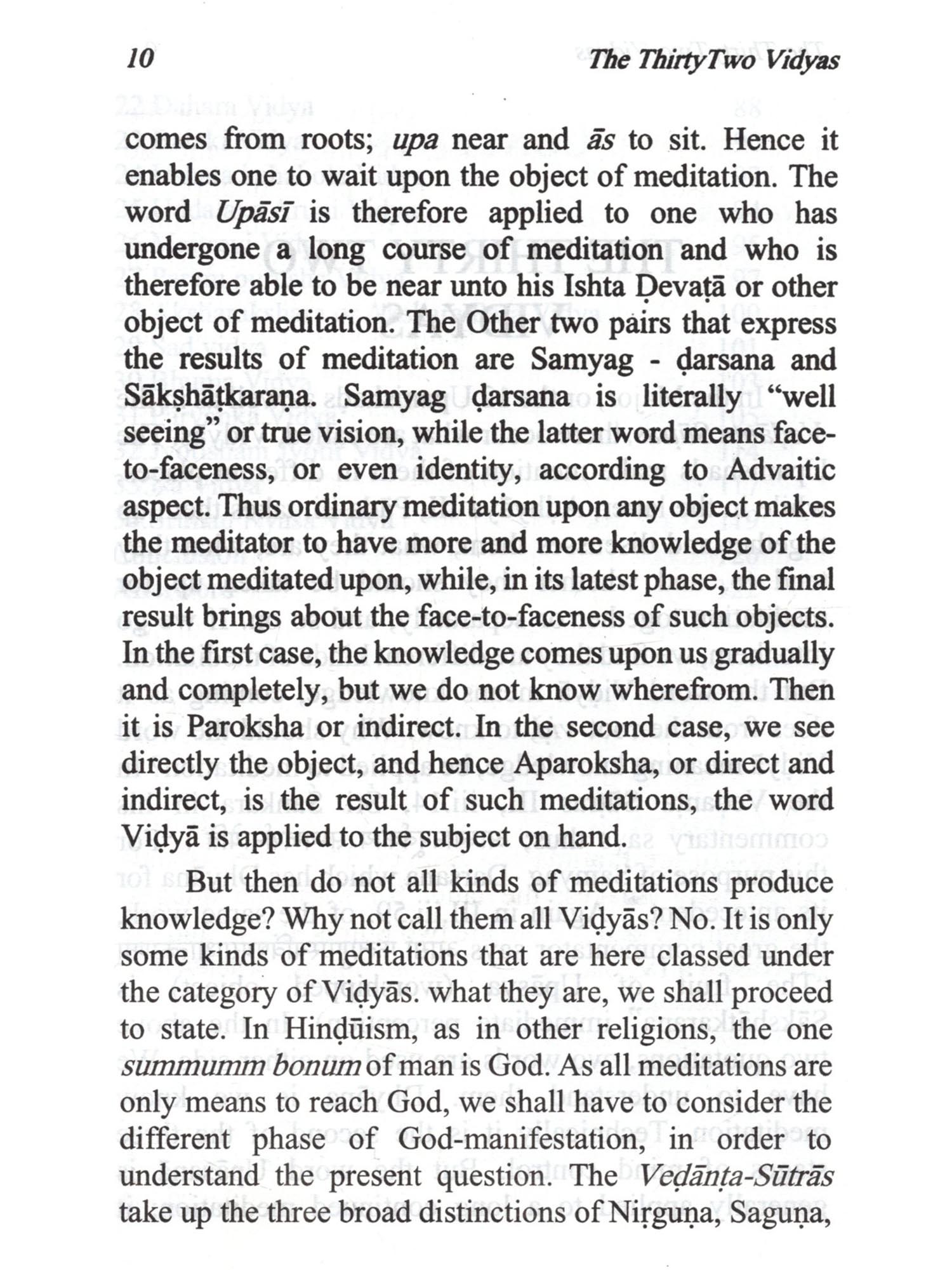 The word "Vidyas", as stated at the beginning of this book, are not mere knowledge but different kinds of meditations, which conduce to getting the knowledge and other results. These Vidyäs are based upon the authority of The Major or 12 Upanishads amplified in the minor ones. Of them, it is the Gayatri Vidya that is the most important. It forms the key by which we are enabled to unlock the mysteries contained in the other Vidyās. And it is upon it that the Upanishads throw more light. Of the Thirty two vidyās, those of Prana and Prațardana have been treated of as one in this work, while Prānāgnihotra which is related to Vaiśvānara Vidyā has been dealt with separately, as it is an important subject by itself. To the Thirty two vidyās which Sri Sankara mentions in his commentary on the Vedanta Sutras, viz., Udgātha and Purusha vidyās are also added in this book. The vidyās are, as said above, different kinds of meditation. They are meant for advanced souls who scales from the third world to the fourth and hence to higher worlds, till they reach the highest. But is taking up the different kinds of meditation, each soul has to adopt one which is suited to its growth and mature in the scheme of evolution.  The Vidyas are not mere knowledge of different kinds of Meditation. These Vidyas are based on the authority of The major 12 Upanishads amplified in minor ones. Of them, Gayatri Vidya is considered as the most important one. And it is upon it that the Upanishads throw more light. The vidyas are said to be of different kinds of meditation. They are meant for advanced souls from the this materialistic world to reach the higher world. By taking to different kinds of meditation, one adapts to one, suited to his growth and mature scheme of evolution. Contains descriptive details of the Thirtytwo Vidyas as sourced from different Upanishads and its importance and its relevance to different modes of meditation.