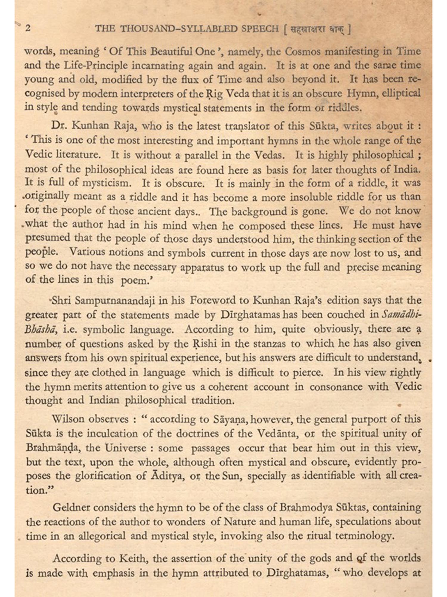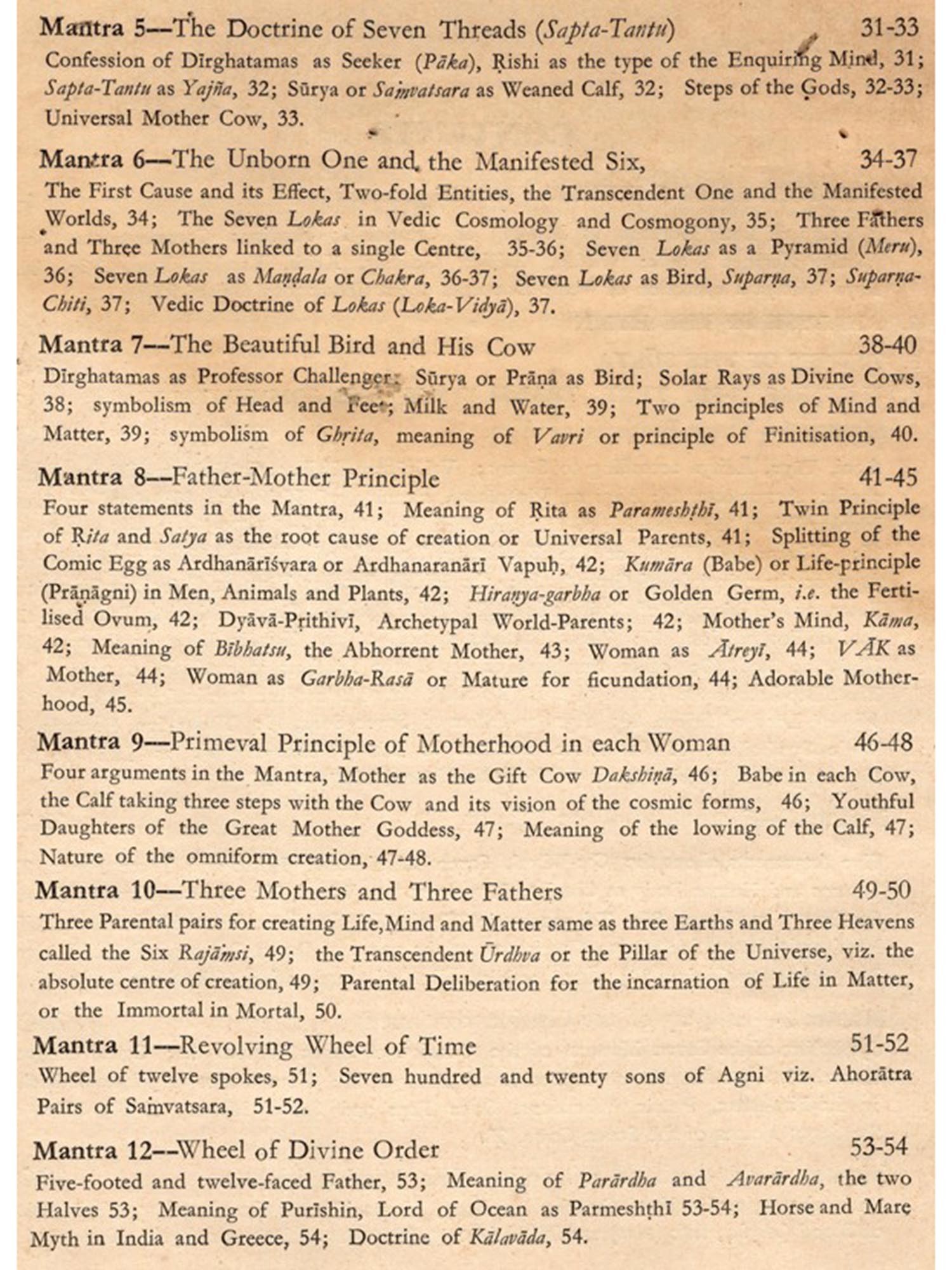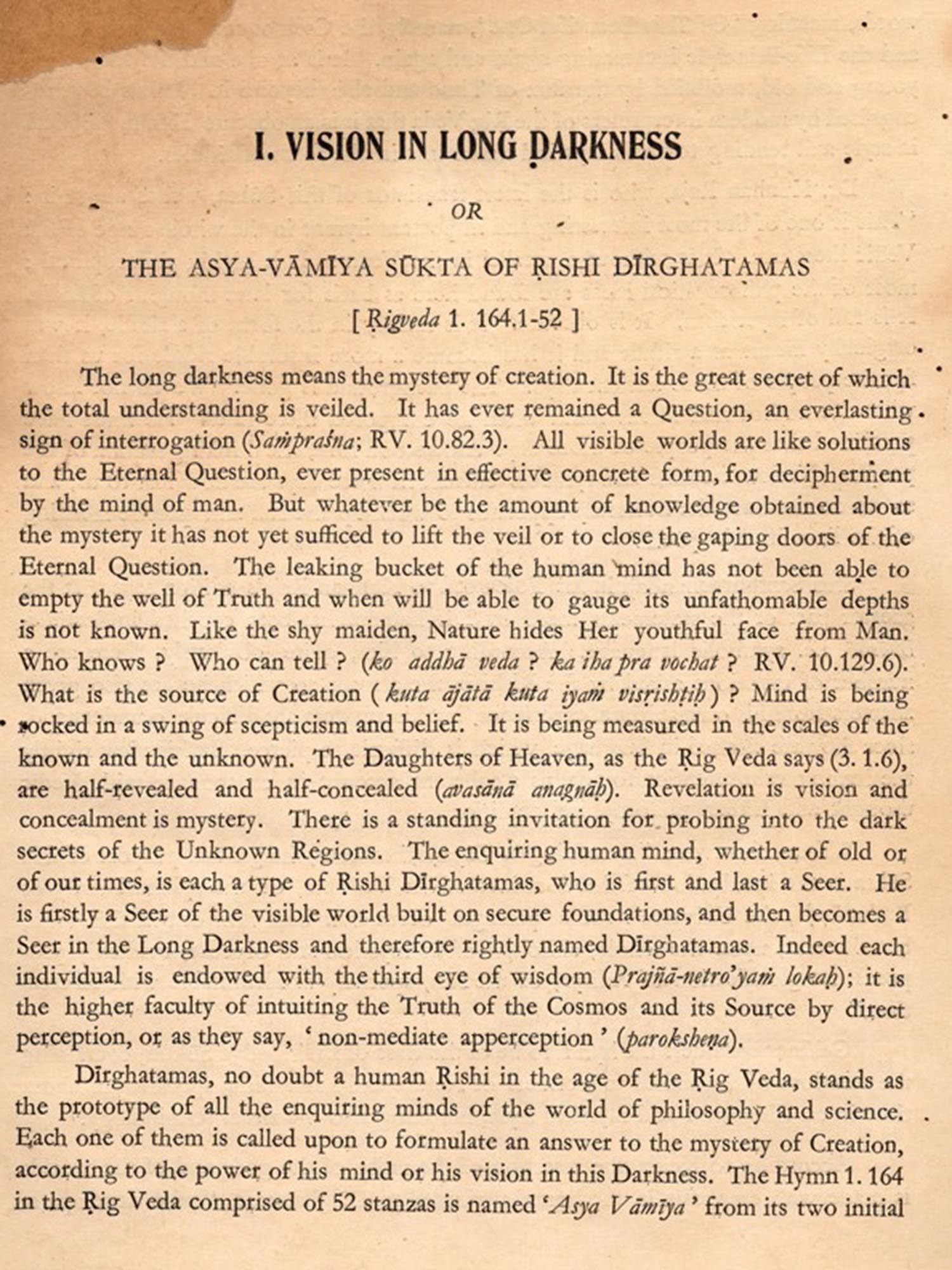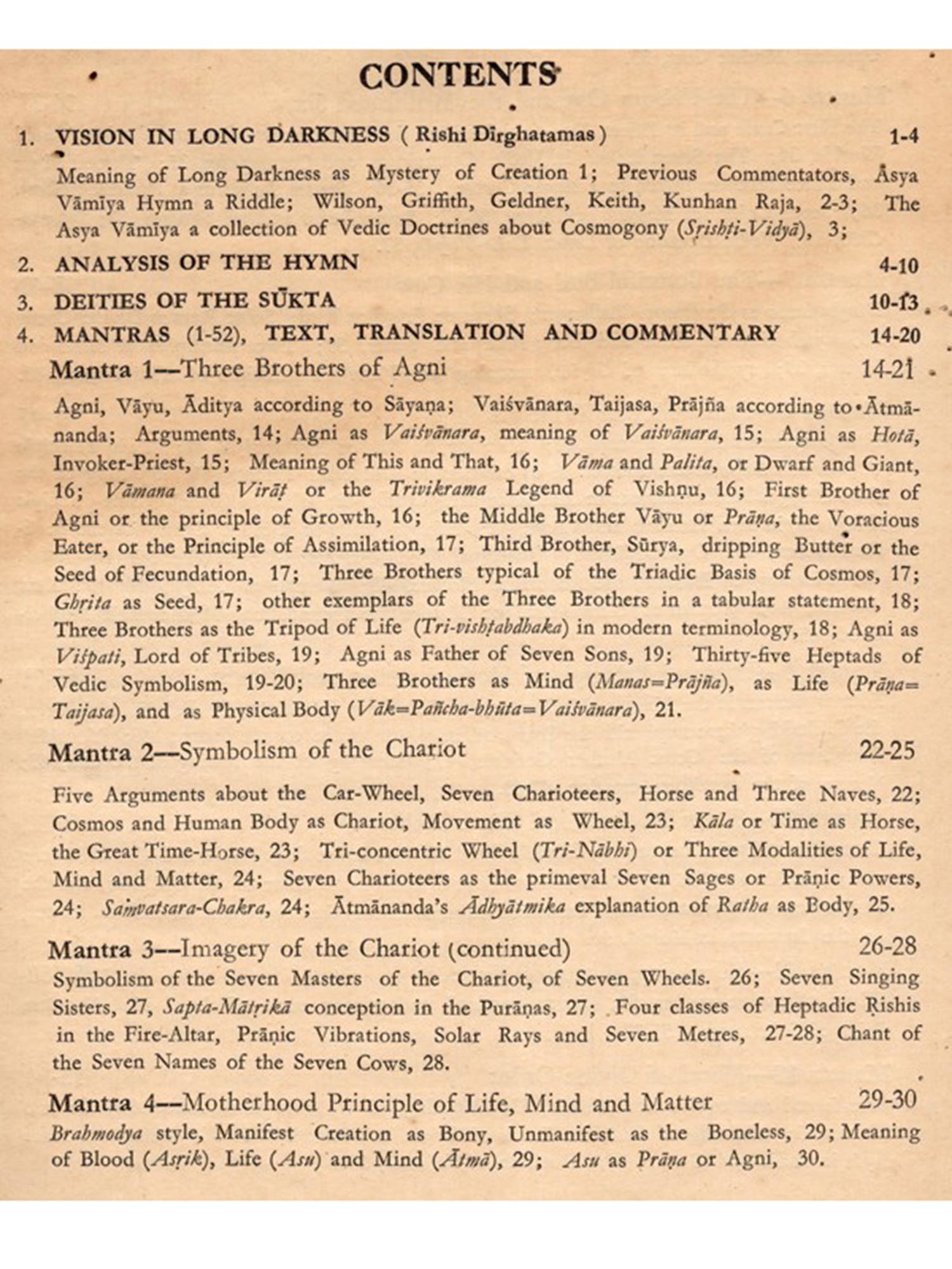 Dirghatamas was a thinker of the Vedic age, naturally his ebullitions are cast in the thought-moulds of his time. But easily shorn of theit veneer, as attempted in this commentary, they are eloquent with a world-language of which the meaning belongs to mankind.