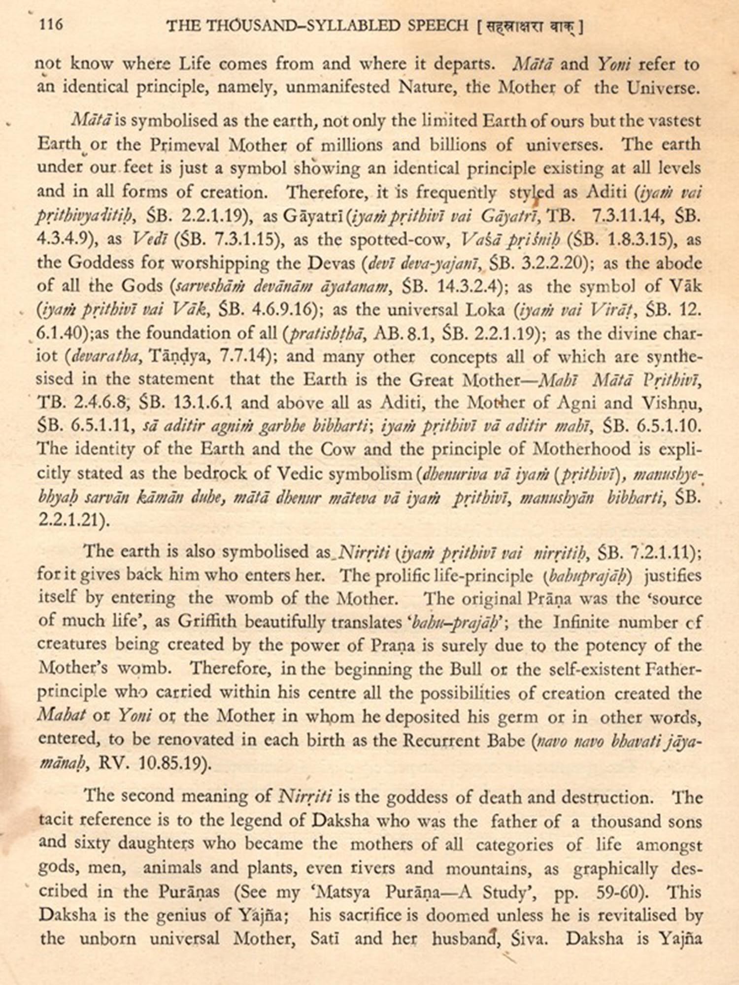 This language is that of Nature itself in the form of the created objects, each of which conceals the Great Mystery at the core of its existence, which has to be recovered there (bhuteshu bhuteshu vichitya dhtrah, KU. 2.5). We now study it as the language of symbols; the ancients looked upon it as Nidina Vidyd, e.g. they think of the prapie power of Gayatri and see it visible in the Flaming Fire, and accept Agni as the symbol of Gayatri (jo raatragnir Gayatri sanidanena, SB. 1.8.2.15).