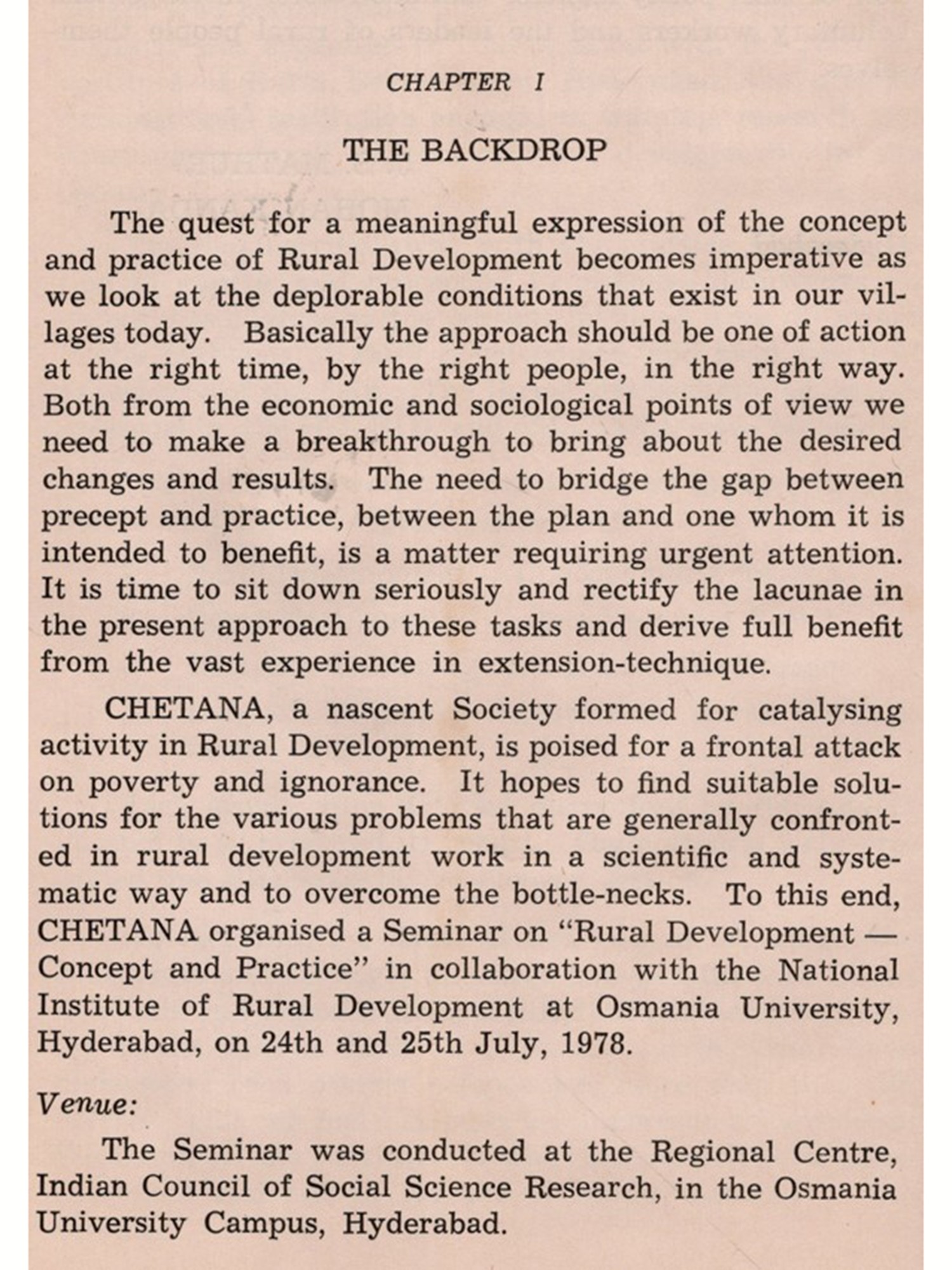 CHETANA, which is a product of this restless quest, is aimed at finding a way through for reorientation of concept and philosophy, planning and successful implementation of rural development programmes. As an initial step, keeping in view its main objective of bringing together various people concerned with rural development for a unified effort, CHETANA organised a seminar on "Rural Development Concept and Practice."