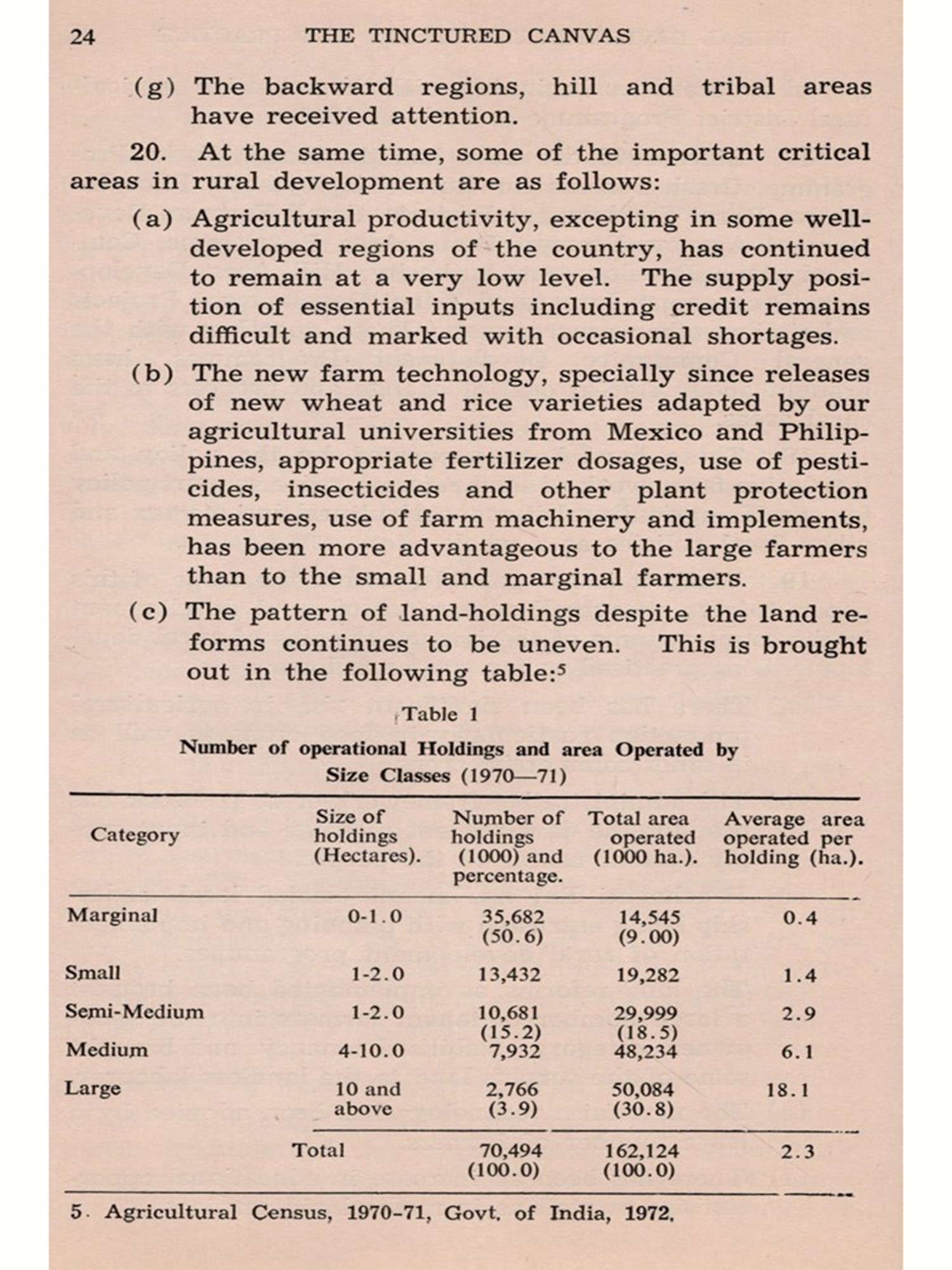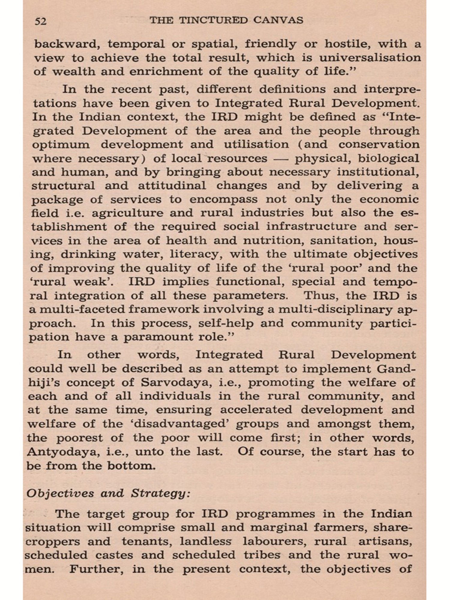 The present publication "The Tinctured Canvas -Concept Practice and Strategies in Rural Development"brings together the theme papers, articles, addresses and group recommendations of the Seminar organized in July, 1978 by Chetana in collaboration with the National Institute of Rural Development. Eminent national leaders, voluntary workers, administrators and members of the academic community have very perceptively brought out the important features in this endeavour. An analysis of the material shows a deep understanding of the newer approaches to better theoretical formulations of the under-currents of socio-economic forces, coupled with practical insights into workable plans of action and the administrative reorganization for facilitating economic and social betterment of the poverty-stricken masses in our country.