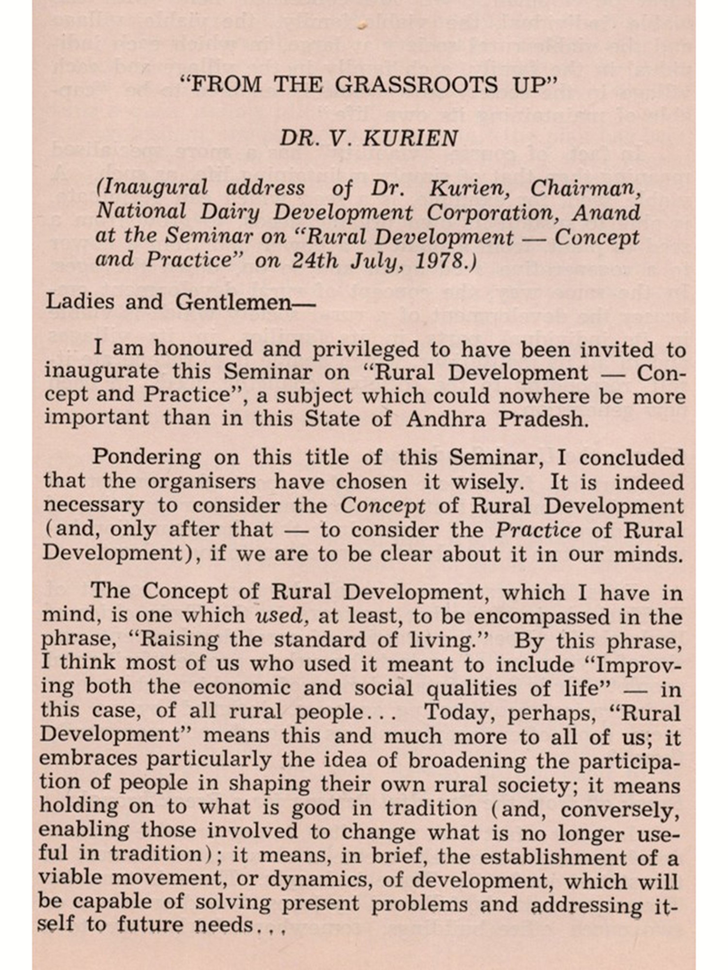 Invited to this Seminar were people associated with policy-making in Government, representatives of banks, as well as those who are charged with implementation of the policies, side by side with voluntary organisations who have put in a lot of effort in this field. The CHETANA Society is indebted to the Governor and the Chief Minister of Andhra Pradesh, who lent their support to the project. Eminent personalities, including Sri Parakala Seshavataram, the Hon'ble Minister for Rural Development, Dr. V. Kurien, Sri Burra Venkatappaiah, Dr. Y. Nayudamma, Sri I. J. Naidu, Chief Secretary to Government of Andhra Pradesh, Sri K. K. Shah, Dr. G. Ram Reddi, Dr. B. C. Muthayya, Shri Sanjit Roy, Father Windey, and many others who participated, lent lustre to the Seminar. The Seminar was organised in collaboration with the National Institute of Rural Development, Hyderabad, the premier national-level institution engaged in training, research and consultancy in all aspects of rural development in the country.