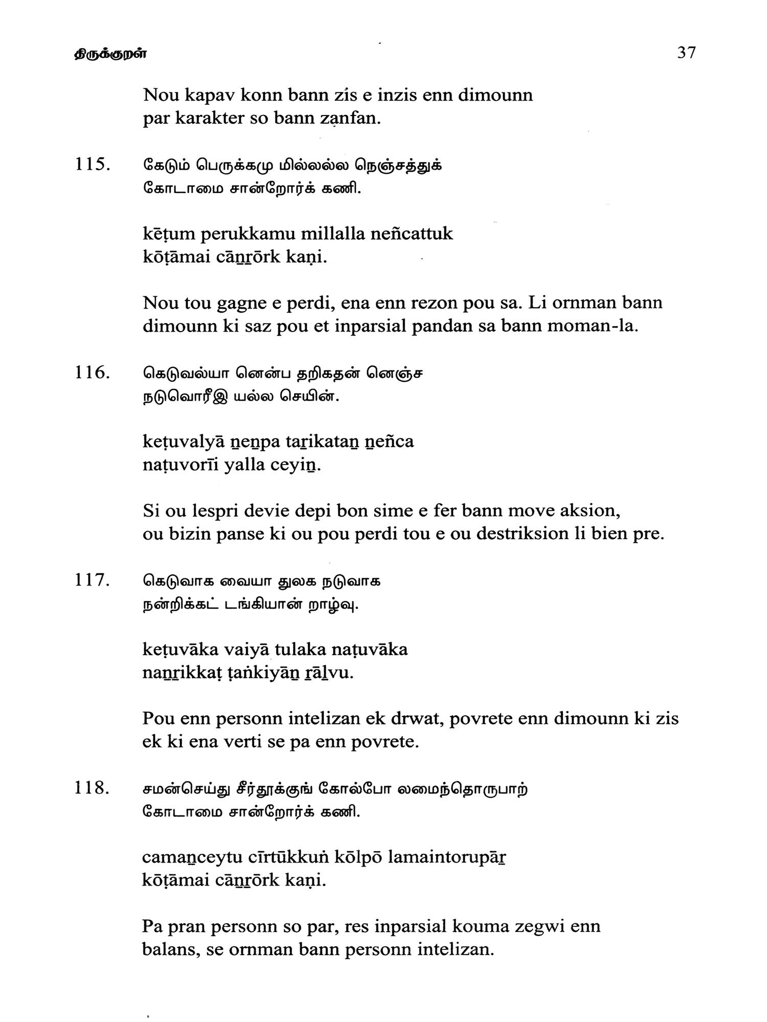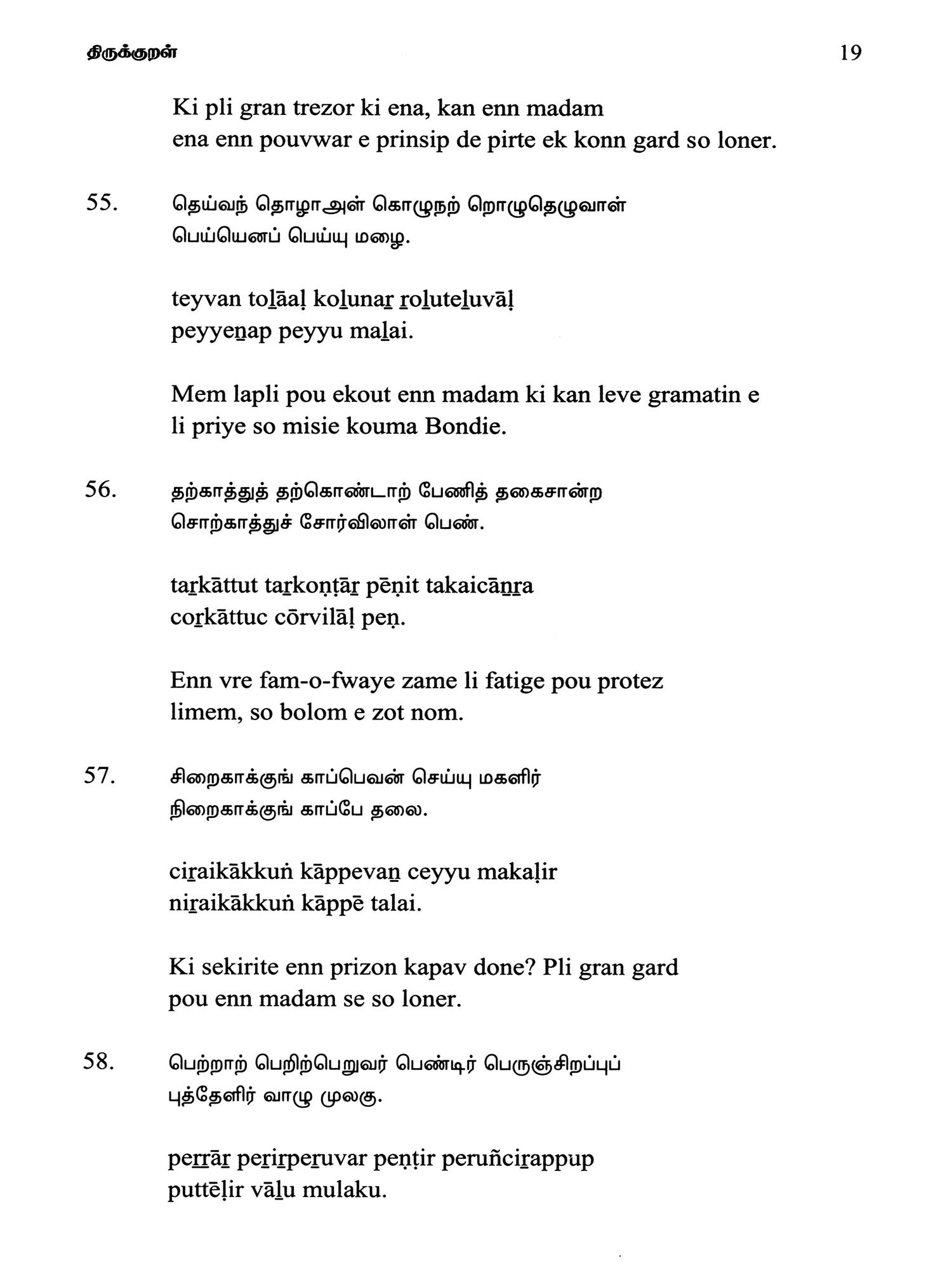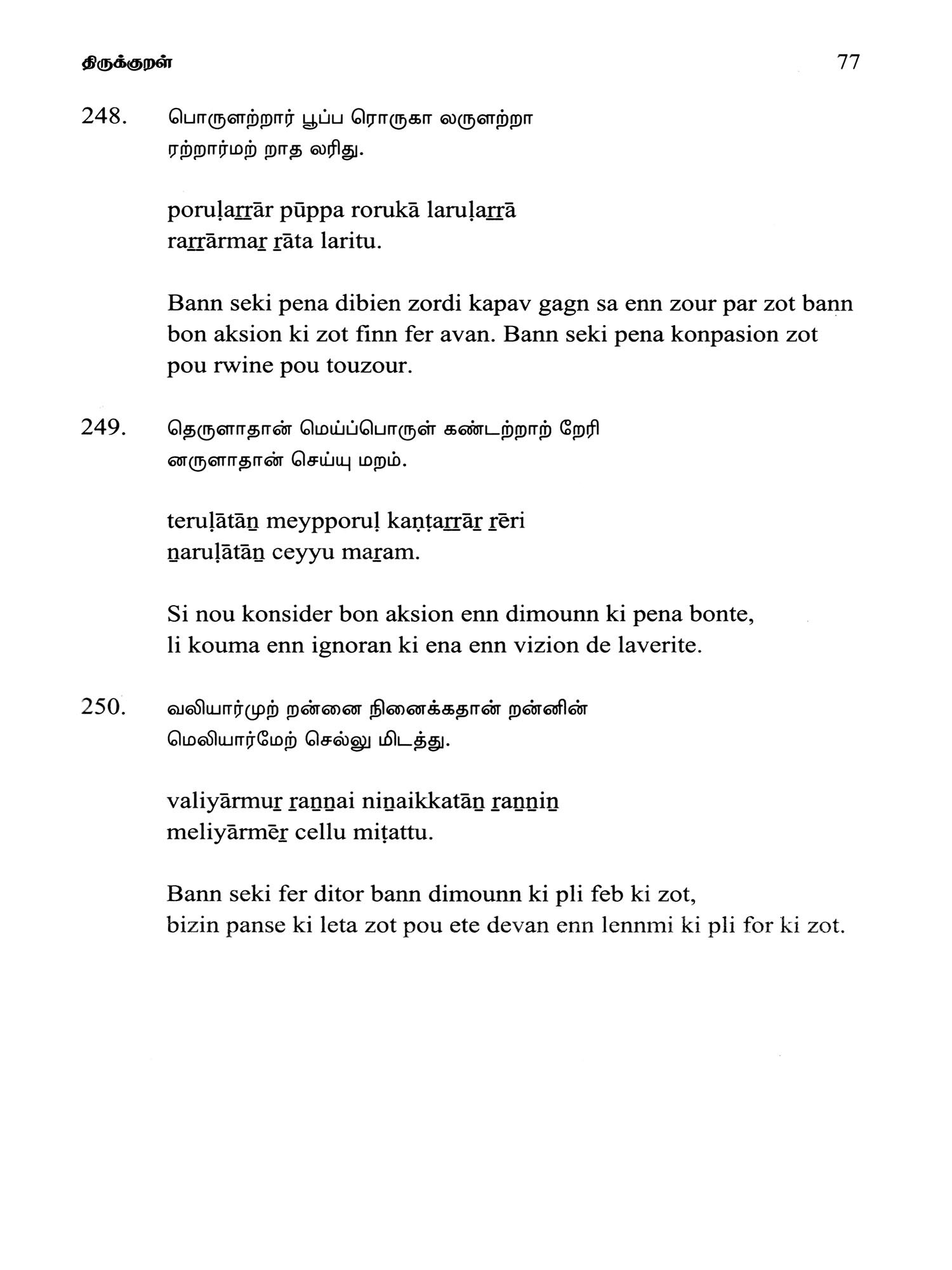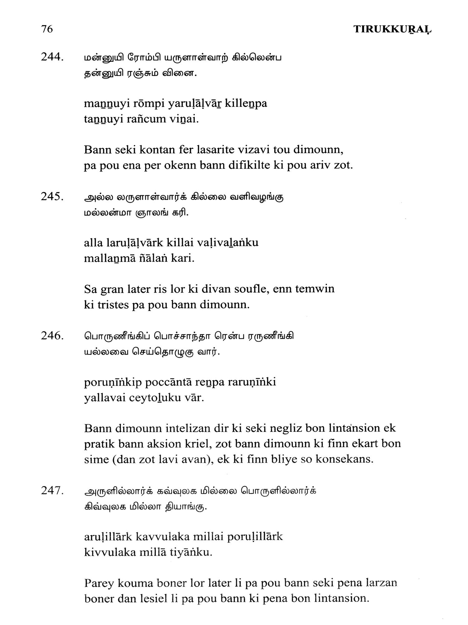 Language: Tamil Text with Transliteration and KREOL (Morisien) Translation