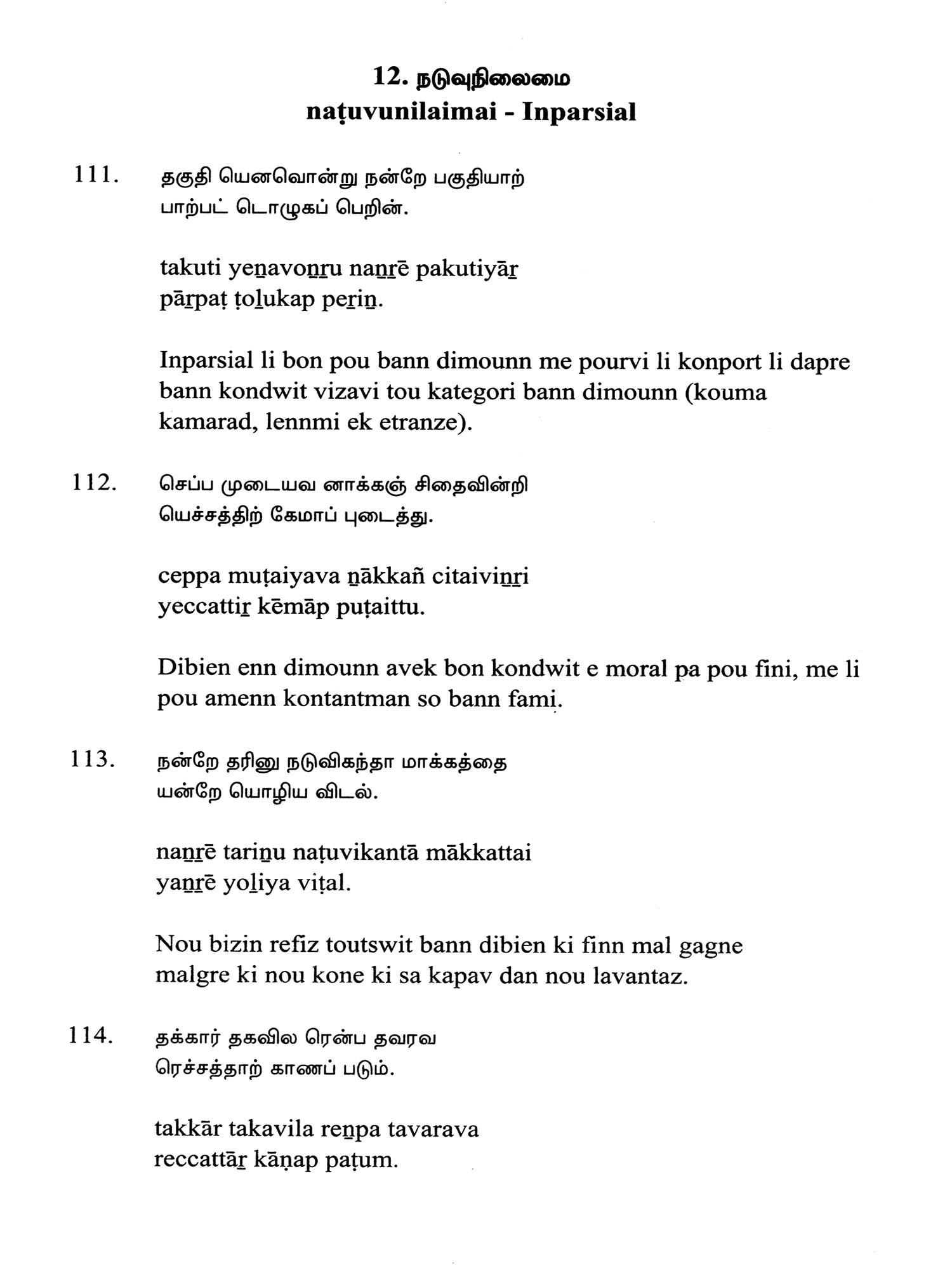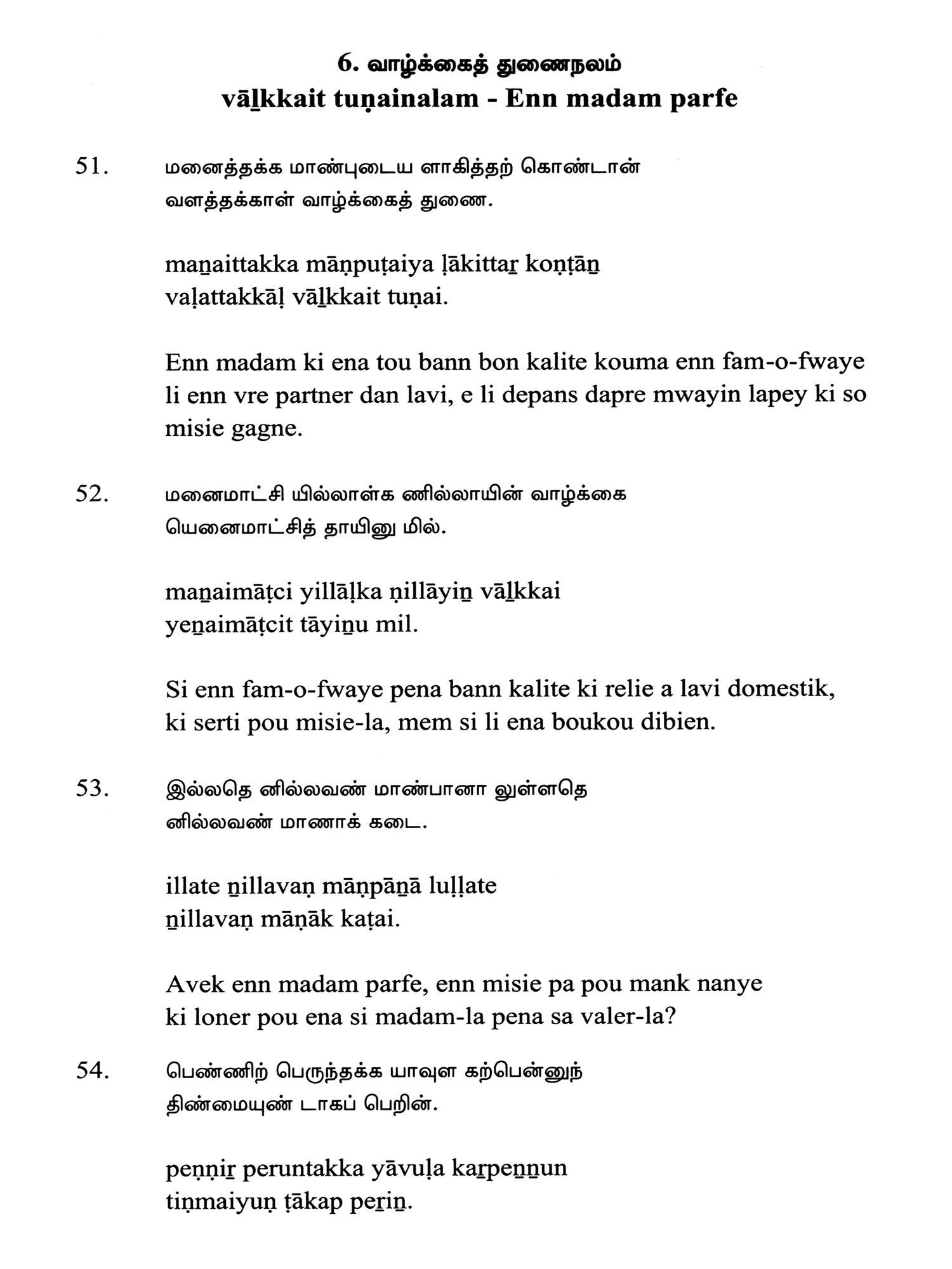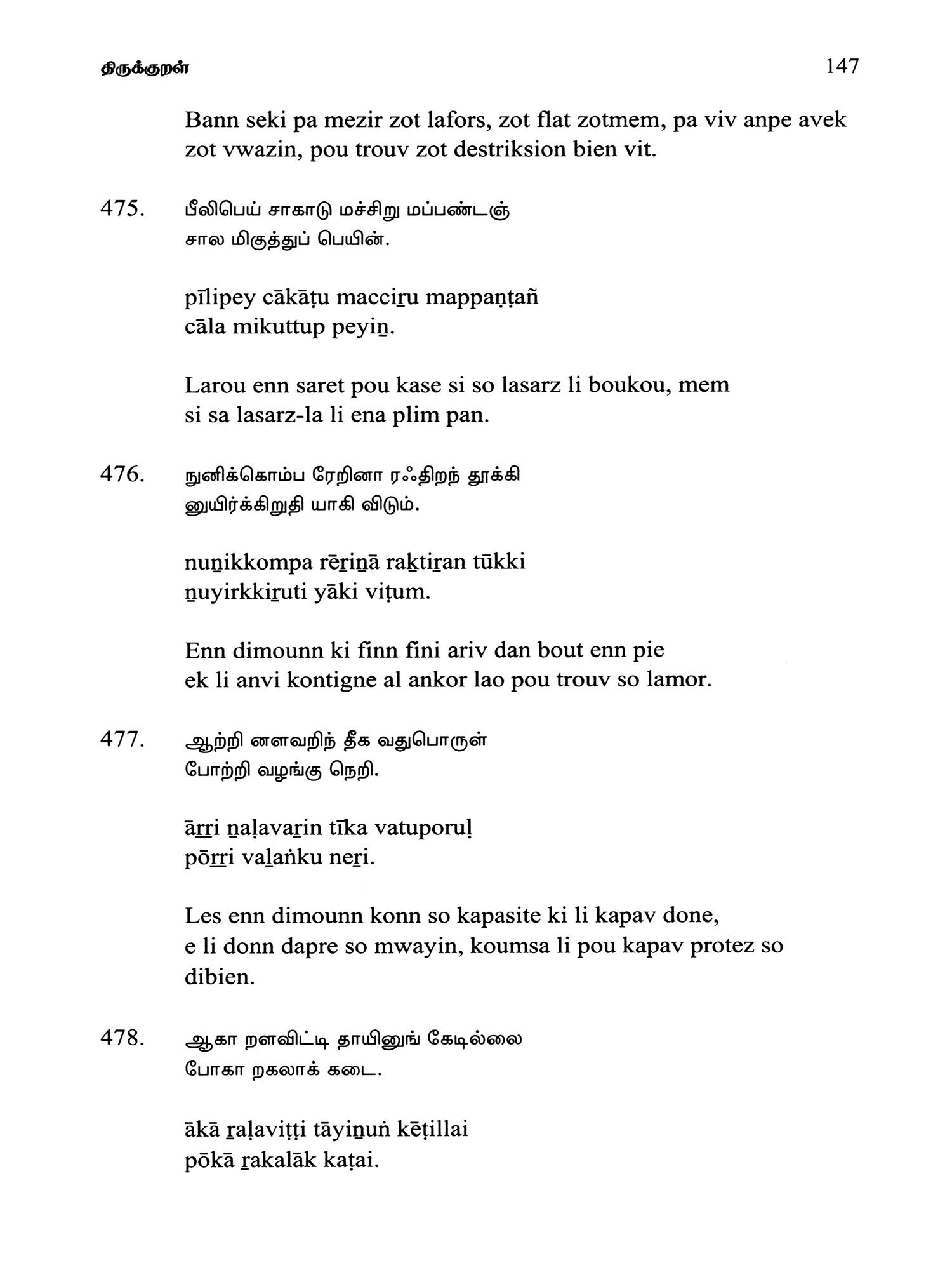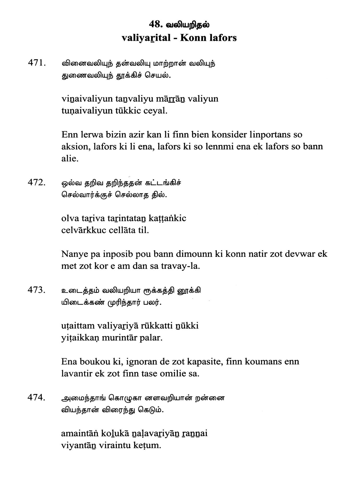 Language: Tamil Text with Transliteration and KREOL (Morisien) Translation