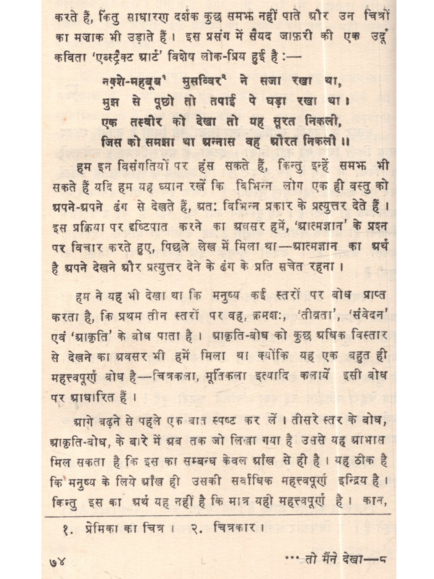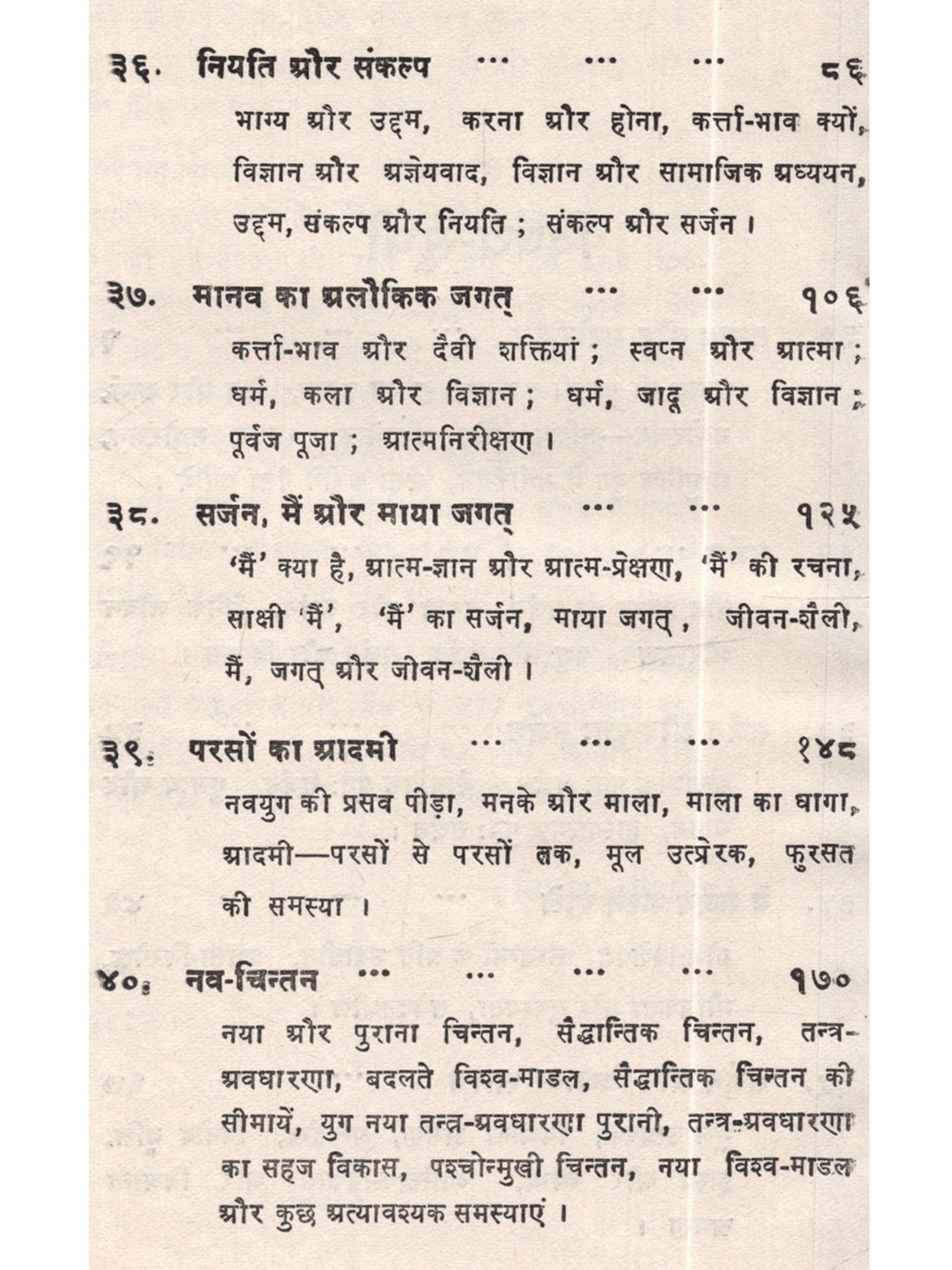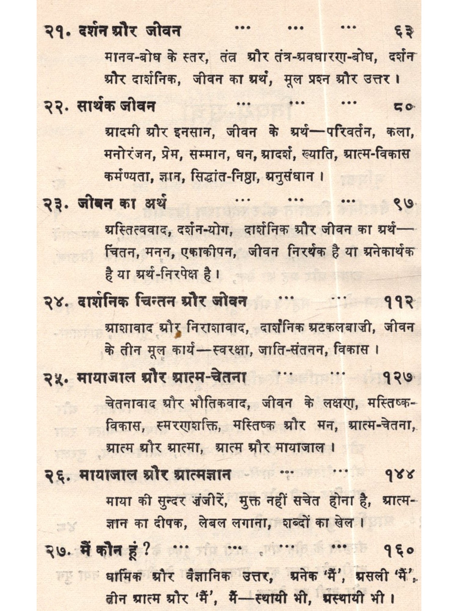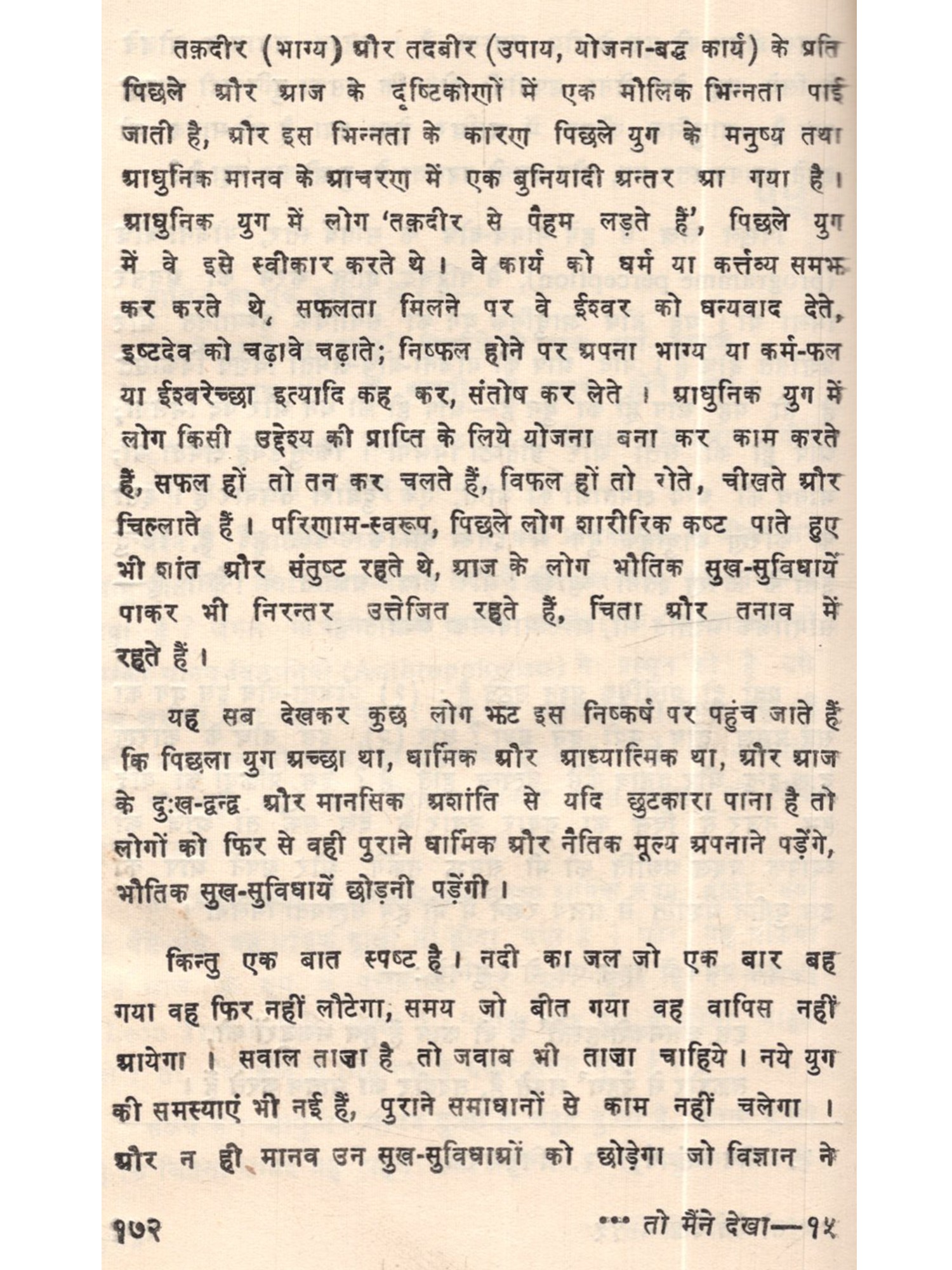 धाप को यदि ये लेख पसन्द न आयें तो दोष डा० वेदप्रकाश जी को दीजियेगा। त्रुटियां तो मेरे ही लेखन में हैं, किन्तु युग की मांग यही है कि अपनी भूल के लिये उत्तरदायी किसी और को ठहराया जाये ! फिर यहां तो कारण भी मौजूद है। अपराधी से भी अधिक दोषी उसे उकसाने वाले को माना जाता है. और तथ्य यही है कि वेदप्रकाश जी के स्नेहपूर्ण अाग्रह ने ही ये लेख लिखवाये हैं। मुनीर न्याजी की जिस गजल से इस लेखमाला का शीर्षक लिया गया है उस का मक्तः (अन्तिम शे'र) है:- एक और दरिया का सामना था 'मुनीर' मुझ को मैं एक दरिया के पार उतरा तो मैंने देखा । उन दिनों मेरी मनःस्थिति कुछ इस शे'र के हो अनुरूप थी। मेरी पिछली दो पुस्तकें ('परिवेश, मन और साहित्य'; तथा 'भारतेन्दु और आधुनिकता') लिखी जा चुकी थीं, प्रौर जिस बौद्धिक जिज्ञासा ने इन अध्ययनों को प्रेरित किया था वह शांत हो गई थी। बौद्धिक प्रश्नों के एक दरिया के पार उतर कर मैं देख रहा था कि अस्तित्वात्मक (existential) प्रश्नों का एक और दरिया अब मेरे सामने था। बाह्य जगत् की समस्याओं की अपेक्षा अब अन्तर्जगत् की गुत्थियां अधिक रुचिकर प्रतीत हो रही थीं। समाज में क्या हो रहा है, जो हो रहा है, वह क्यों और कैसे हो रहा है, इत्यादि प्रश्नों के उत्तर खोजता हुआ पहले मैं ज्ञान-विज्ञान के विभिन्न प्रदेशों में घूमता रहता था । किन्तु अब 'अदम' का यह शे'र अधिक सार्थक प्रतीत होने लगा था: दूसरों से बहुत आसान है मिलना साक़ी अपनी हस्ती से मुलाक़ात बड़ी मुश्किल है। 'विश्वज्योति' के सम्पादक बन कर डा० वेदप्रकाश जी इन्हीं दिनों यहां धाये। उन्हें पता नहीं क्या सूझी कि अपनी पत्रिका के लिये लिखने को मुझे कह बैठे- उन्हें भी क्या पता था कि यह भला. मानुस गले ही पड़ जायेगा ! तो उन के आग्रह का परिणाम यह हुआ। कि 'अपनी हस्ती से मुलाक़ात' नामक लेख-श्रृंखला का सूत्रपात हो गया। प्रायः चार वर्षों तक यह मुलाकात होती रही और बड़े पैये के साथ वे इस मुलाकात का ब्योरा 'विश्वज्योति' में छापते रहे। और तब मुझे लगा कि श्रान्तरिक छानबीन का यह दौर भी समाप्त हो गया है। किन्तु यात्रा रुकी नहीं:- जुस्तजू हो तो सफ़र ख़त्म कहां होता है, यूं तो हर मोड़ पे मंजिल का गुमां होता है। - 'ताबां' को महत्त्व दे पहले 'जग-दर्शन' और फिर 'ग्रात्म-दर्शन' के प्रश्नों चुकने के बाद मैंने देखा कि नये प्रश्नों का एक और दरिया मेरे सामने लहरा रहा है। अब जो मुख्य समस्या मेरे सामने थी वह कुछ इस प्रकार की थी: मनुष्य सदा से दुःख और द्वन्द्व का शिकार रहा है, बाज भी है। दुःख और अशांति से मुक्ति पाने के लिये सन्त, महात्मा और आध्यात्मिक गुरु उपदेश देते रहे हैं, आत्म-रूपांतरण की बात करते रहे हैं। उनकी बातें सार्थक भी हैं। व्यक्ति उनके बताये रास्ते पर चले तो वह सुख और शांति पा लेता है, यह भी ठीक है। फिर