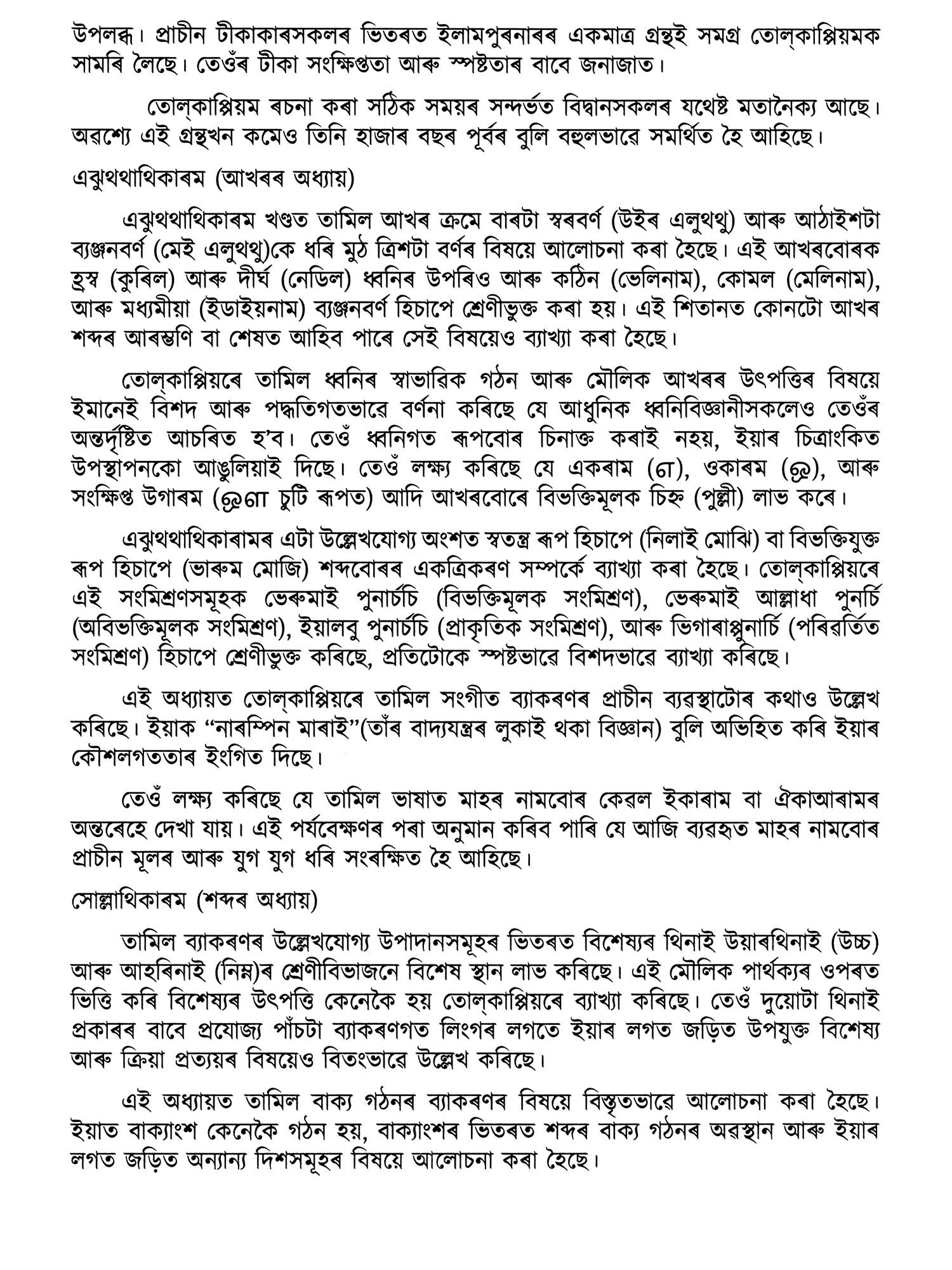 Tolkappiyam in Tamil, dated not later than the third century before the advent of the Common Era, is, arguably, the earliest complete work of linguistics in the ancient classical traditions of the world. It is complete in the sense that it encompasses both the written and the spoken languages, and it is a grammar of graphology, phonology, syntax, semantics, poetics, prosody and rhetoric. As such, it marks sui generis, towering presence without a comparable work in any of the primary classical languages of the world in range and perspective.