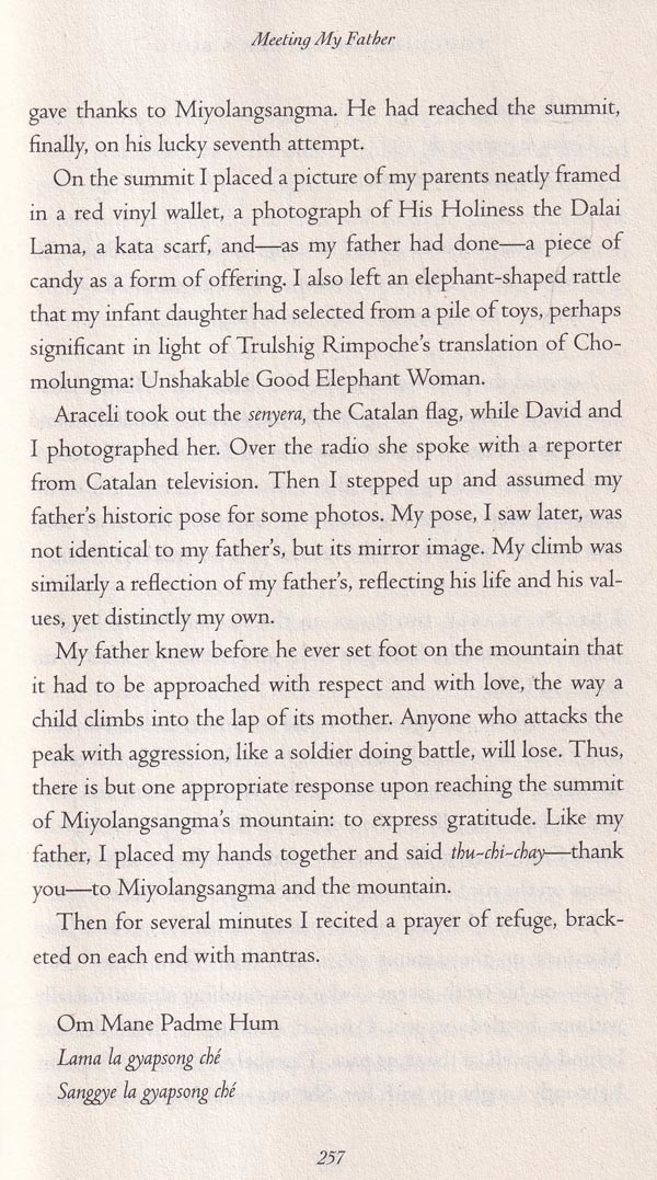 Jamling Tenzing Norgay is the son of Tenzing Norgay, who, with Sir Edmund Hillary, was the first man to reach the summit of Mount Everest, or Jomolungma, as we call it in Tibetan. In this book he tells the story of his participation in the successful ascent of Everest in 1996. Although generally Tibetans do not attempt to scale the peaks of mountains, being content to cross the passes that characterize journeys in Tibet, Jamling Tenzing Norgay takes a very Tibetan view of the enterprise-he regards it as a pilgrimage. It is a pilgrimage on the one hand in tribute to his renowned and courageous father, but also because of the traditional Tibetan sense that such mountains are the abodes of divine beings.