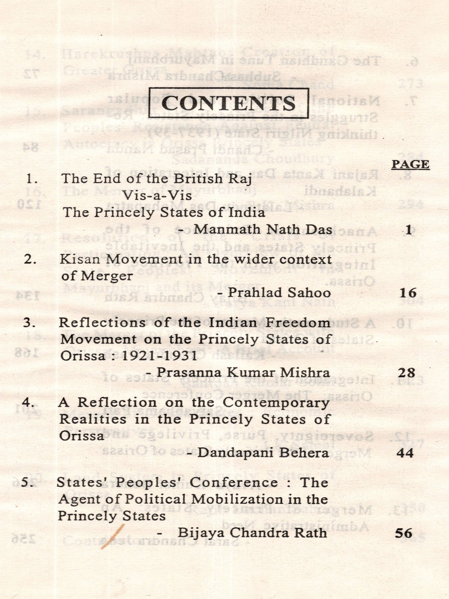 Princes were one of the prime movers at this point of time and a large number of articles are on their hopes, aspirations, efforts to organise themselves for their political future etc. Some articles go in to the subjects of administrative mechanism in the Feudatory States as well as tenurial systems in the Garjat areas. A better appreciation of these aspects shall only go towards enrichment of our understanding of Orissa's history.